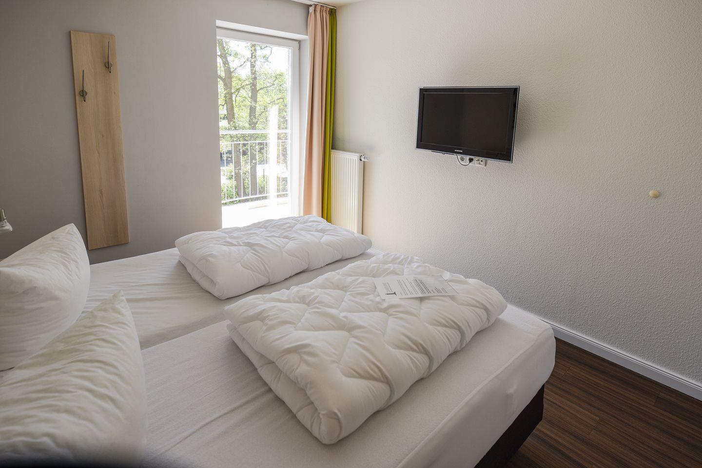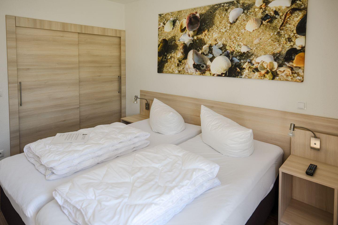 Die Ferienwohnung in Haus 2 in der 1. Etage ist komfortabel ausgestattet mit 2 Schlafzimmern mit Doppelbett und LCD-TV, 1 Badezimmer mit Dusche, WC und eigener Waschmaschine sowie ein separates Gäste-WC. Außerdem verfügt die Ferienwohnung über einen großen Balkon mit südwestlicher Ausrichtung. Ein Stellplatz in der Tiefgarage ist für Sie reserviert. Hier finden Sie auch einen abschließbaren Fahrradraum für die Sicherung Ihrer Räder.