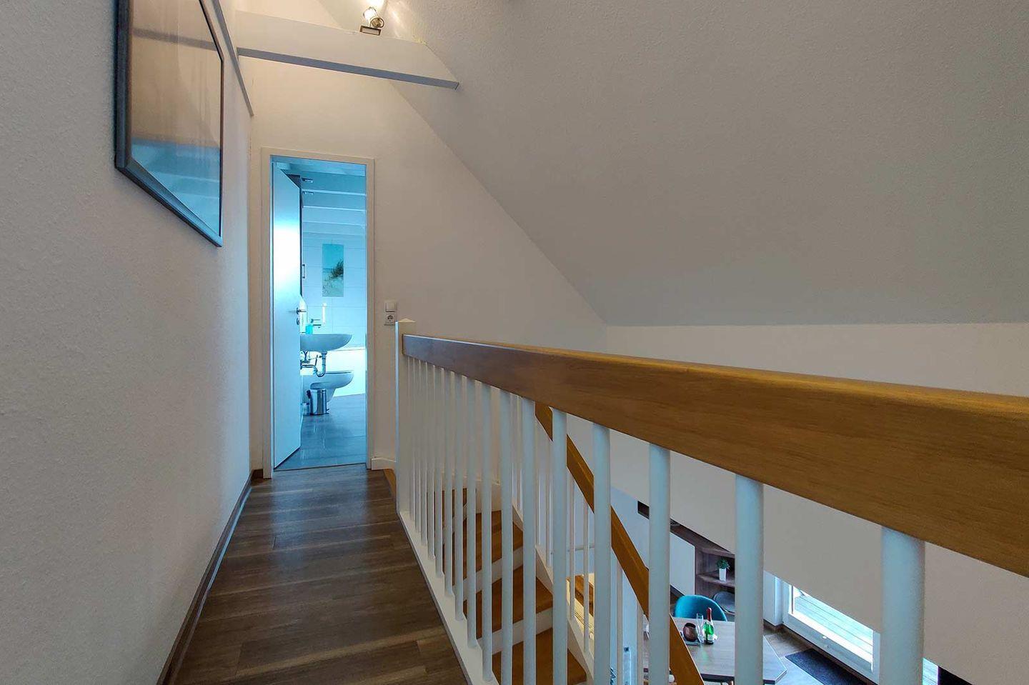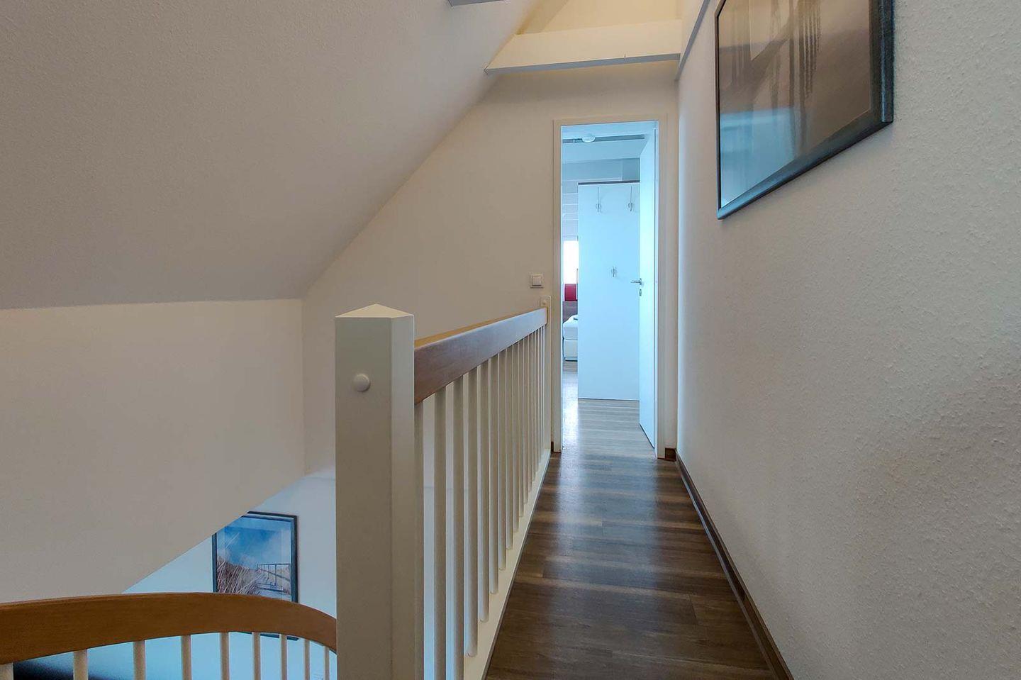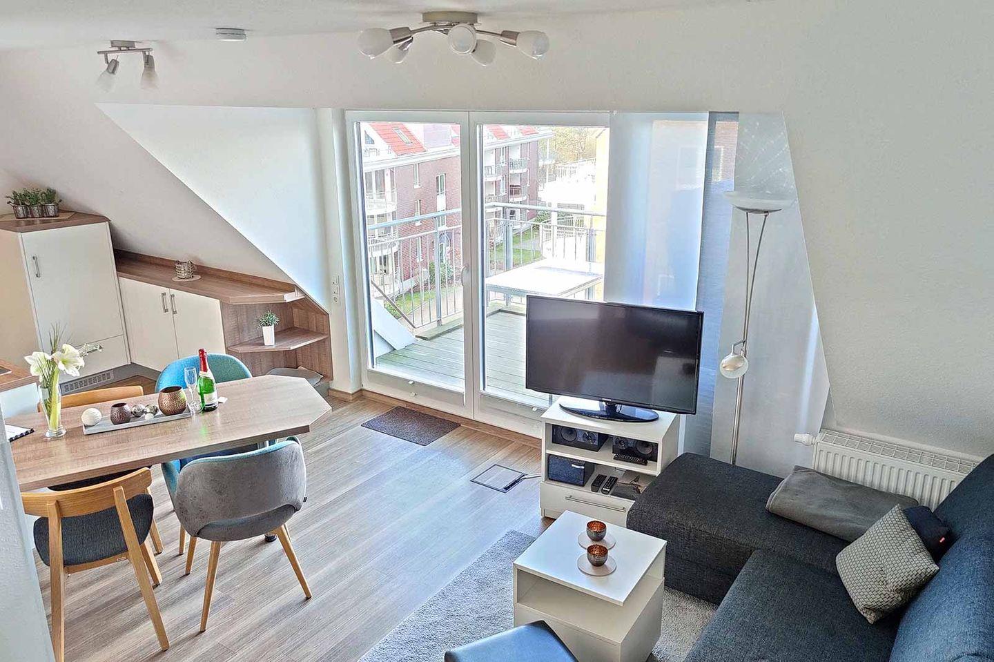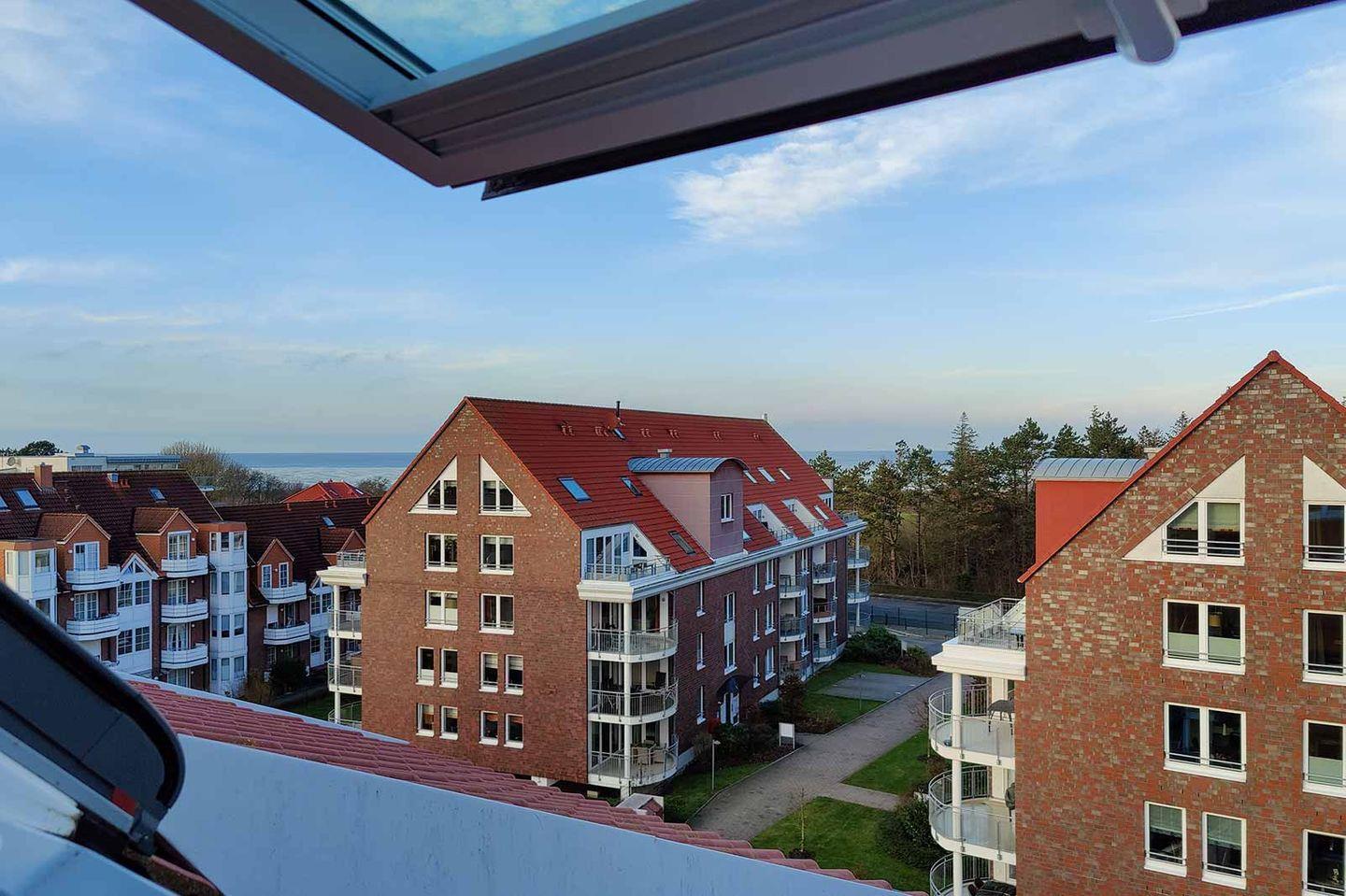 Die Residenz Hohe Lith liegt in unmittelbarer Strandnähe direkt hinter dem Deich in einer verkehrsberuhigten Straße in Cuxhaven-Duhnen. Die Maisonette-Wohnung in Haus 4 in der 5. Etage über zwei Ebenen mit Blick auf die Nordsee ist modern und komfortabel ausgestattet. Auf etwa 75 m² bietet sie Platz für bis zu sechs Personen. Auf der unteren Ebene verfügt das Appartement über einen offenen Wohn-/Essbereich mit voll ausgestatteter Küchenzeile und ein Schlafzimmer mit Doppelbett sowie direktem Zugang zum Badezimmer. Auch der Balkon mit Teil-Seesicht ist von der unteren Wohnebene zu erreichen. Direkt unter dem Dach befindet sich die zweite Ebene mit einem zweiten Schlafzimmer, welches über teilbare Betten verfügt. Auch ein zweites Badezimmer mit Whirlpool und Blick auf die Nordsee befindet sich in der oberen Ebene. Ein Tiefgaragenplatz ist für Sie reserviert und der abschließbare Fahrradraum in der Tiefgarage sichert Ihre Fahrräder.
