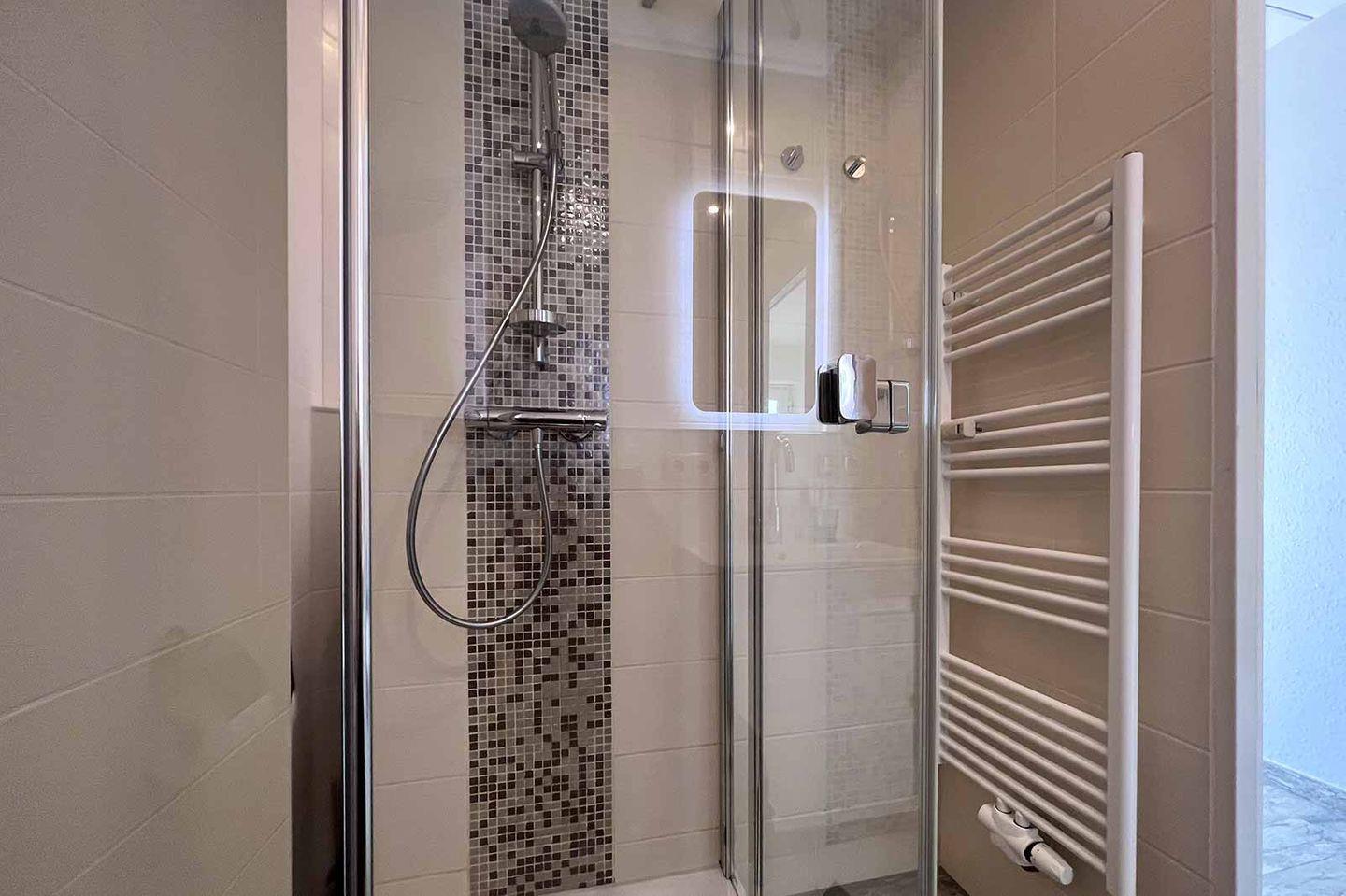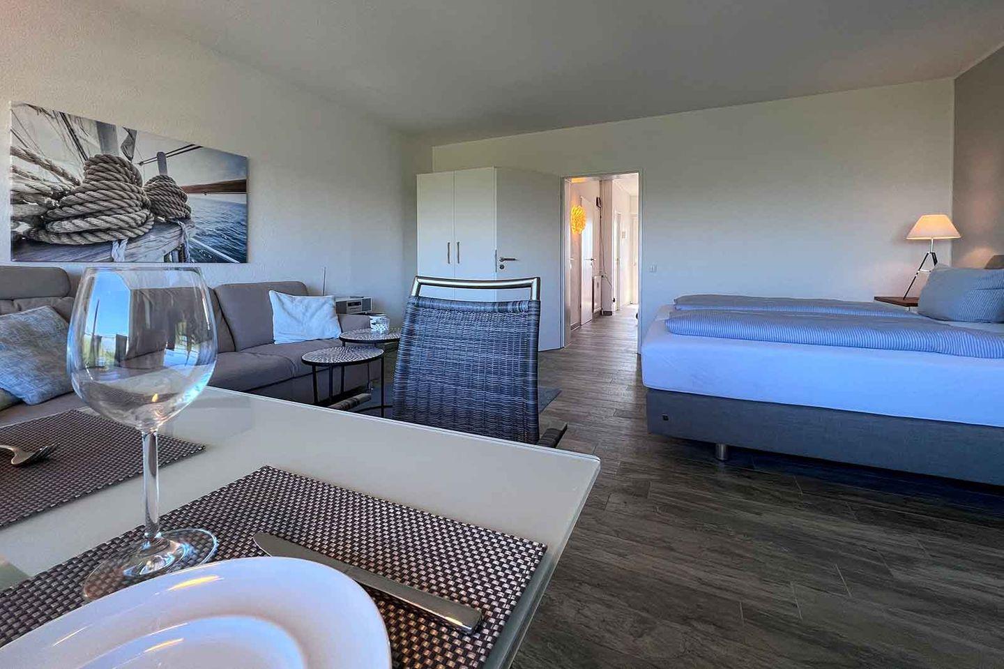 Das neue Boxspringbett (180 x 200 cm) und das abgestimmte Farbkonzept im Raum sorgen für die richtige Wohlfühlatmosphäre. Vom Essplatz aus können Sie die schöne Aussicht genießen. Die gemütliche Couch lädt zu entspannten Lese- und Fernsehabenden ein. In der separaten, modernen Küche ist alles vorhanden, was das Herz im Namen des Magen begehrt. Auch das Badezimmer mit ebenerdiger Dusche ist optimal ausgestattet. In der Wohnung nutzen Sie WLAN (mit eigenem Router!) kostenfrei.
