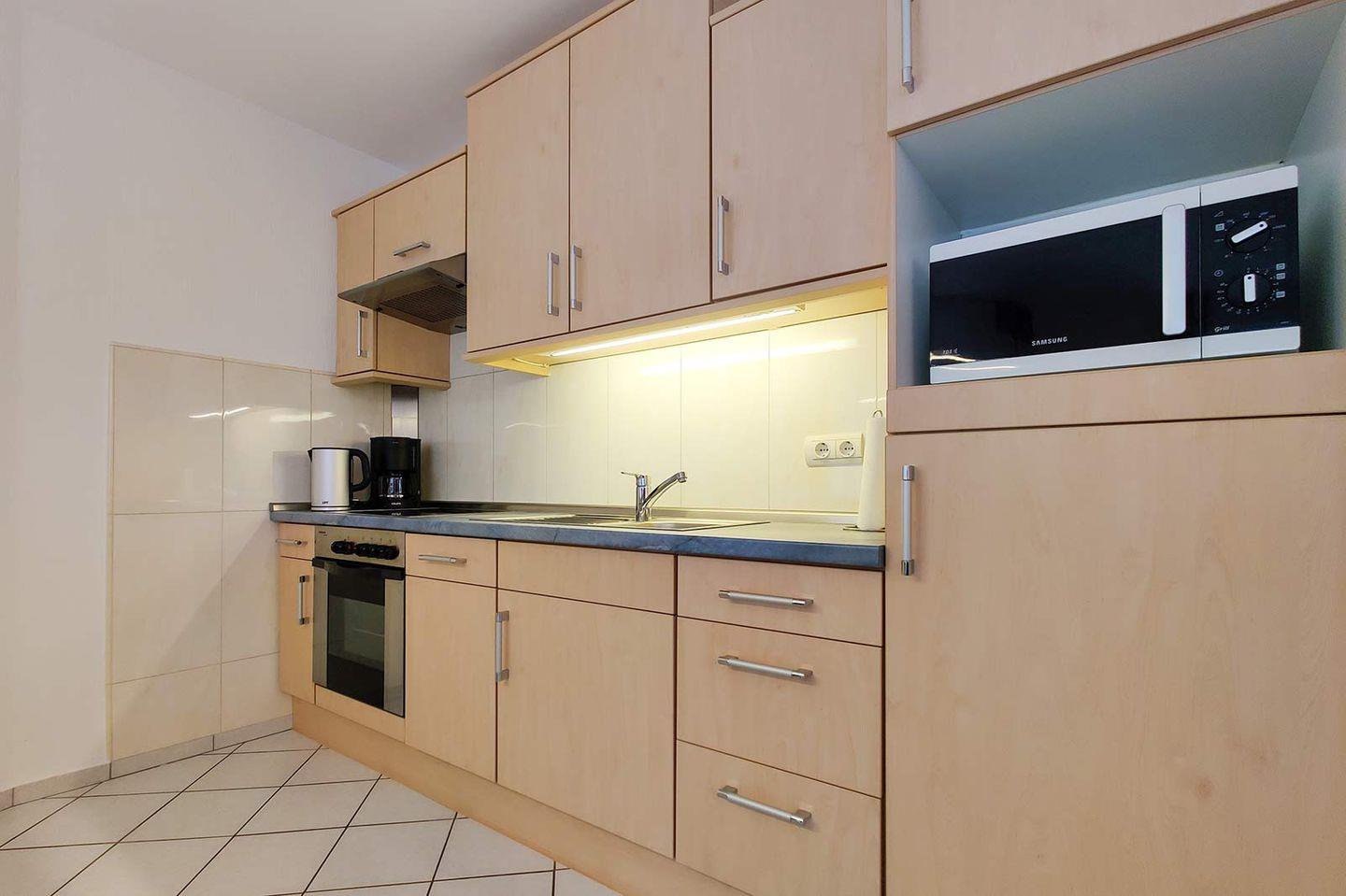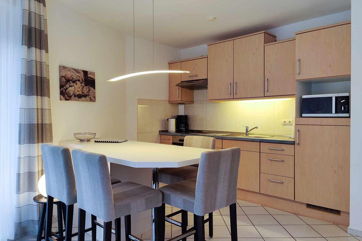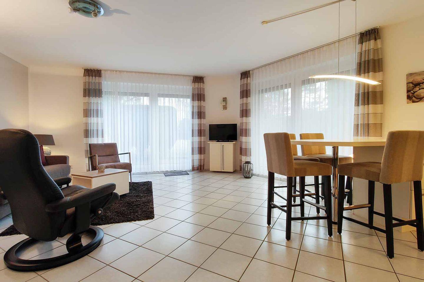 In der geschmackvoll eingerichteten Wohnung können Sie wunderbar entspannen und auf der möblierten Terrasse die Nordseeluft genießen. Die offene Küche im Wohnraum ist geräumig und großzügig ausgestattet. Im Schlafzimmer finden Sie ein bequemes Doppelbett. Für alle, die es beim Schlafen gerne ganz dunkel mögen: Alle Fenster sind mit Außenrolläden ausgestattet. Auf der Handtuchheizung im Bad werden Ihre Handtücher bis zum nächsten Strandbesuch in Cuxhaven schnell wieder trocken.