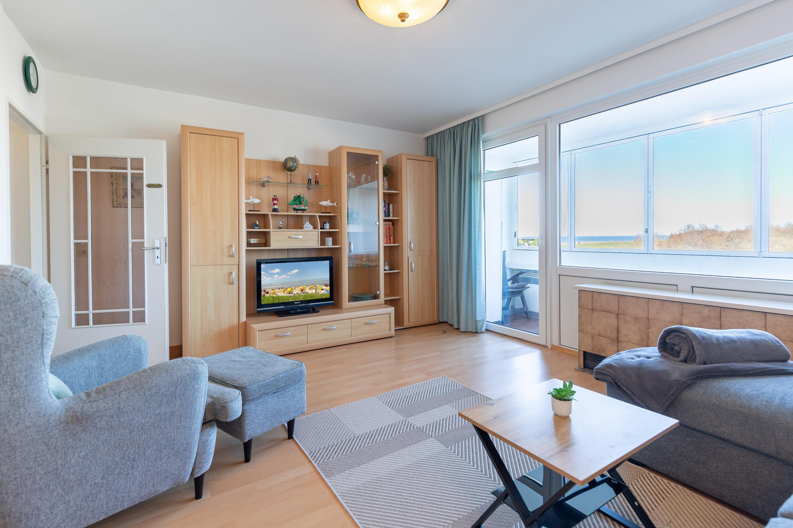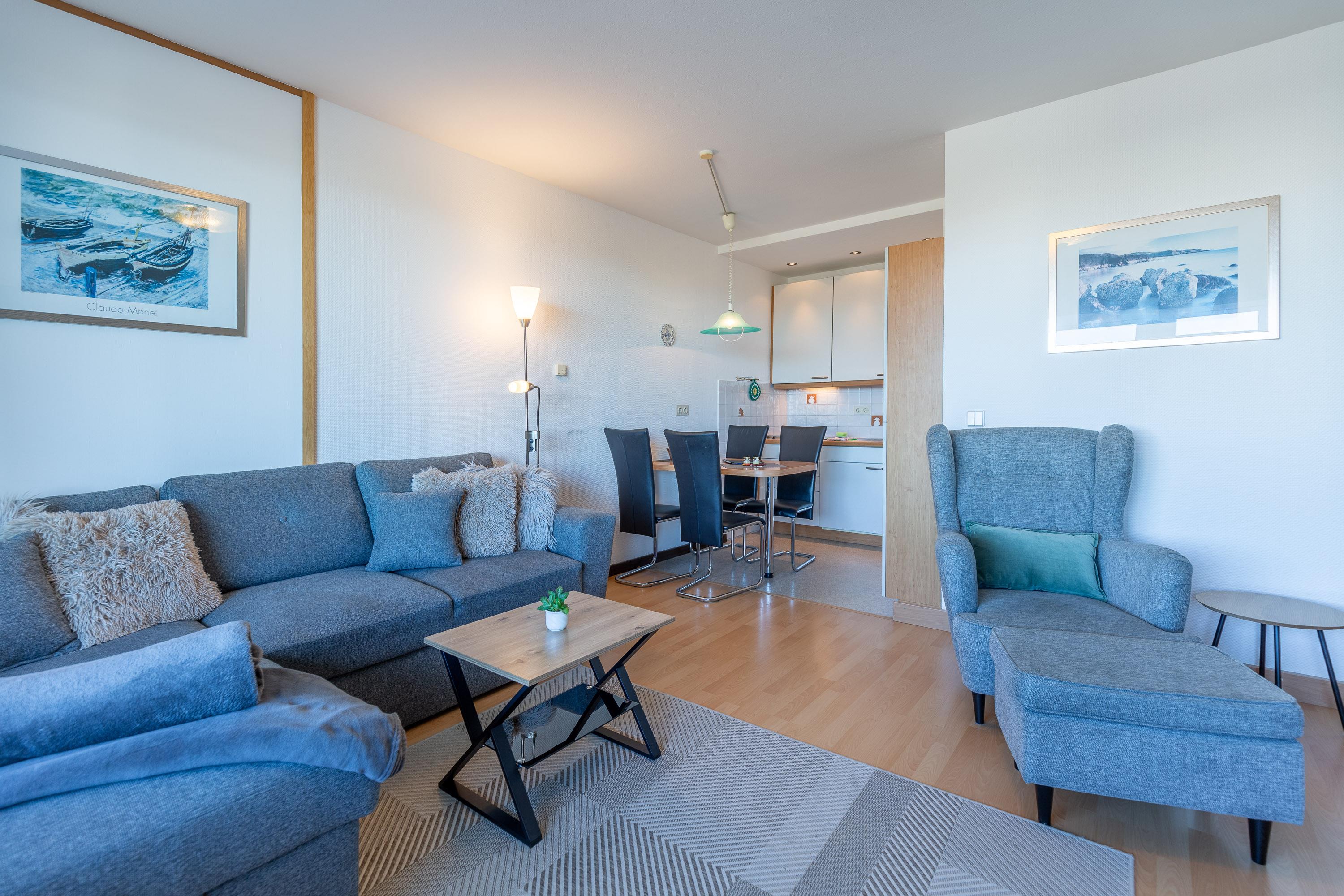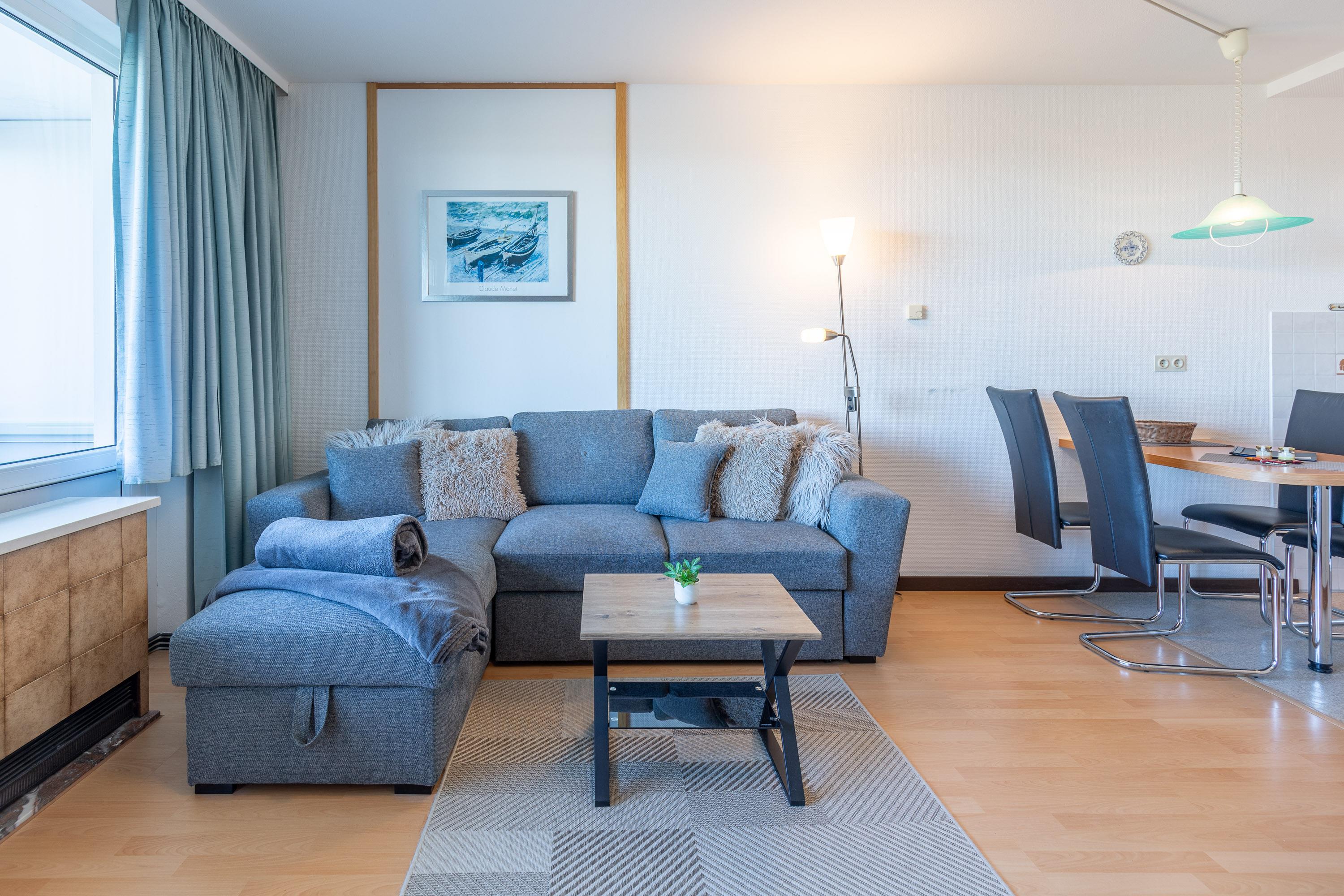 Perfekt für erholsame Tage an der Nordsee. Nach einem erlebnisreichen Tag lädt das Sofa zum Verweilen ein. Dank LCD-Fernseher müssen Sie auch im Urlaub nicht auf Ihre Lieblingsserie verzichten. Kostenloses W-LAN gewährleistet, dass Sie lokale Nachrichten lesen und Urlaubsfotos mit Freunden teilen können. Eine Küche mit 4-Zonen-Cerankochfeld, Mikrowelle sowie Kühlschrank mit Gefrierfach ist im Wohnbereich integriert. Auch vom möblierten Balkon genießen Sie den Blick auf den Weltschifffahrtsweg.