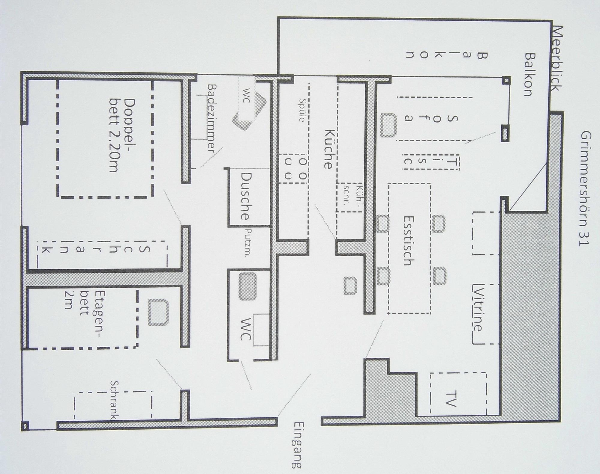 Die separate Küche ist mit einem Backofen, einem Ceranfeld mit 4-Kochstellen, einem Geschirrspüler, einer Mikrowelle, einer Kaffeemaschine, sowie einem Kühlschrank mit Gefrierfach ausgestattet. Das erste Schlafzimmer verfügt über ein komfortables Doppelbett in Überlänge und Komforthöhe (2x90x220). Das zweite Schlafzimmer ist mit einem Etagenbett (2x90x200) ausgestattet. Die separaten Schlafzimmer gewährleisten einen erholsamen Schlaf. Neben einem modernen Bad mit WC und Dusche verfügt Ferienwohnung Grimmershörn 31 über ein zusätzliches Gäste-WC.