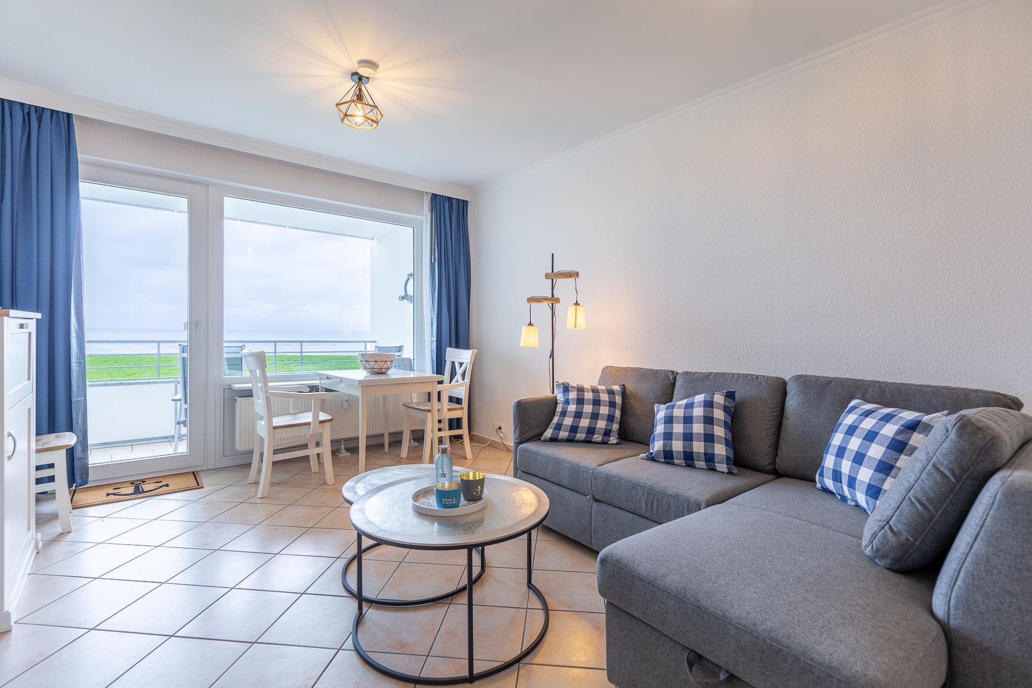 Der Flachbildfernseher im Wohnbereich gewährleistet, dass Sie auch im Urlaub nicht auf Ihre Lieblingsserie verzichten müssen. Die Küchenzeile ist mit einem Geschirrspüler, 2-Plattenherd, Kühlschrank und allen notwendigen Küchenutensilien ausgestattet. Ein separates Schlafzimmer mit komfortablen Betten gewährleistet einen erholsamen Schlaf. Elektrische Außenjalousien sorgen dafür, dass Sie nicht von der Morgensonne geweckt werden. Das Bad ist mit Dusche und WC ausgestattet. Zudem können Sie auf dem Balkon die frische Nordseeluft spüren, den Ausblick genießen und die Zeit vergessen. Zur Ferienwohnung gehört eine Garage (2,06 m Höhe, 2,20 m Breite (Garagentor) und ca. 5,00 m Länge).