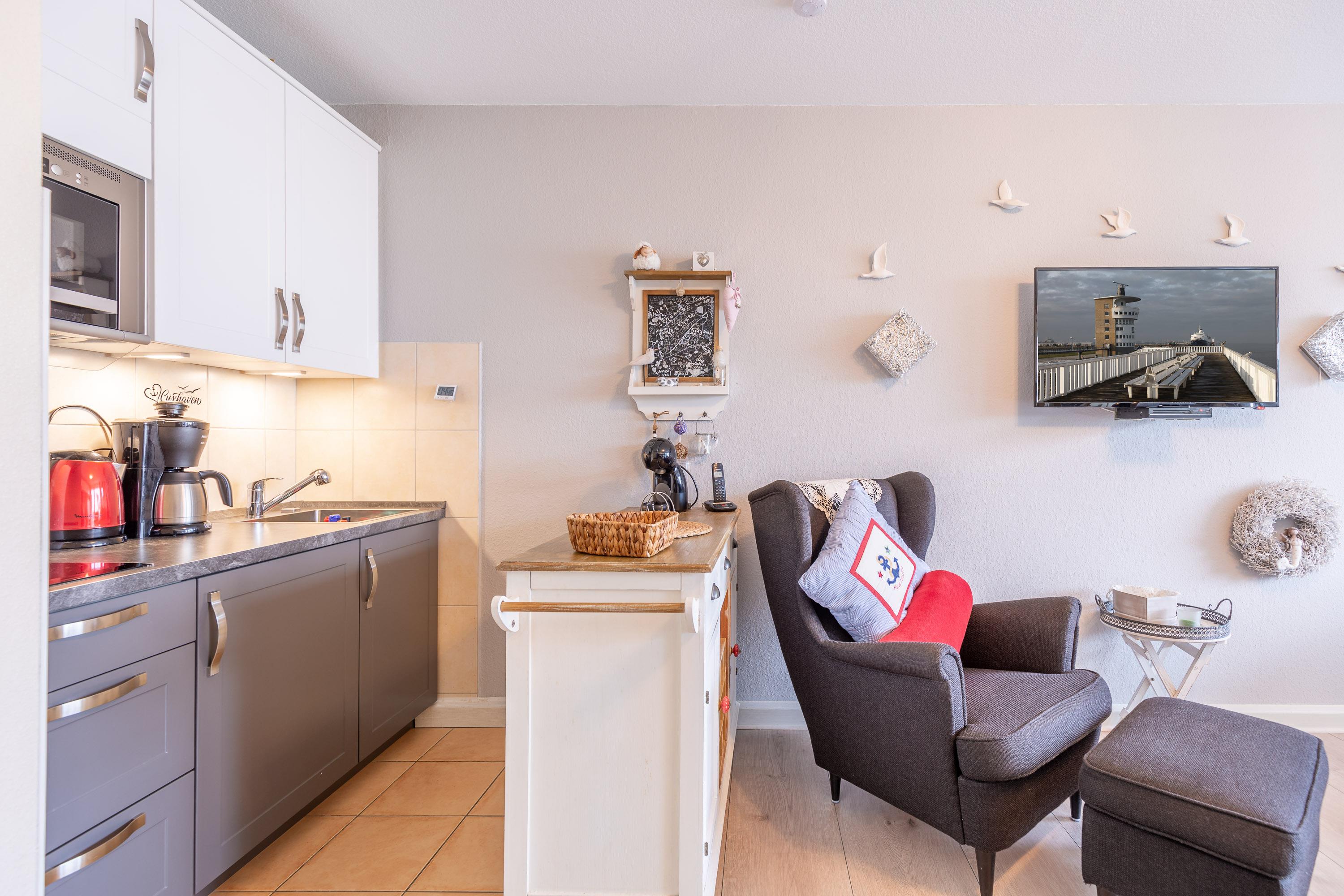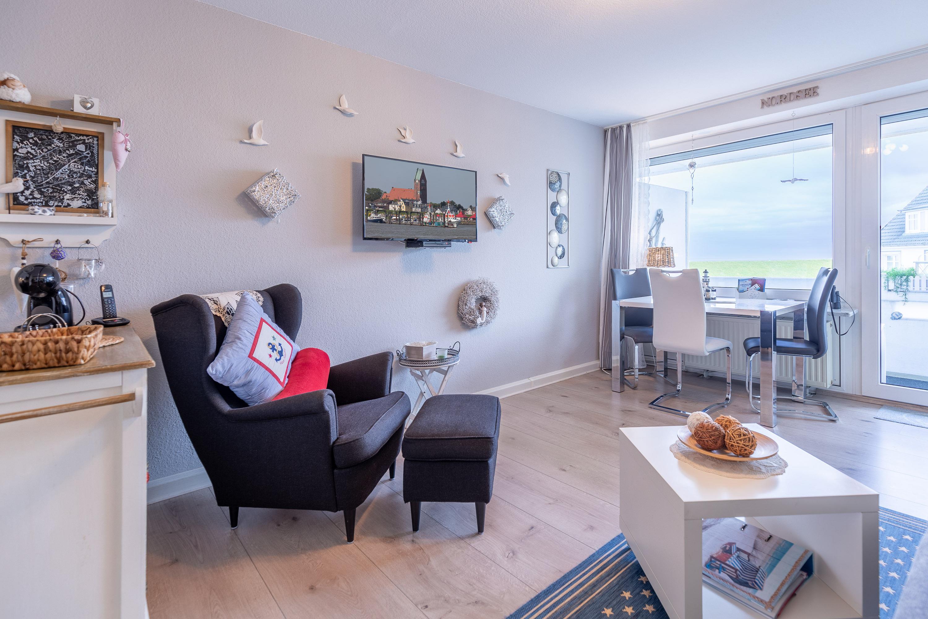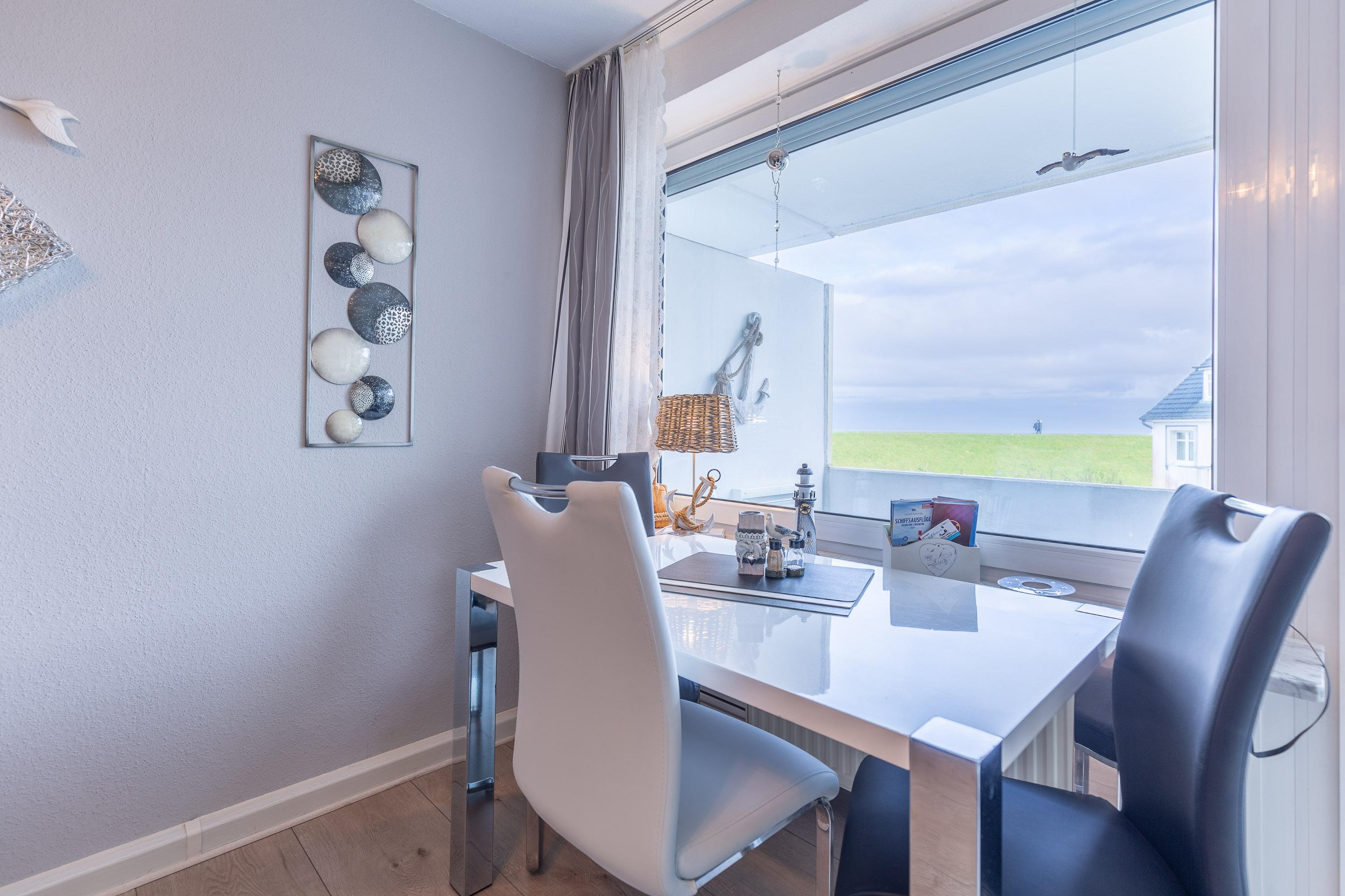 Ankommen und sich wohlfühlen. Nur einen Steinwurf vom Deich entfernt erleben Sie Cuxhaven mit allen Sinnen: spüren Sie die frische Meeresbrise, hören Sie das Rauschen der Wellen und beobachten Sie die vorbeiziehenden Ozeanriesen direkt vom Fenster aus. Unsere 35 m² große Ferienwohnung bietet einen abwechslungsreichen Ausblick auf den Weltschifffahrtsweg. Langeweile kommt hier garantiert nicht auf. Schon beim Frühstück am Esstisch mit Blick auf die Elbe startet Ihr Urlaubstag mit einem besonderen Highlight.