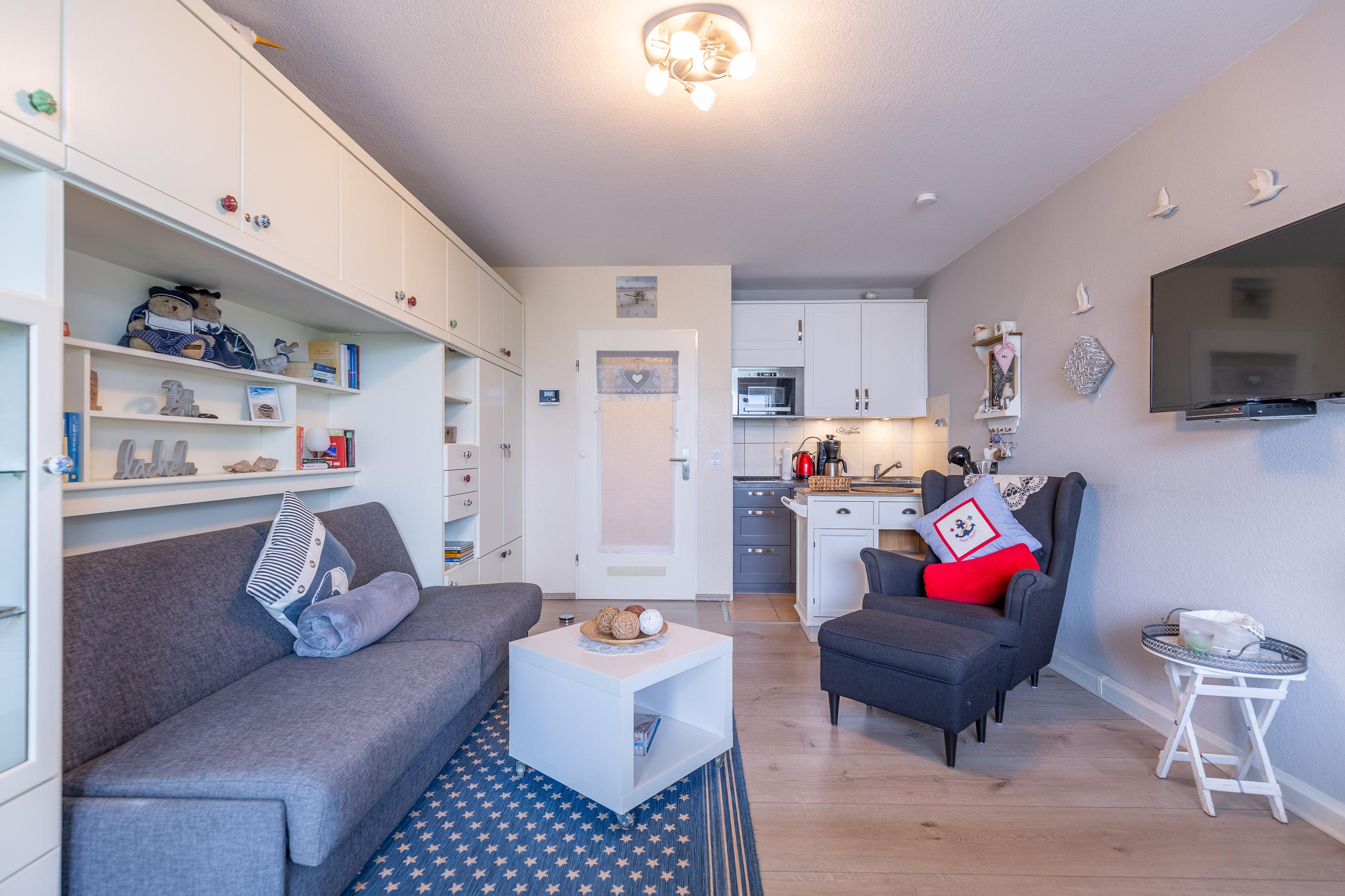 Dank kostenfreiem WLAN können Sie Ihre Urlaubseindrücke sofort mit Familie und Freunden teilen. Die Küchenzeile im Wohnbereich ist funktional ausgestattet, inklusive Mikrowelle mit Crisp-Funktion. So gelingen Ihnen am Morgen knusprige Brötchen und am Abend eine goldbraun gebackene Pizza ganz einfach. Der kombinierte Wohn- und Schlafbereich verfügt über ein bequemes Schlafsofa. Zusätzlich bietet ein Einzelbett im Vorraum auch die Möglichkeit zum getrennten Schlafen.