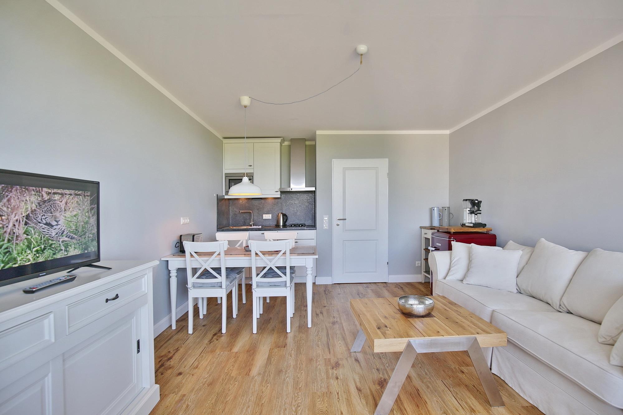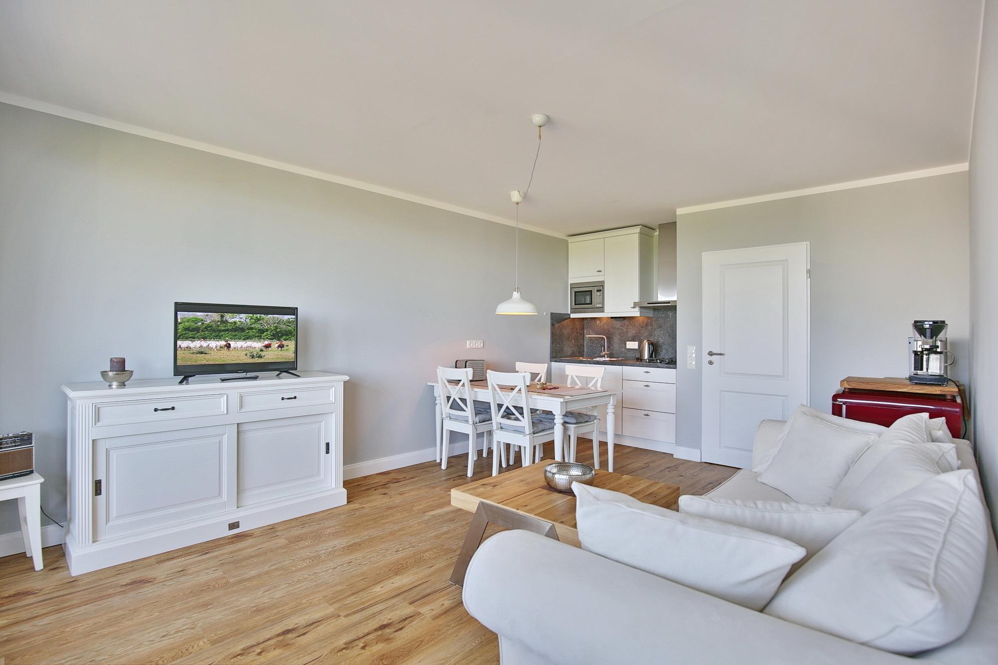 Der kombinierte Wohn-/Essbereich bietet eine kleine Küchenzeile mit einem 2-Platten Gasherd, einem Geschirrspüler und einem Kühlschrank mit Gefrierfach. Auf dem Sofa können Sie sich entspannt zurücklehnen und den Meerblick genießen. Für Unterhaltung sorgt neben dem abwechslungsreichen Ausblick auch ein Flachbildfernseher. Der Balkon ist bei gutem Wetter eine wahre Freiluft-Nordseeloge und ist sowohl vom Wohn- als auch vom Schlafzimmer begehbar. Selbstverständlich genießen Sie auch vom möblierten Balkon einen traumhaften Meerblick, der mehr als beeindruckt. Das modern sanierte Bad mit Dusche und WC verfügt über ein Fenster zum Belüften. Der Wohnung ist ein PKW-Stellplatz zugeordnet. Ihre Ferienwohnung in der 2. Etage erreichen Sie bequem mit dem Aufzug.
