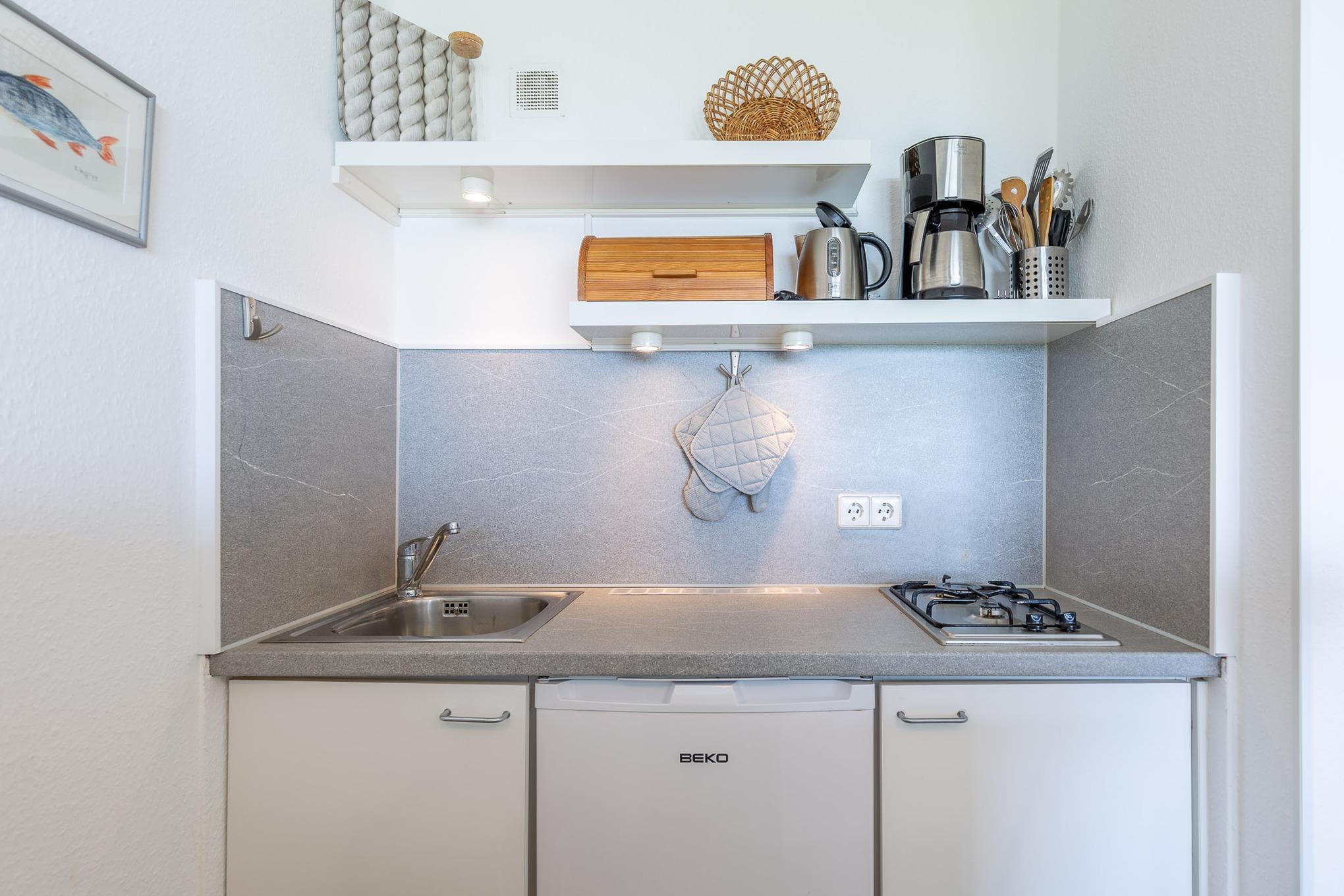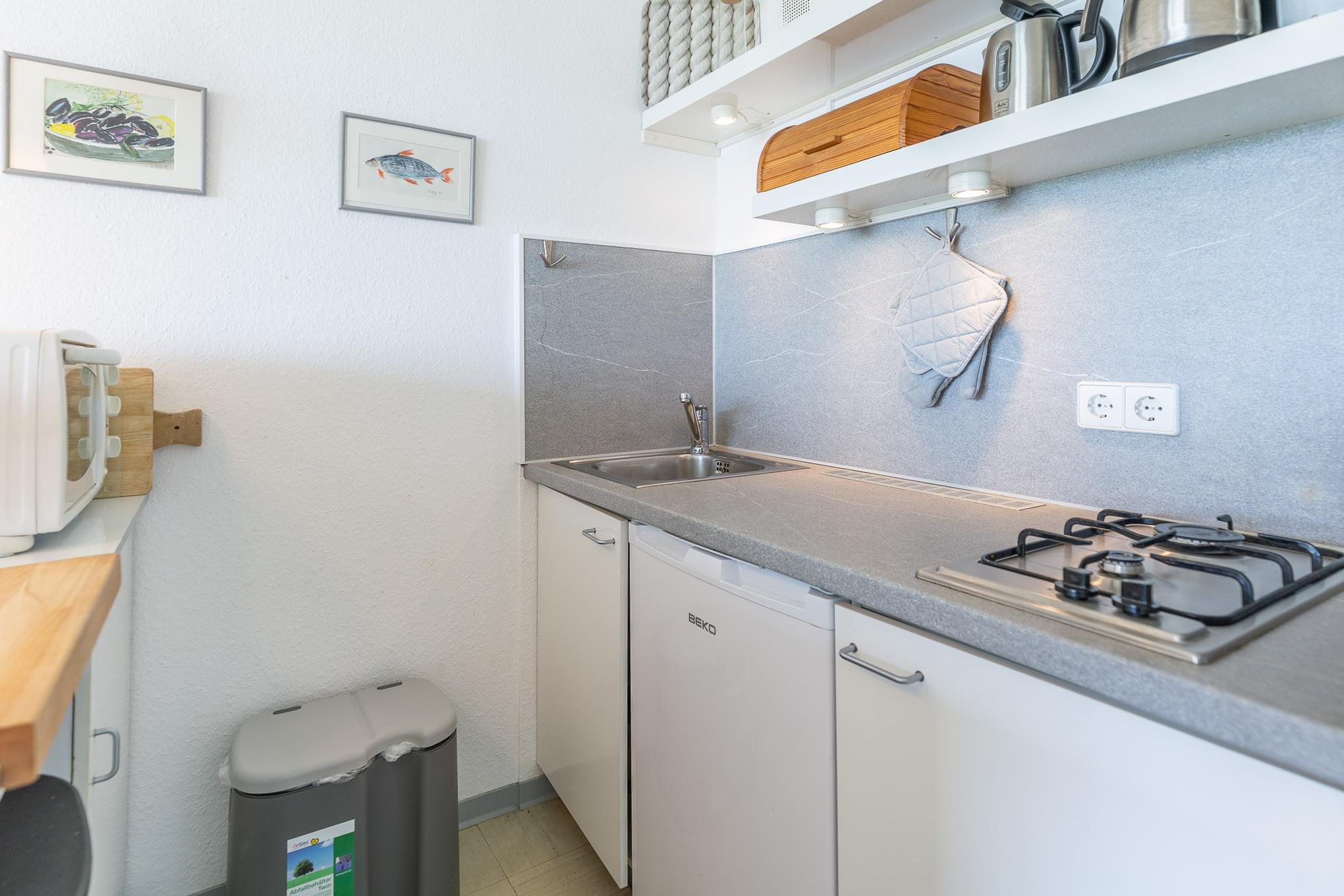 Die Ferienwohnung Nautic 211 bietet auf 45 m² genügend Platz für bis zu 3 Personen. Die Wohnung befindet sich in der 2. Etage und ist über einen Aufzug leicht zu erreichen. Für beste Unterhaltung sorgen kostenloses WLAN und ein großer Smart-TV. Das separate Schlafzimmer mit Doppelbett gewährleistet, dass Sie sich auch im Schlaf erholen. Ein Einzelbett in der Diele bietet eine weitere Schlafmöglichkeit. Die offene Küche mit Tresen, Kühlschrank sowie Gasherd ist mit allen Küchenutensilien ausgestattet, die Sie in Ihrem Urlaub erwarten.