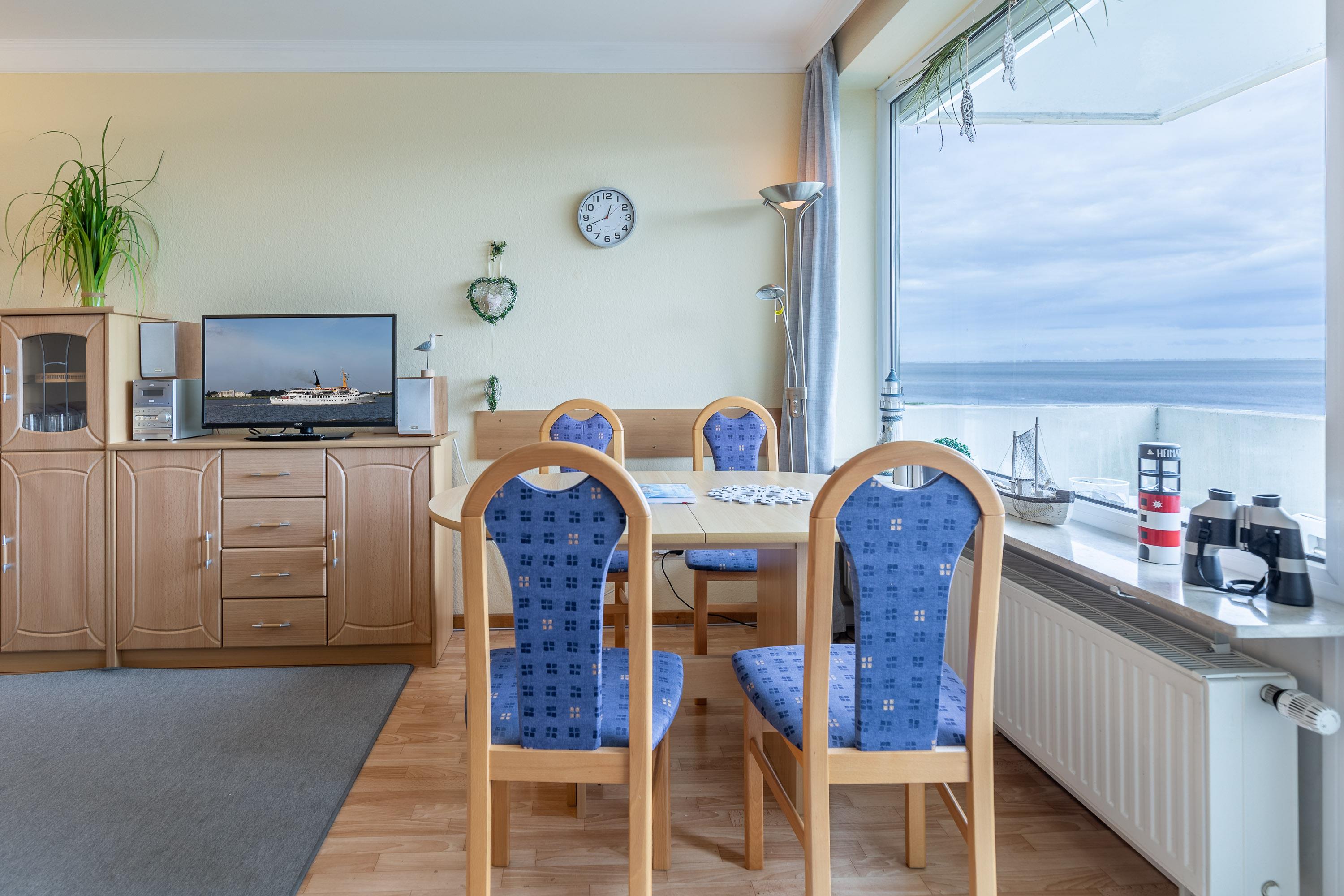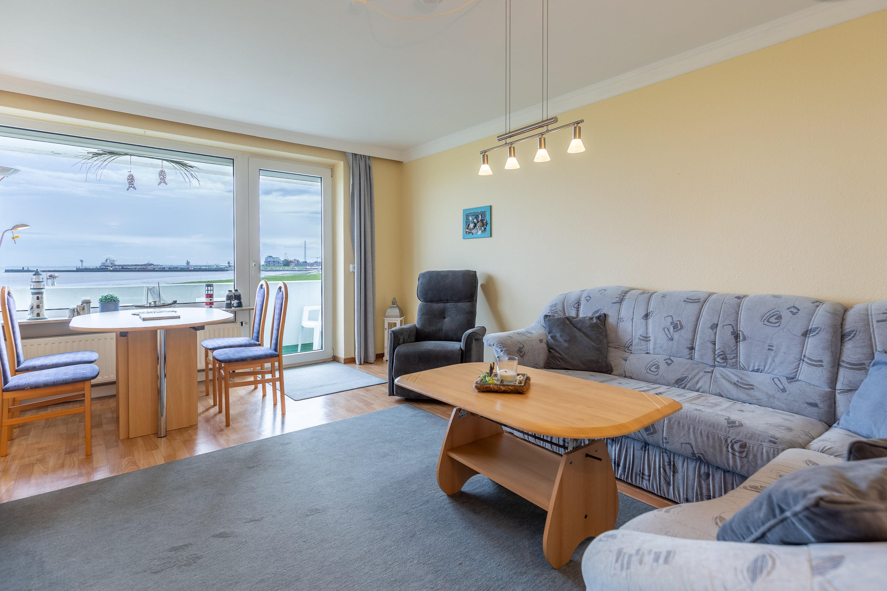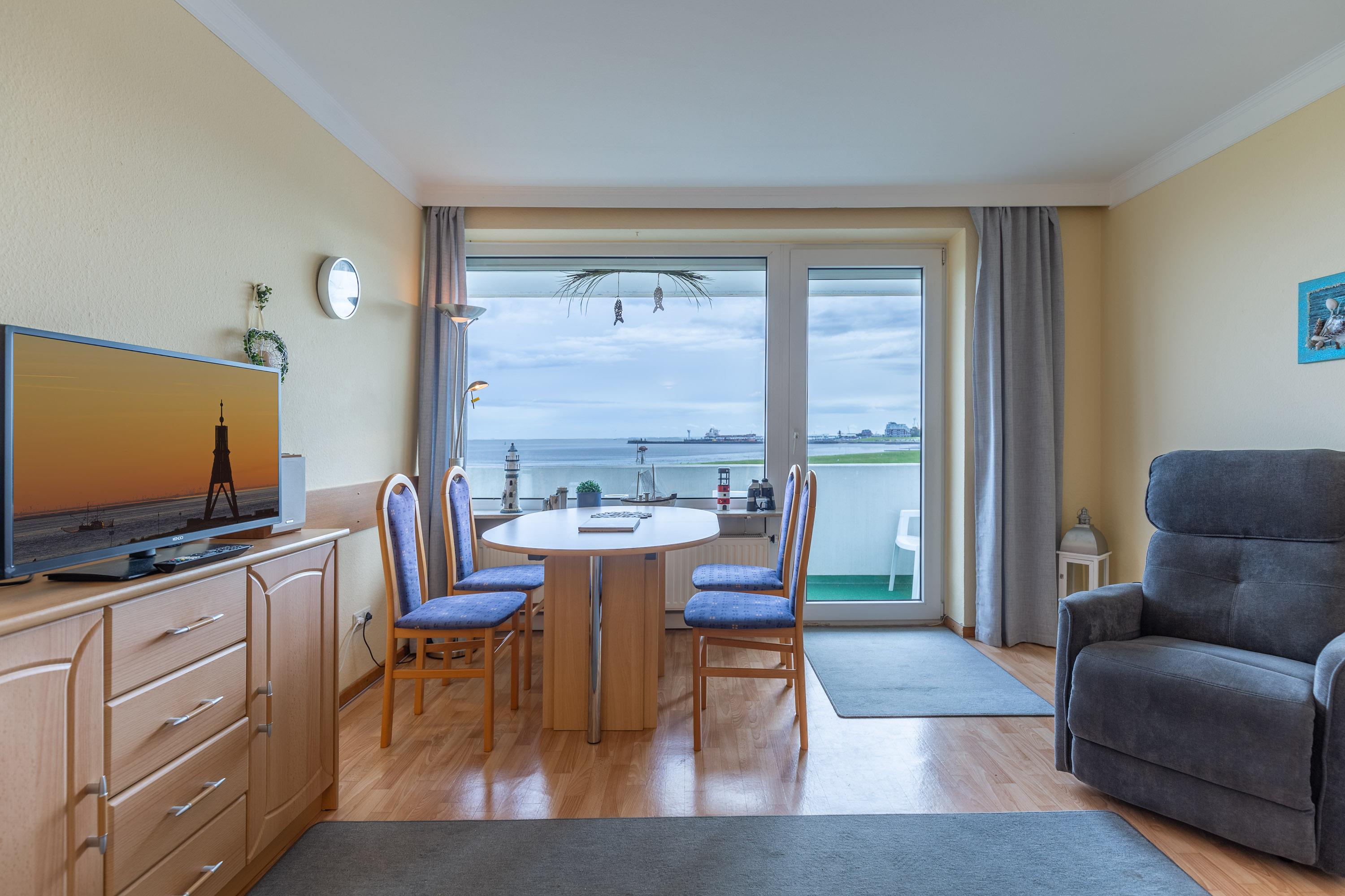 Genießen Sie entspannte Urlaubstage in unserer hellen 3-Zimmer-Ferienwohnung mit traumhaftem Meerblick. Sie ist ideal für Familien oder Großeltern mit Enkelkind. Dank der großzügigen Aufteilung mit zwei separaten Schlafzimmern findet hier jeder seinen persönlichen Rückzugsort. Die Eckwohnung ist eine echte Rarität. Aus dem 3. Obergeschoss genießt man neben dem Blick auf den Schifffahrtsweg auch den Blick auf die Kugelbake. Schon beim allmorgendlichen Frühstück können Sie den regen Schiffsverkehr beobachten. Für Unterhaltung sorgen ein Flachbild-TV sowie kostenfreies WLAN.
