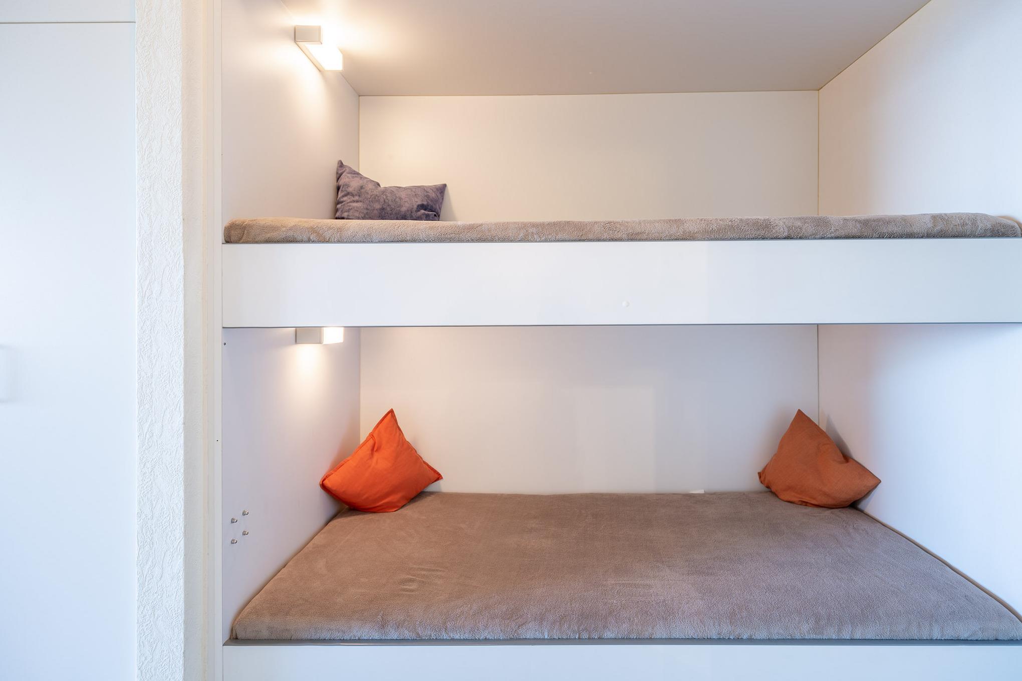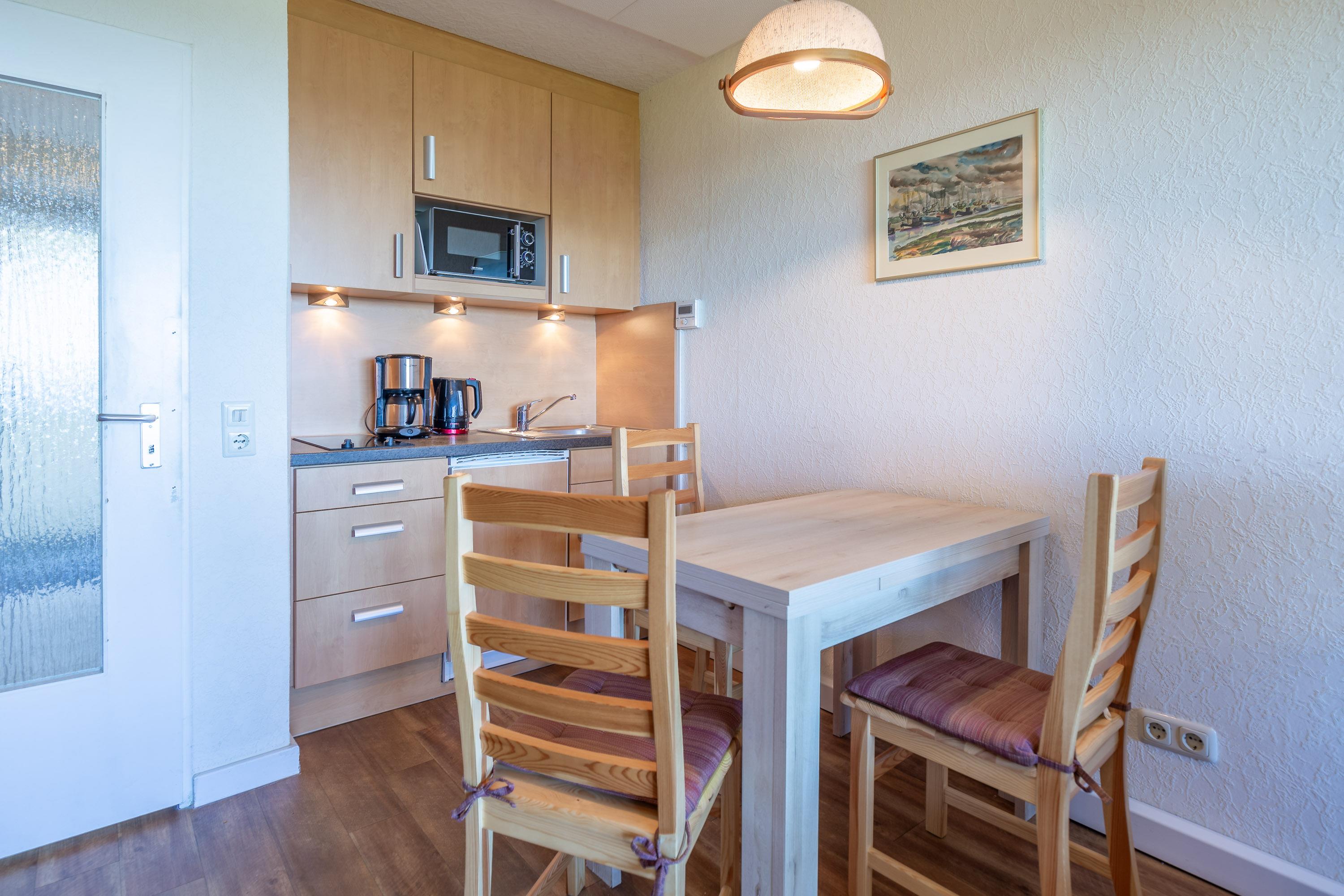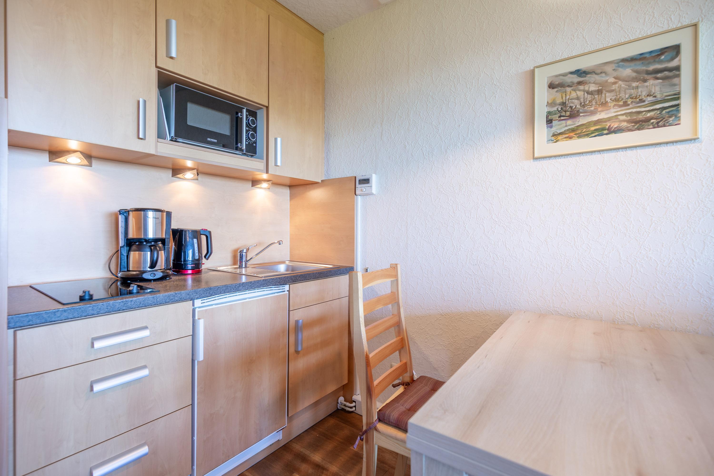 Darüber hinaus bietet der Wohnbereich eine kleine Küchenzeile mit angrenzendem Essplatz und ein Schrankbett. Ein Etagenbett im separaten Vorraum bietet die Möglichkeit getrennt zu schlafen. Das Bad mit Dusche und WC verfügt über ein Fenster zum Belüften. Selbstverständlich bietet auch der möblierte Balkon einen wunderbaren Ausblick auf den Weltschifffahrtsweg, die Badebucht und den Hafen. Zur Wohnung gehört ein KFZ-Stellplatz.