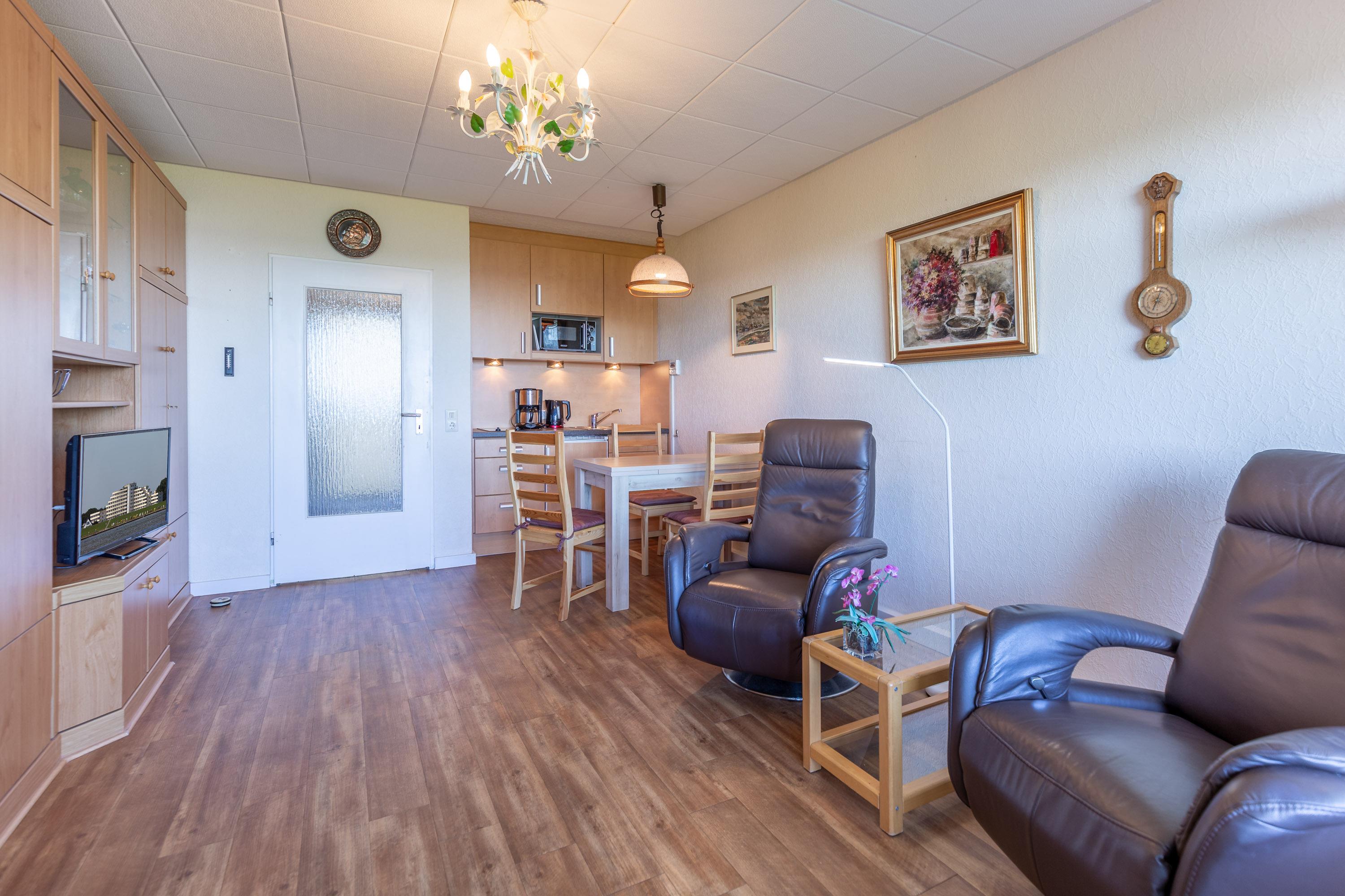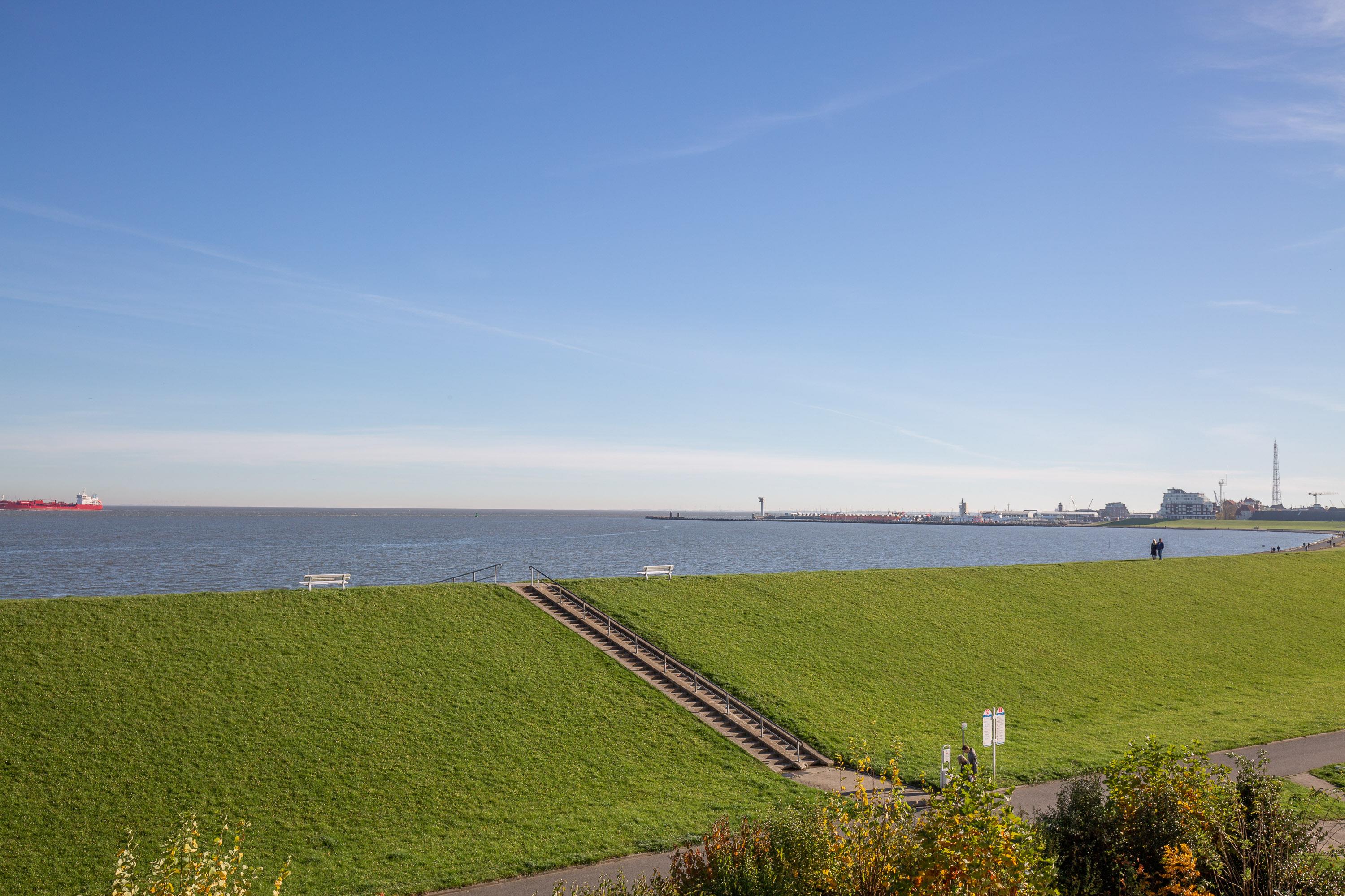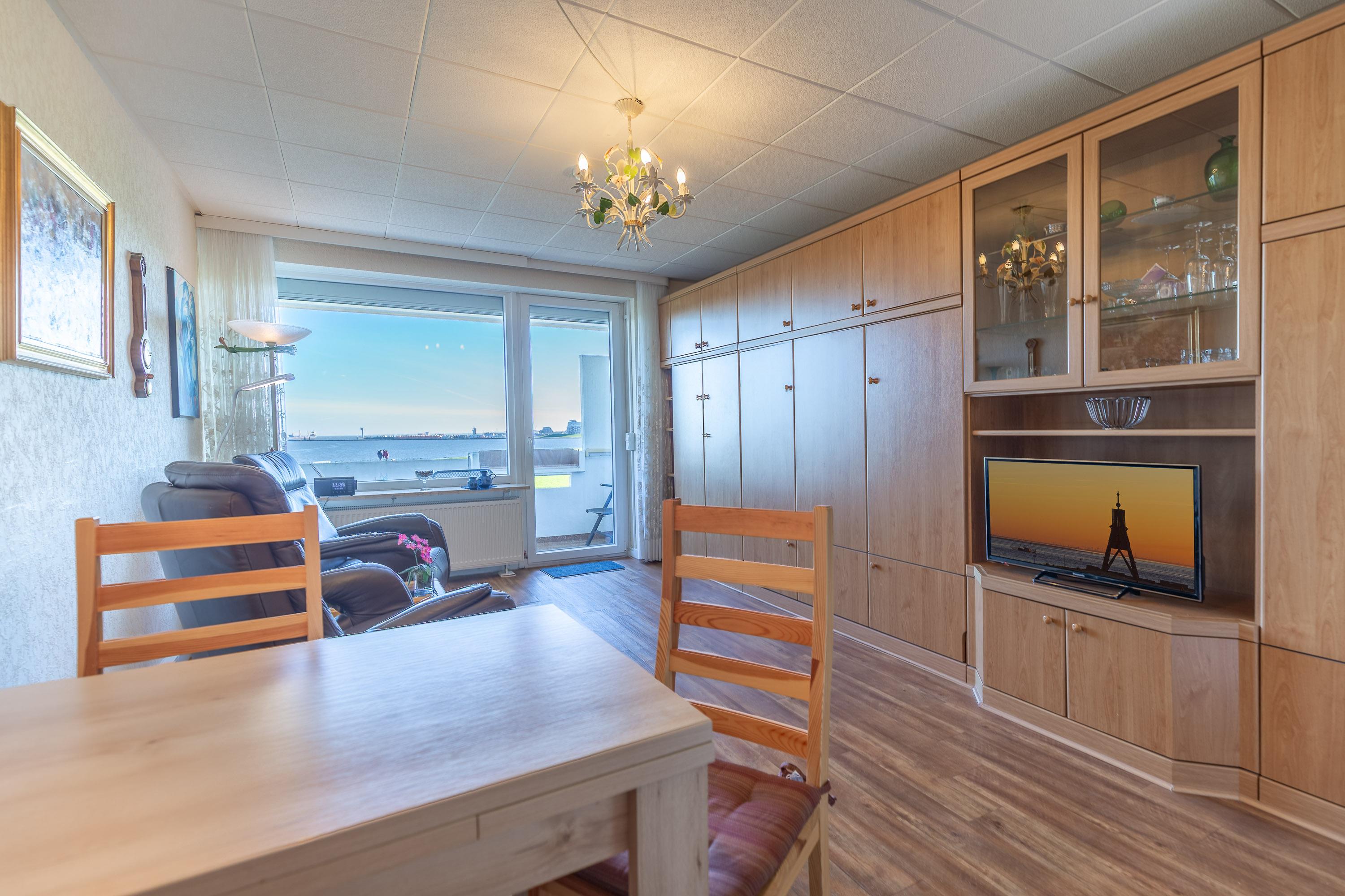 Genießen Sie den Ausblick auf die vorbeifahrenden Ozeanriesen mit bis zu 3 Personen aus unserer günstigen und gemütlichen 35 m² Ferienwohnung im Haus Nautic. Die beiden Relaxsessel im lichtdurchfluteten Wohnbereich gewährleisten, dass Sie sich entspannt zurücklehnen können, während Sie den faszinierenden Meerblick oder das Abendprogramm auf dem modernen LCD-Fernseher genießen.