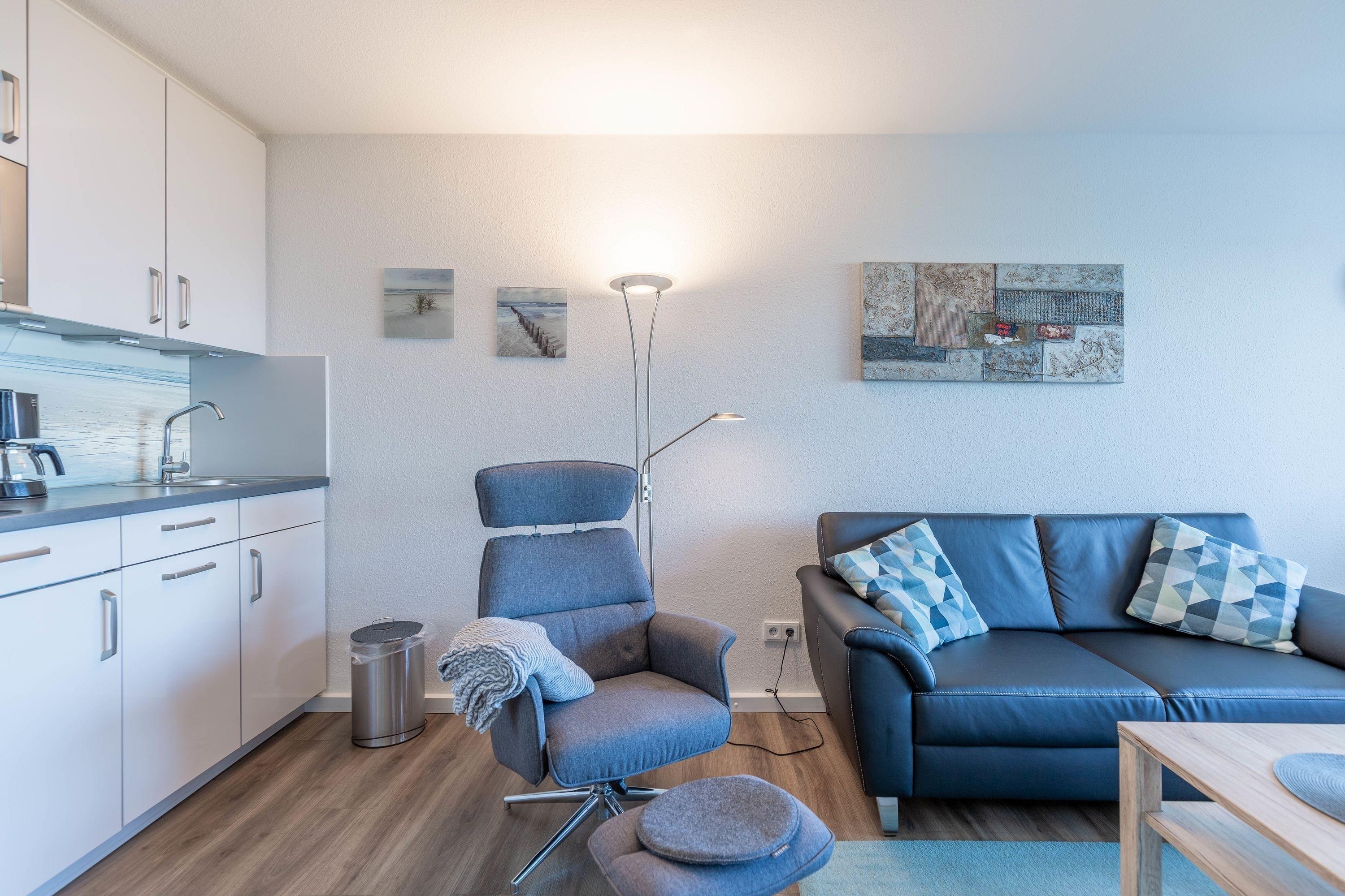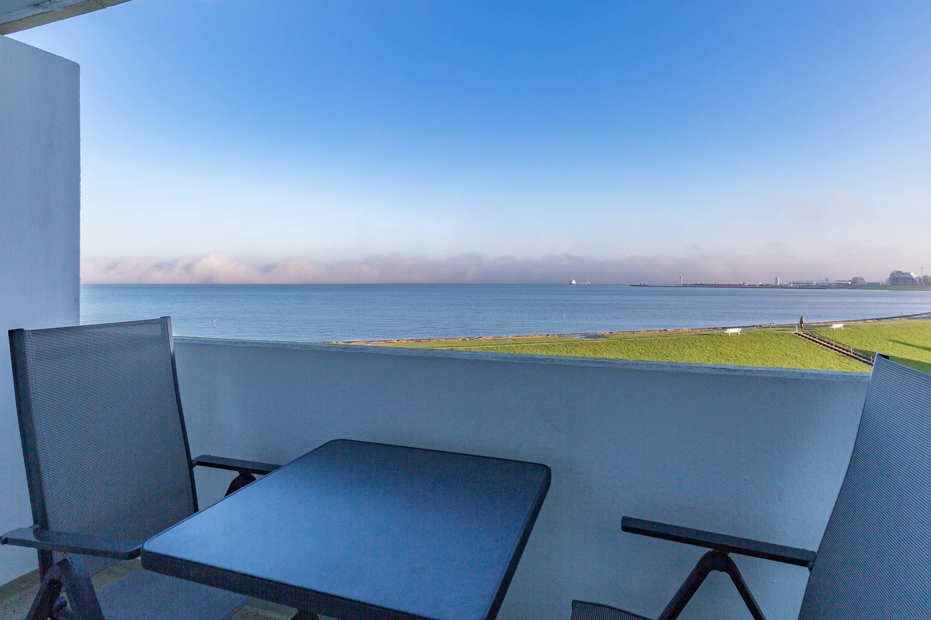 Der Esstisch am Fenster gewährleistet, dass Sie schon beim allmorgendlichen Frühstück den faszinierenden Ausblick auf die vorbeifahrenden Großsegler, Kutter und Kreuzfahrtschiffe genießen können. Ein LCD Fernseher sorgt dafür, dass Sie auch im Urlaub nicht auf Ihre Lieblingsserie verzichten müssen. Eine Küchenzeile mit Geschirrspüler ist im Wohnbereich integriert.