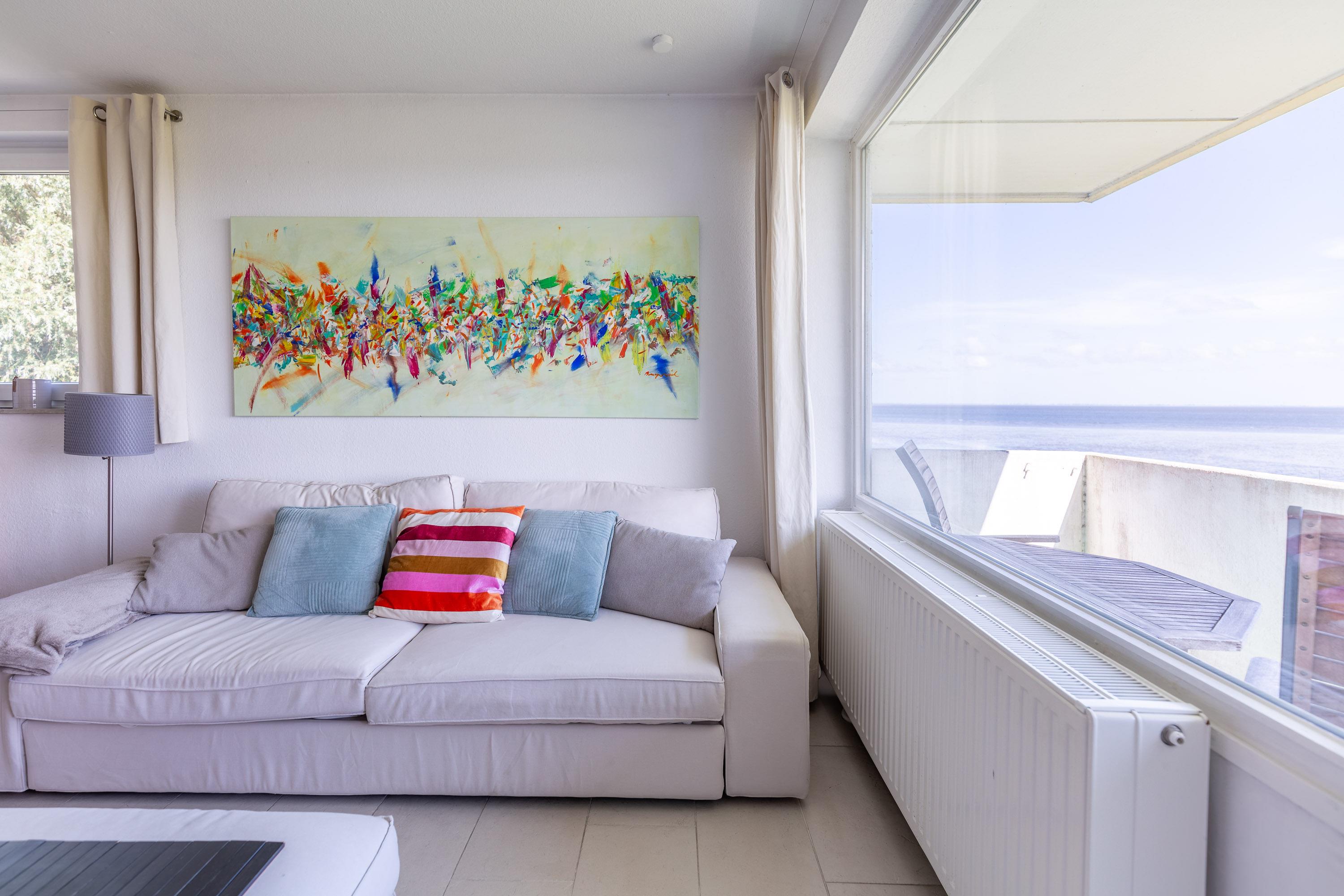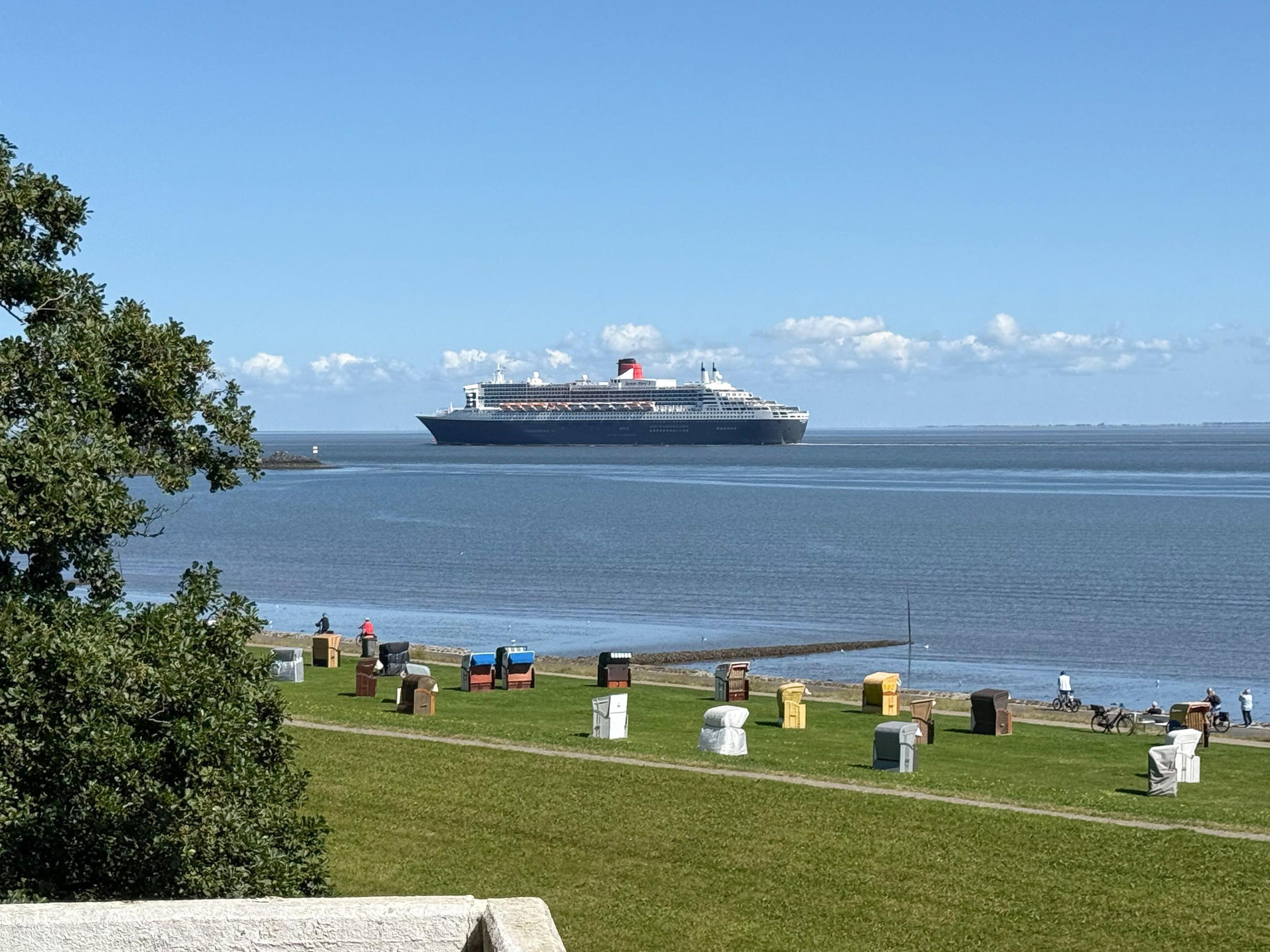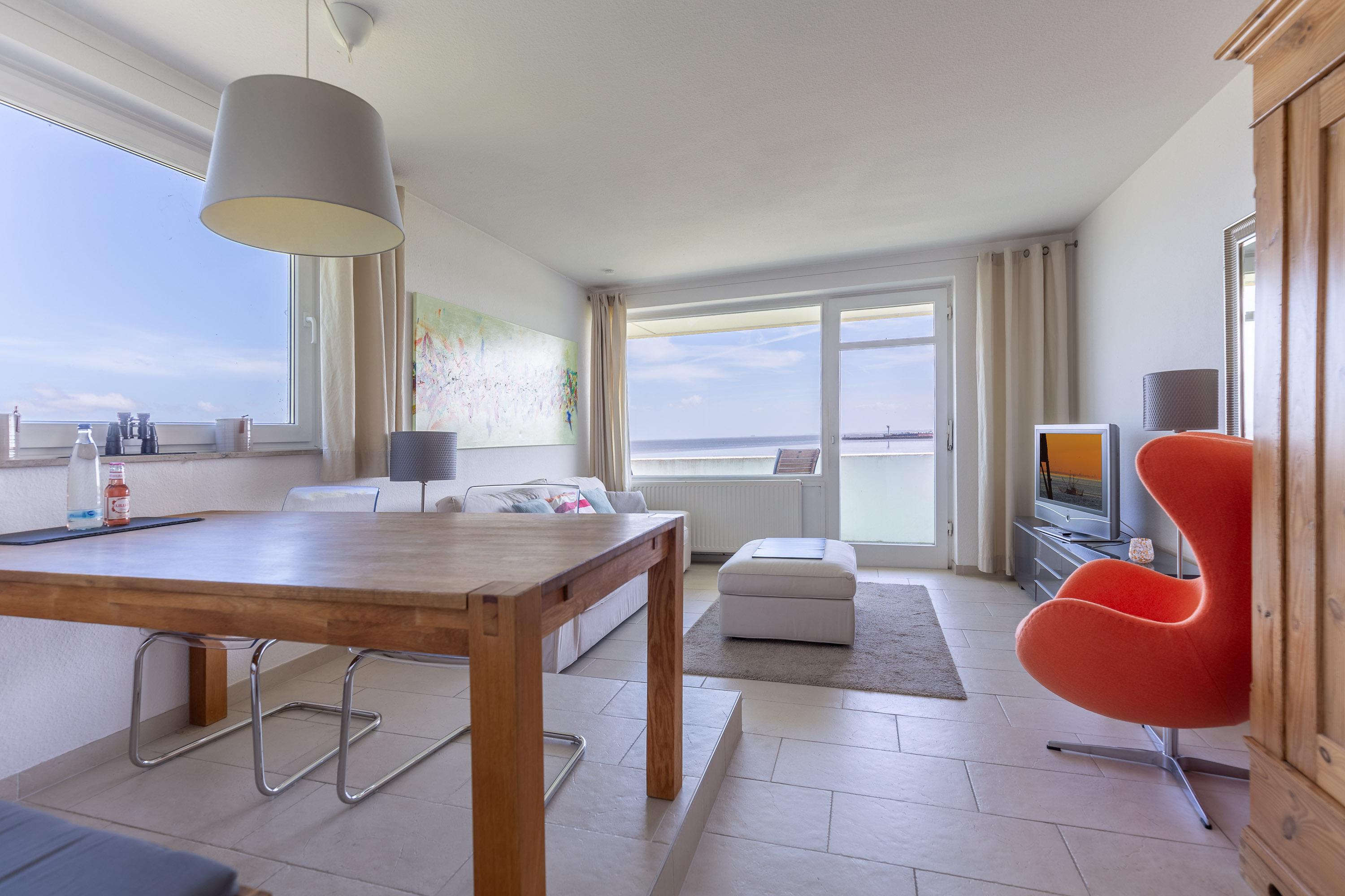 Nach einem erlebnisreichen Tag können Sie am Esstisch auf der Empore relaxen - durch den erhöhten Sitzbereich lassen sich die vorbeifahrenden Ozeanriesen besonders gut beobachten. Der kombinierte Wohn- und Schlafbereich bietet ein ausziehbares Schlafsofa. In der Diele befindet sich ein weiteres Schlafsofa, welches getrenntes Schlafen ermöglicht. Kostenloses WLAN und ein Flachbildfernseher sorgen für beste Unterhaltung. Die separate Küche mit Fenster lässt für Selbstversorger keine Wünsche offen und ist mit einem 4 Plattenherd, einem Backofen und einem Geschirrspüler ausgestattet. Das modern sanierte Bad mit Dusche und WC verfügt über ein Fenster zum Belüften. Auch der Balkon bietet einen spektakulären Meerblick.
