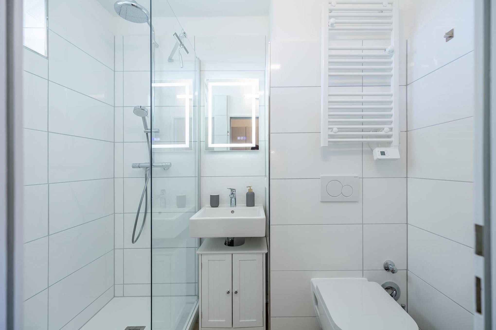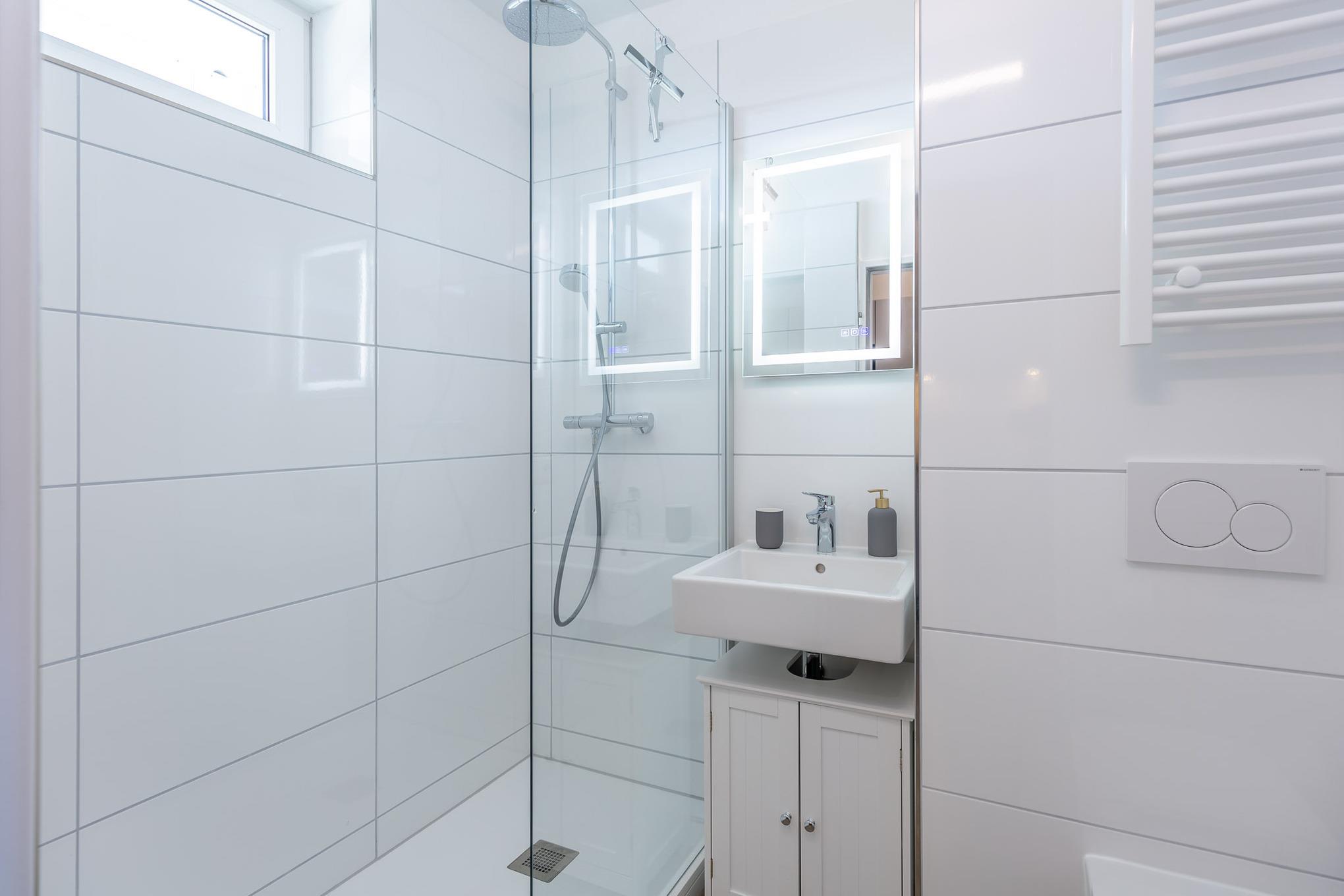 Auch vom möblierten Balkon genießen Sie den faszinierenden Meerblick. Das moderne Bad mit großer Dusche und WC verfügt über ein Fenster zum Belüften. Zur Wohnung gehört ein KFZ-Stellplatz.