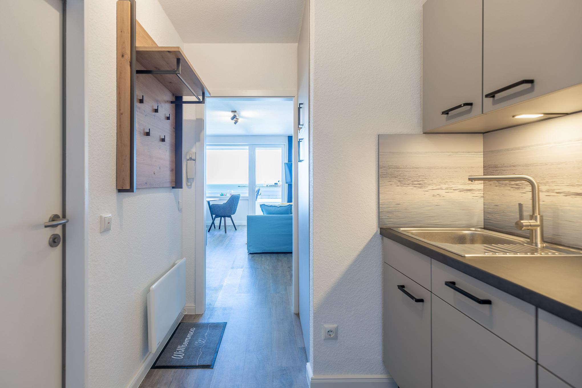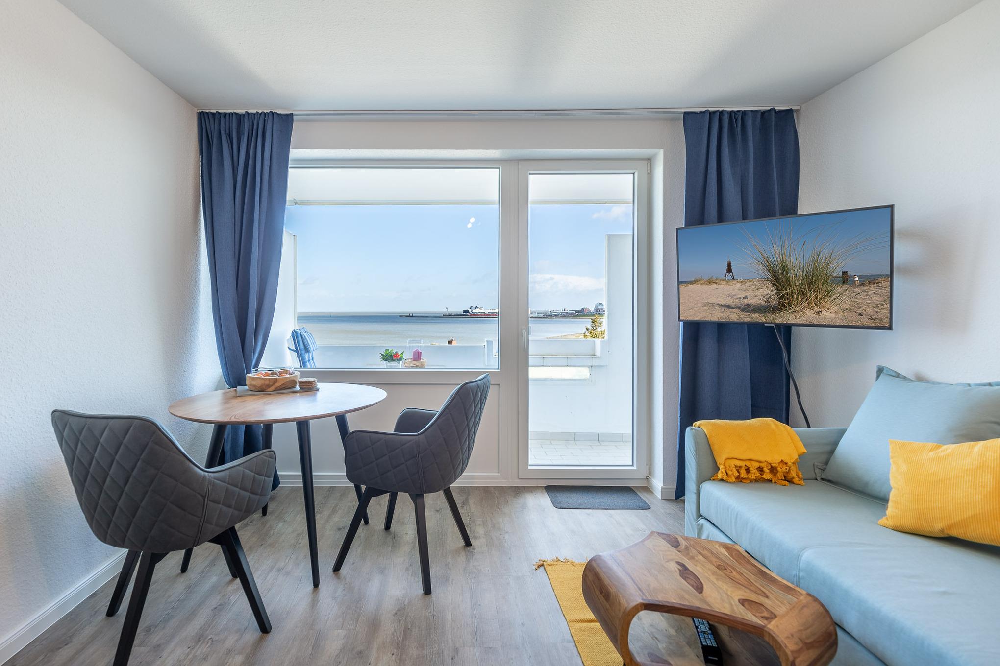 Nach einem langen und erlebnisreichen Tag können Sie auf dem Ecksofa entspannen und die Parade der vorbeiziehenden Segelschiffe, Krabbenkutter und Luxus Liner beobachten. Ein Flachbildfernseher sorgt dafür, dass Sie auch im Urlaub nicht auf Ihre Lieblingsserie verzichten müssen. Ferienwohnung Nautic 506 bietet eine separate Küchenzeile mit Cerankochfeld, Geschirrspüler, Mikrowelle und Kühlschrank mit Gefrierfach.