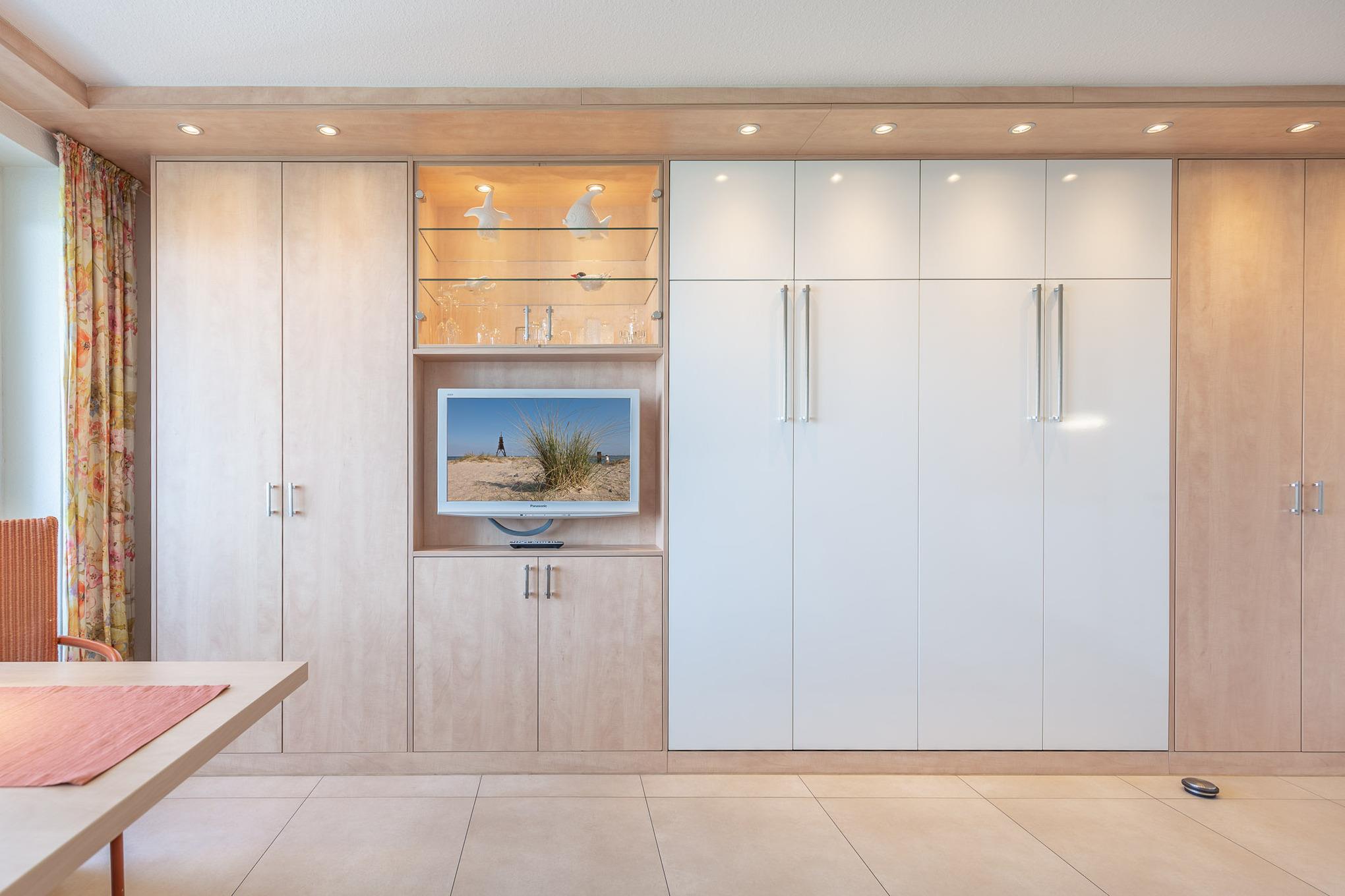 In der 5. Etage gelegen bietet unsere 35 m² große Ferienwohnung einen traumhaften Meerblick für bis zu 2 Personen. Alle Materialien sind sorgfältig aufeinander abgestimmt. Weiße Hochglanzfronten und warme Holztöne sorgen für ein einladendes Ambiente. Die gesamte Ferienwohnung wurde hochwertig von einer Möbeltischlerei ausgestattet.