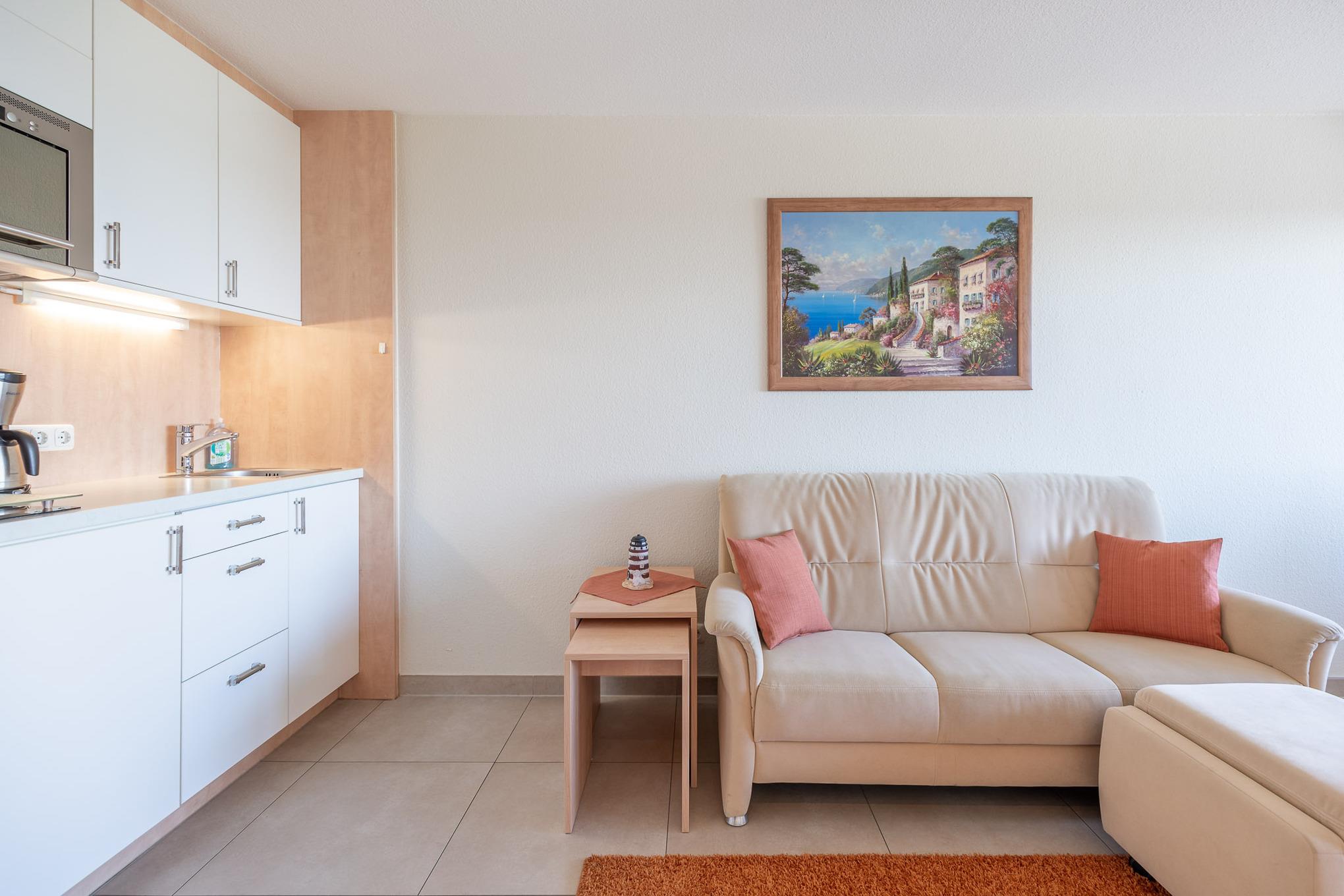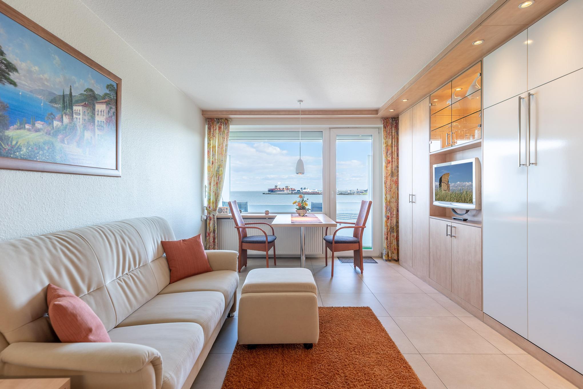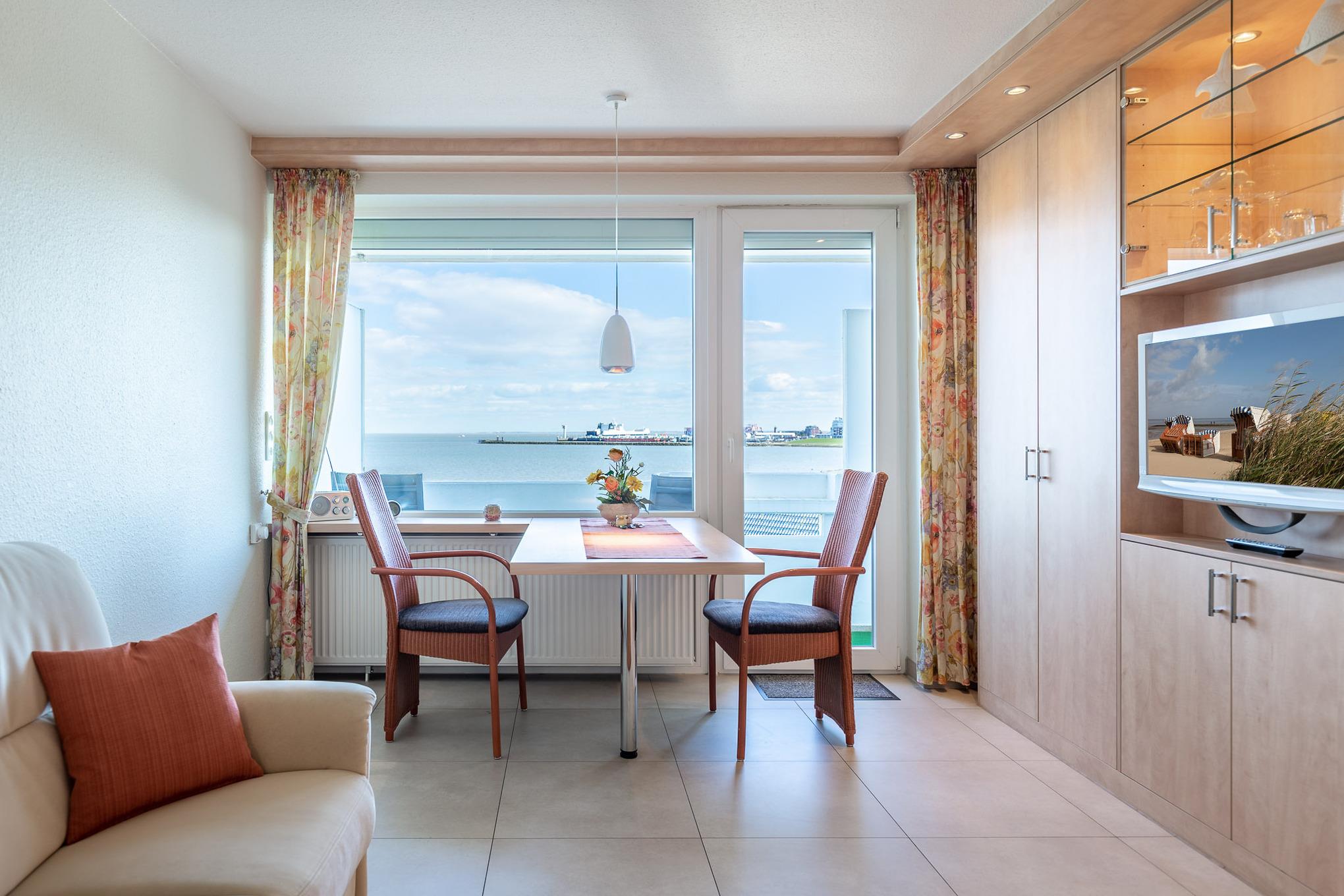 Nach einem langen und erlebnisreichen Tag können Sie in den extra breiten und äußerst komfortablen Armlehnstühlen entspannen und die Parade der vorbeiziehenden Segelschiffe, Krabbenkutter und Luxus Liner beobachten. Der Esstisch am Fenster gewährleistet, dass Sie schon beim Frühstück den spektakulären Meerblick genießen können. Ein LCD Fernseher sorgt dafür, dass Sie auch im Urlaub nicht auf Ihre Lieblingsserie verzichten müssen. Eine kleine, komplett ausgestattete Küchenzeile ist im Wohnbereich integriert.