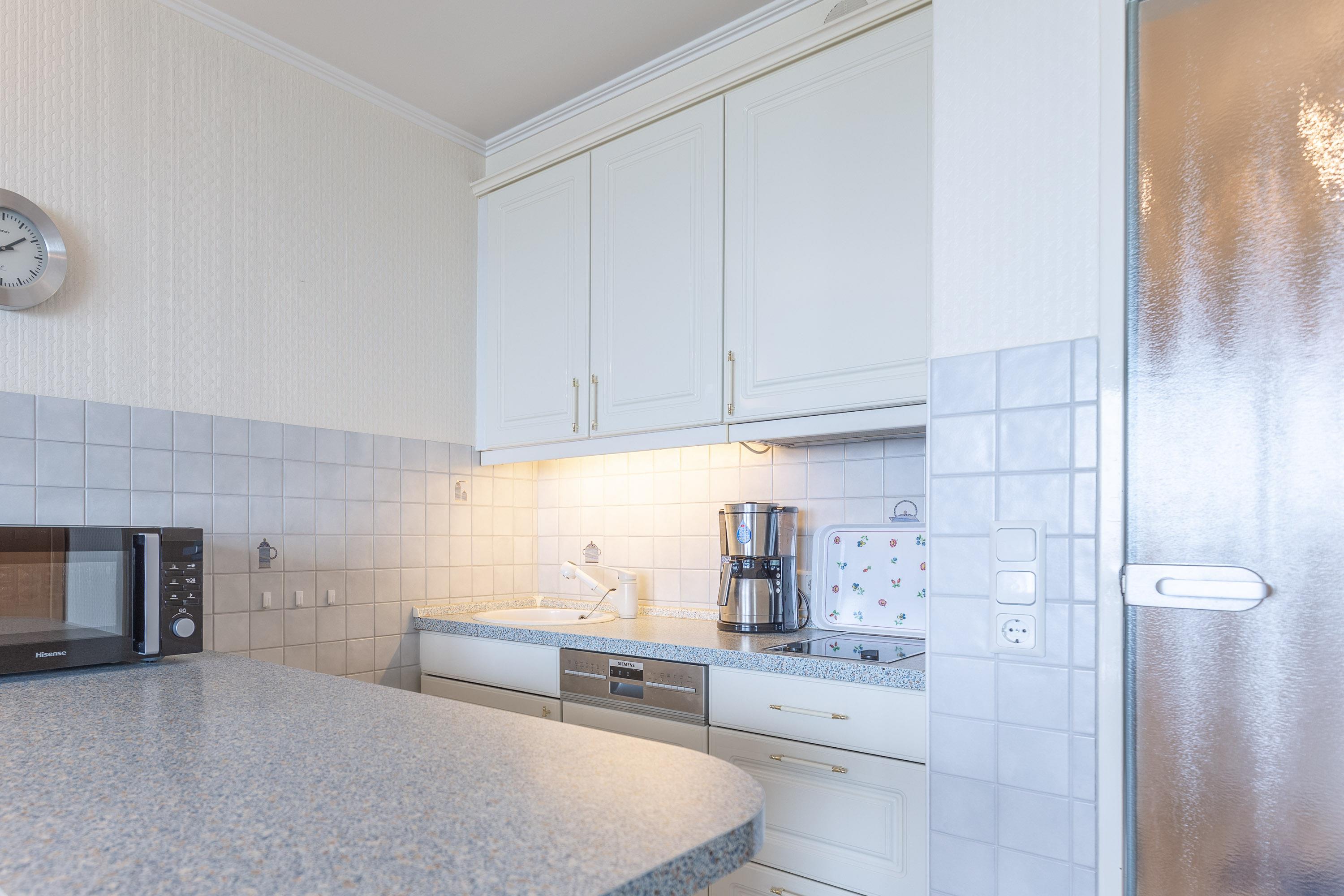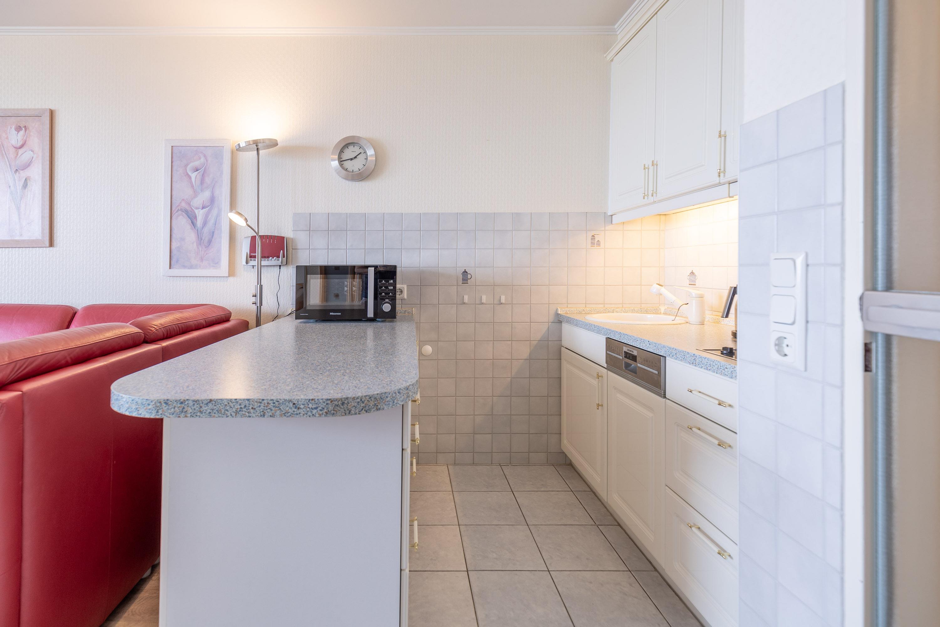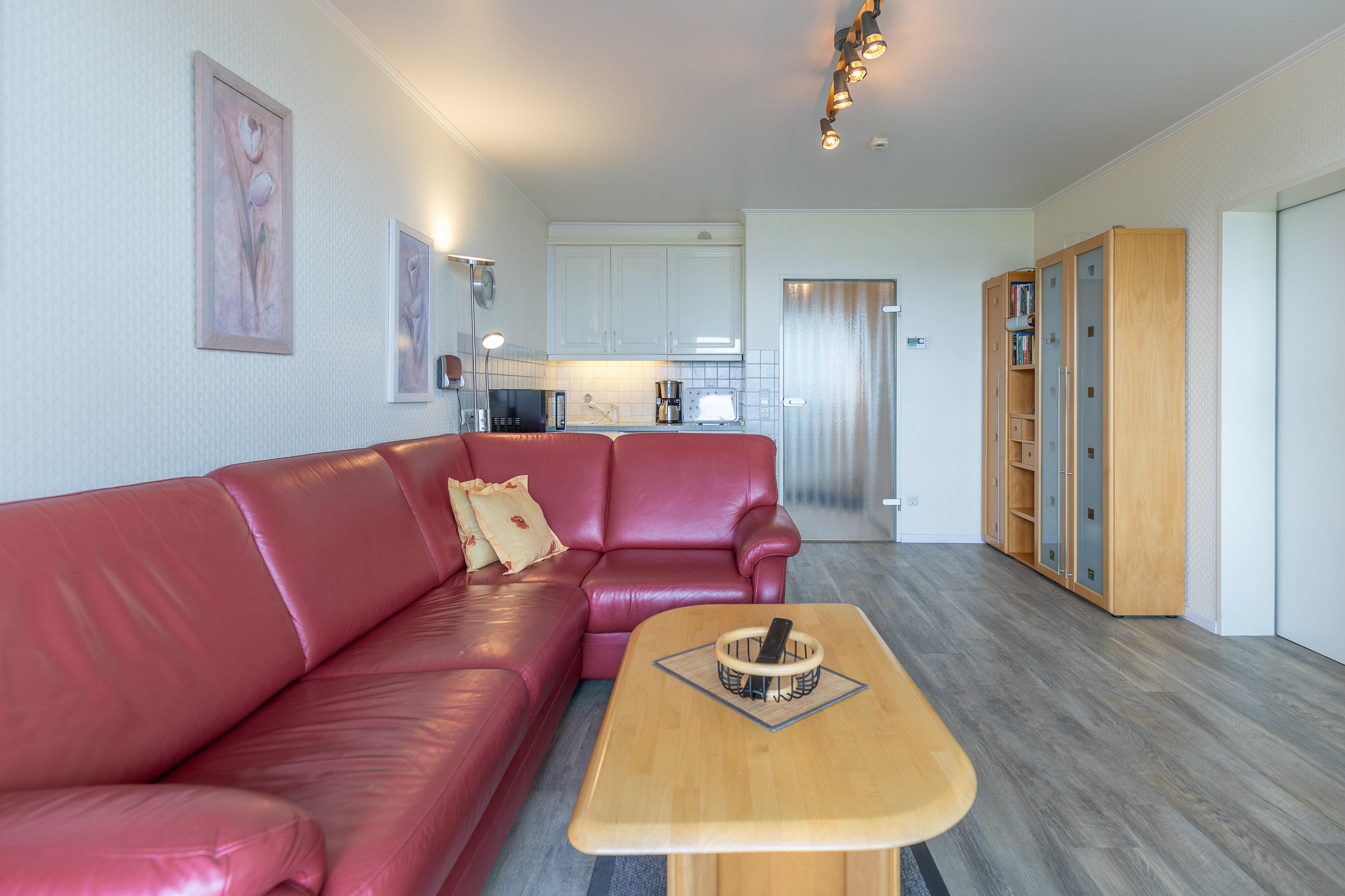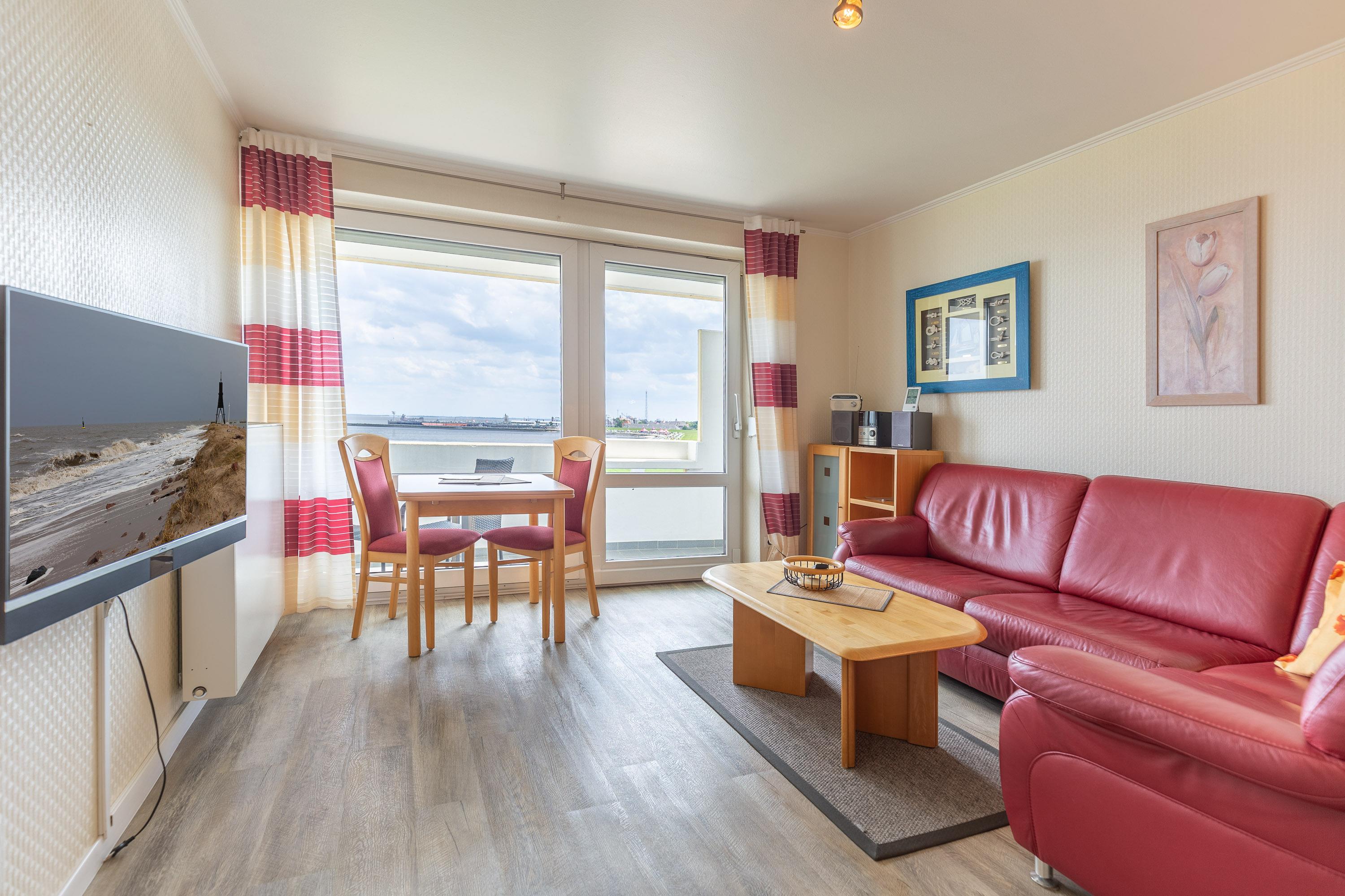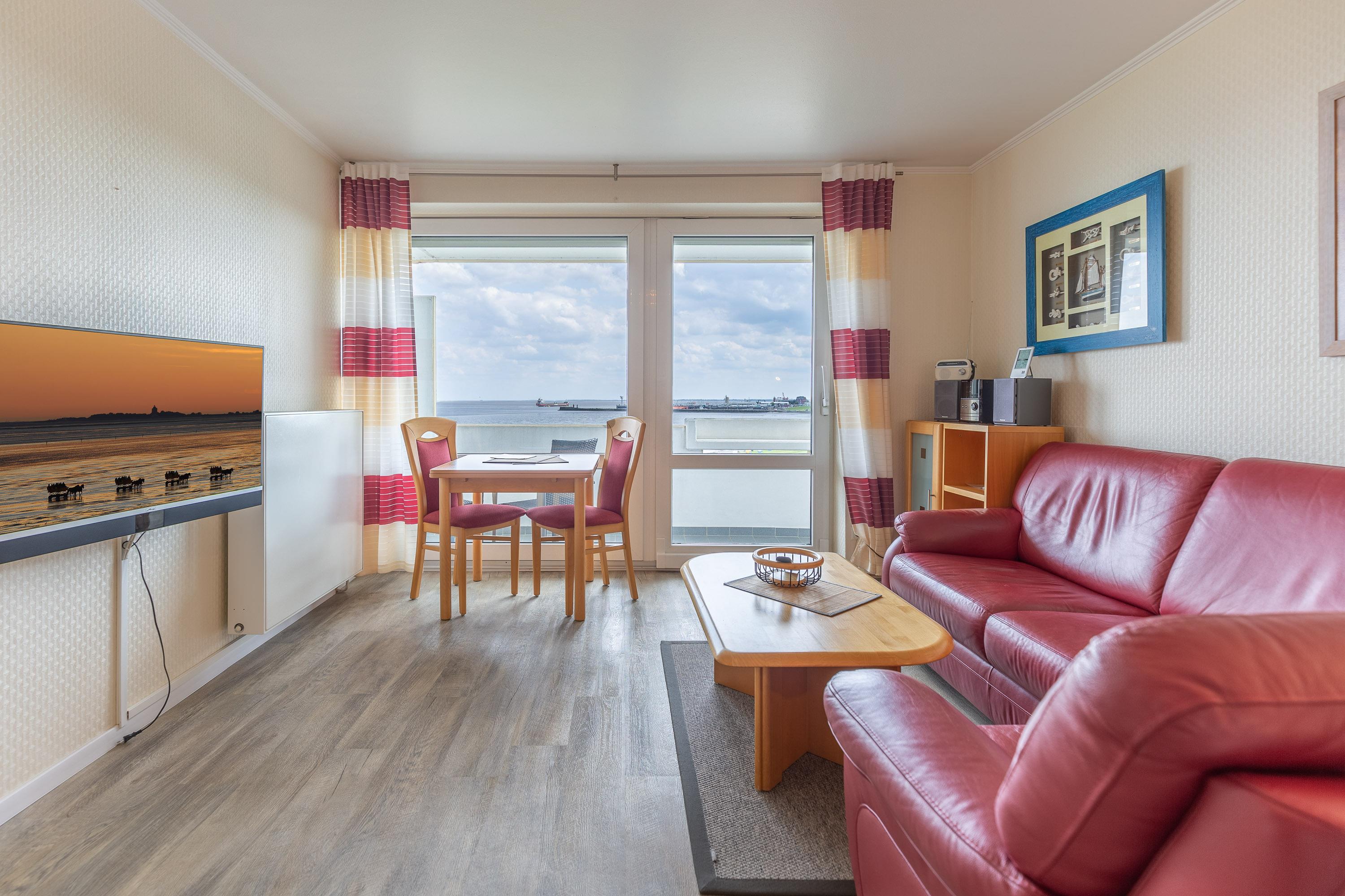 Im kombinierten Wohn- und Essbereich ist eine funktionale Küchenzeile mit Kühlschrank, Gefrierfach, Geschirrspüler und Mikrowelle integriert. Dank Flachbildfernseher müssen Sie auch im Urlaub nicht auf einen entspannten Fernsehabend verzichten. Der Balkon ist eine wahre Freiluft-Nordseeloge und erstreckt sich über die gesamte Fläche des Wohn- und Schlafzimmers. Selbstverständlich genießen Sie auch vom Balkon den traumhaften Meerblick.