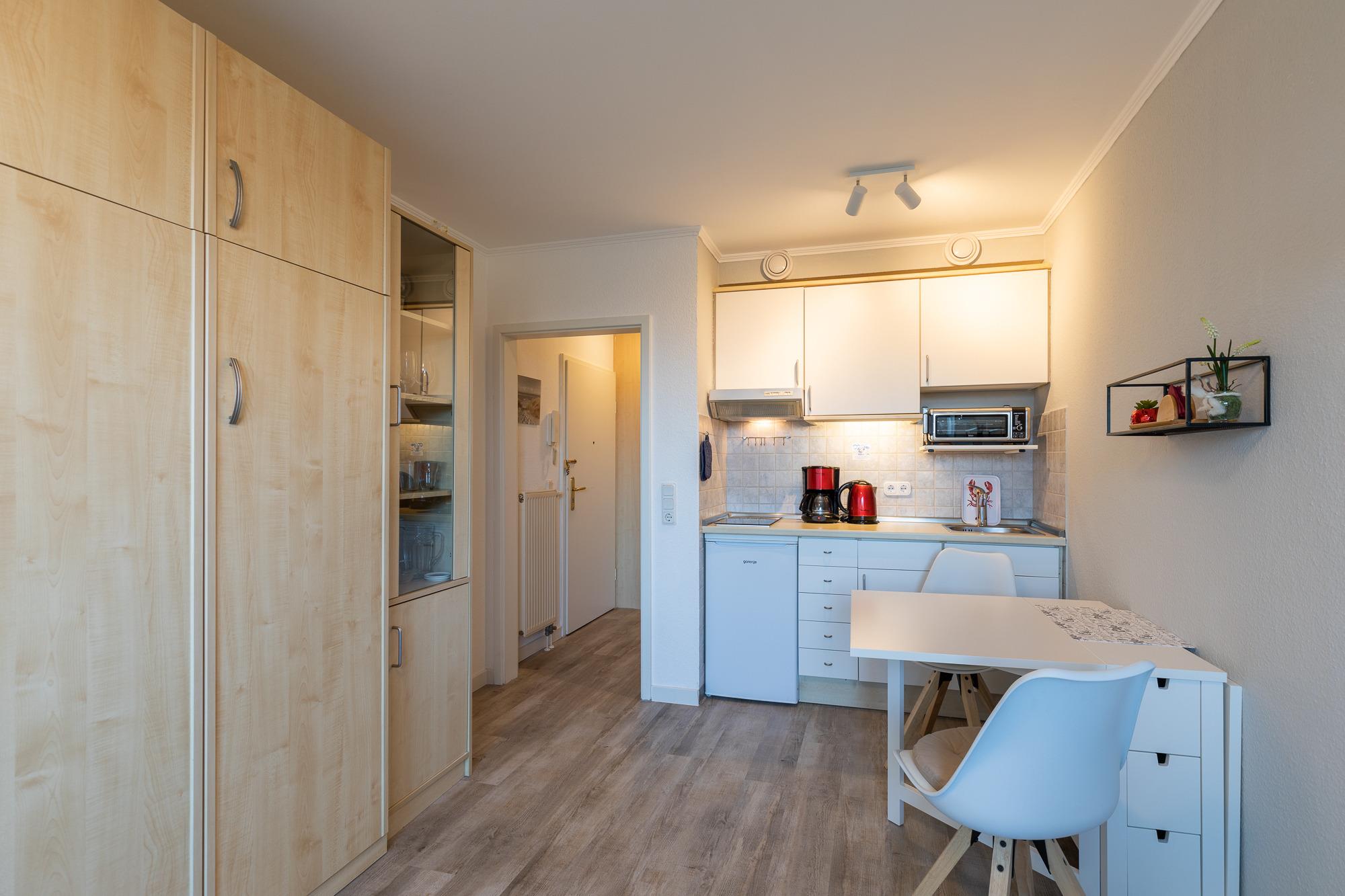 Die schöne 1 Zimmer Wohnung im 2. Obergeschoss, für bis zu 2 Personen, 1 Wohnzimmer mit Tisch und 2 Cocktailsessel, Essplatz für 2 Personen, Küchenzeile (2 Plattenherd, Kaffeemaschine, Wasserkocher, Toaster und Mikrowelle),2 Schrankbetten, TV, Bad mit Dusche und WC, Fahrstuhl im Haus, reservierter PKW Stellplatz in der Tiefgarage.