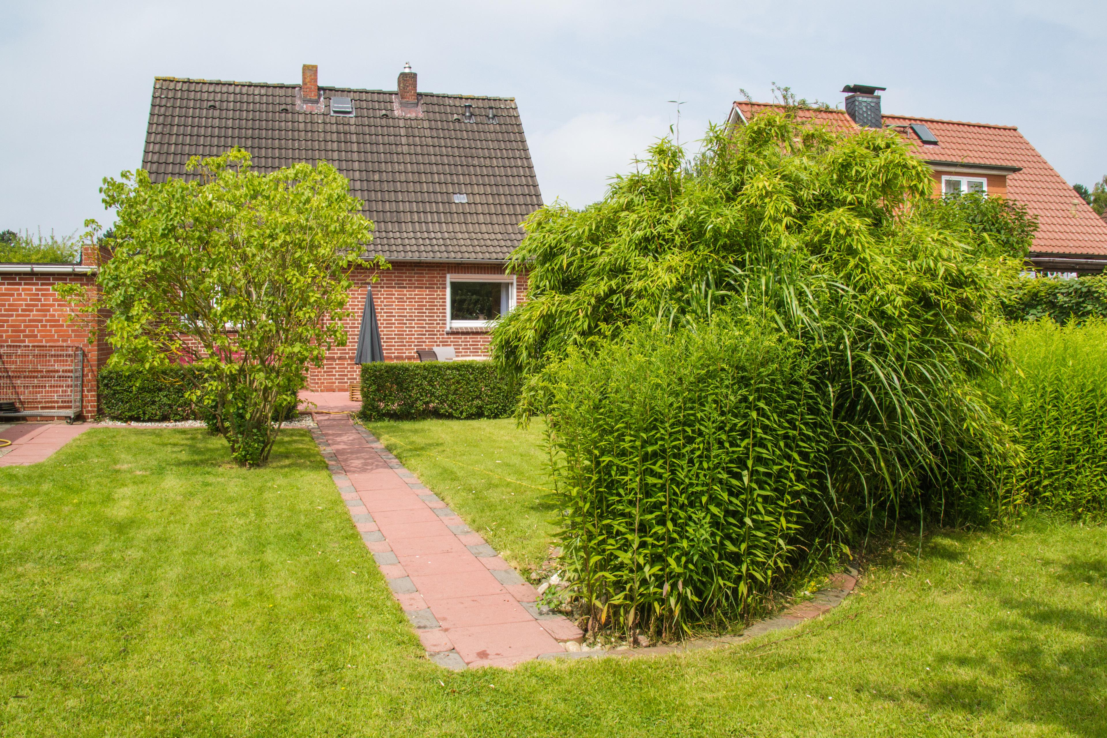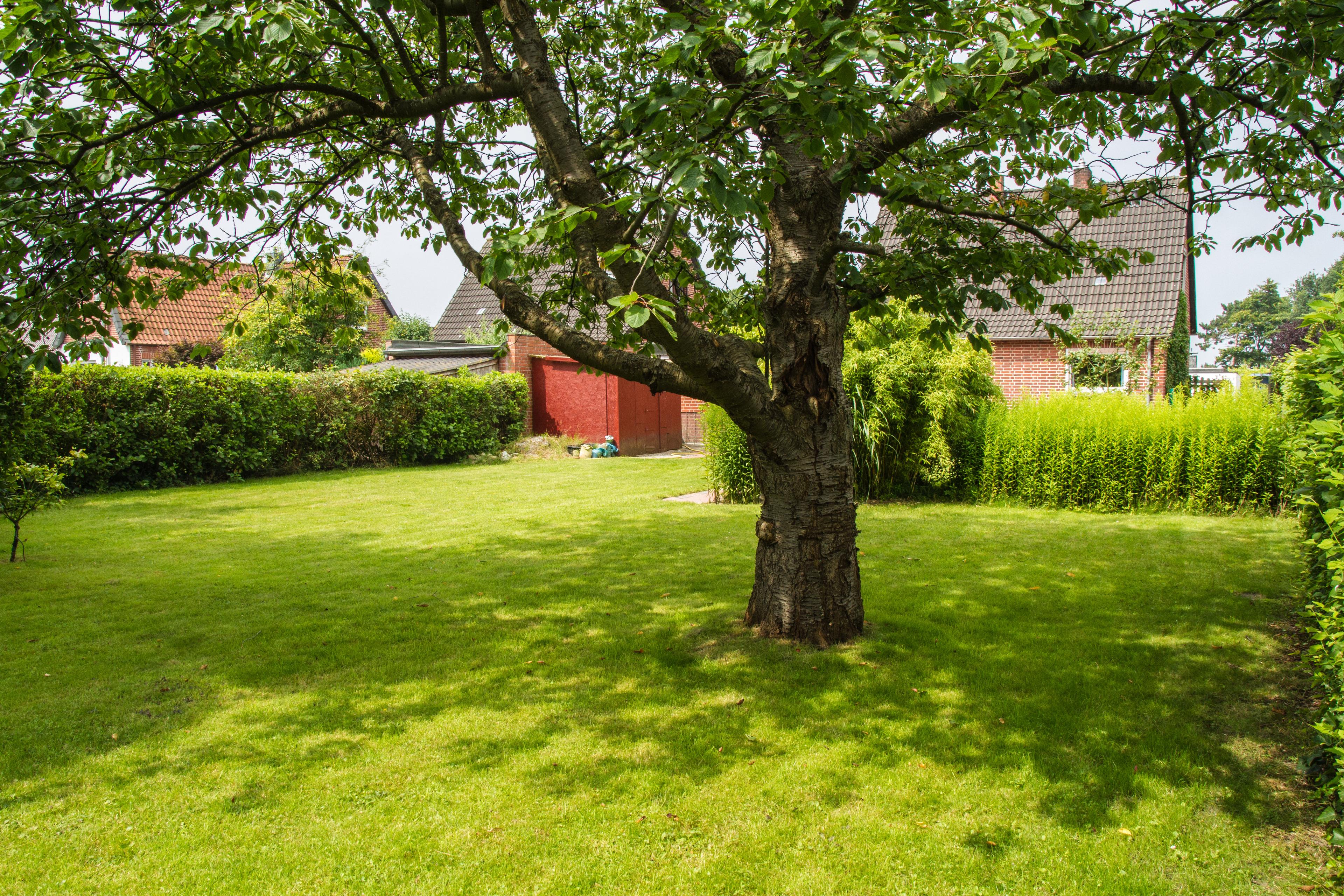 Privater Garten mit kleinem Gartenteich, Obstbäumen und Hecken als Sichtschutz