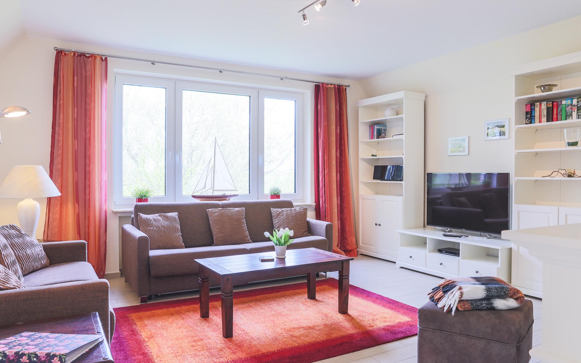 Wohnbereich: Gemütliche Sofaecke, zusätzl. Schlafsofa (160 × 200 cm, Lattenrost), elektrischer Kamin für Wohlfühlatmosphäre, Ausrichtung zum Deich