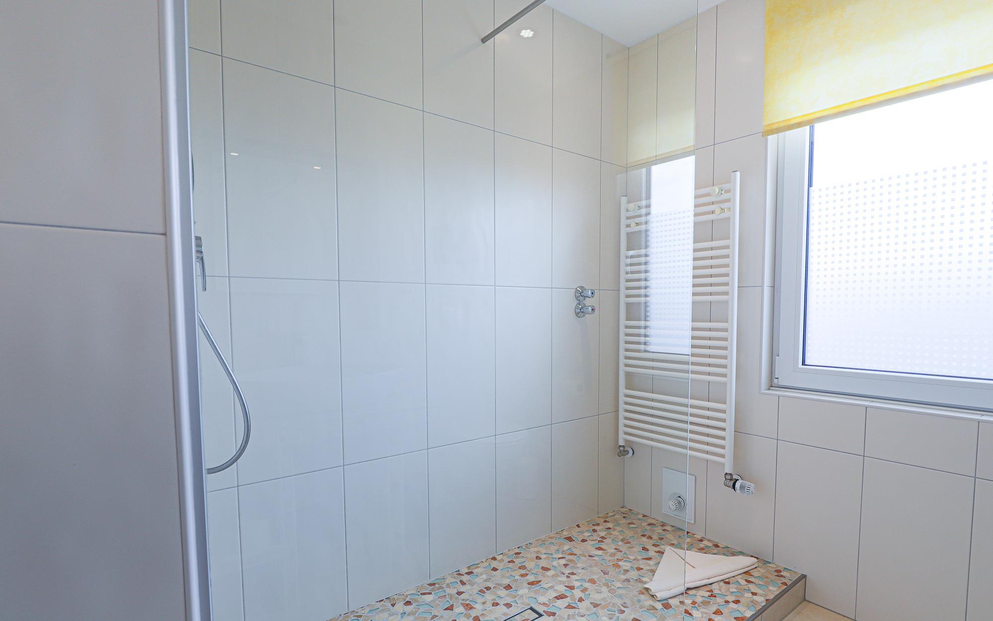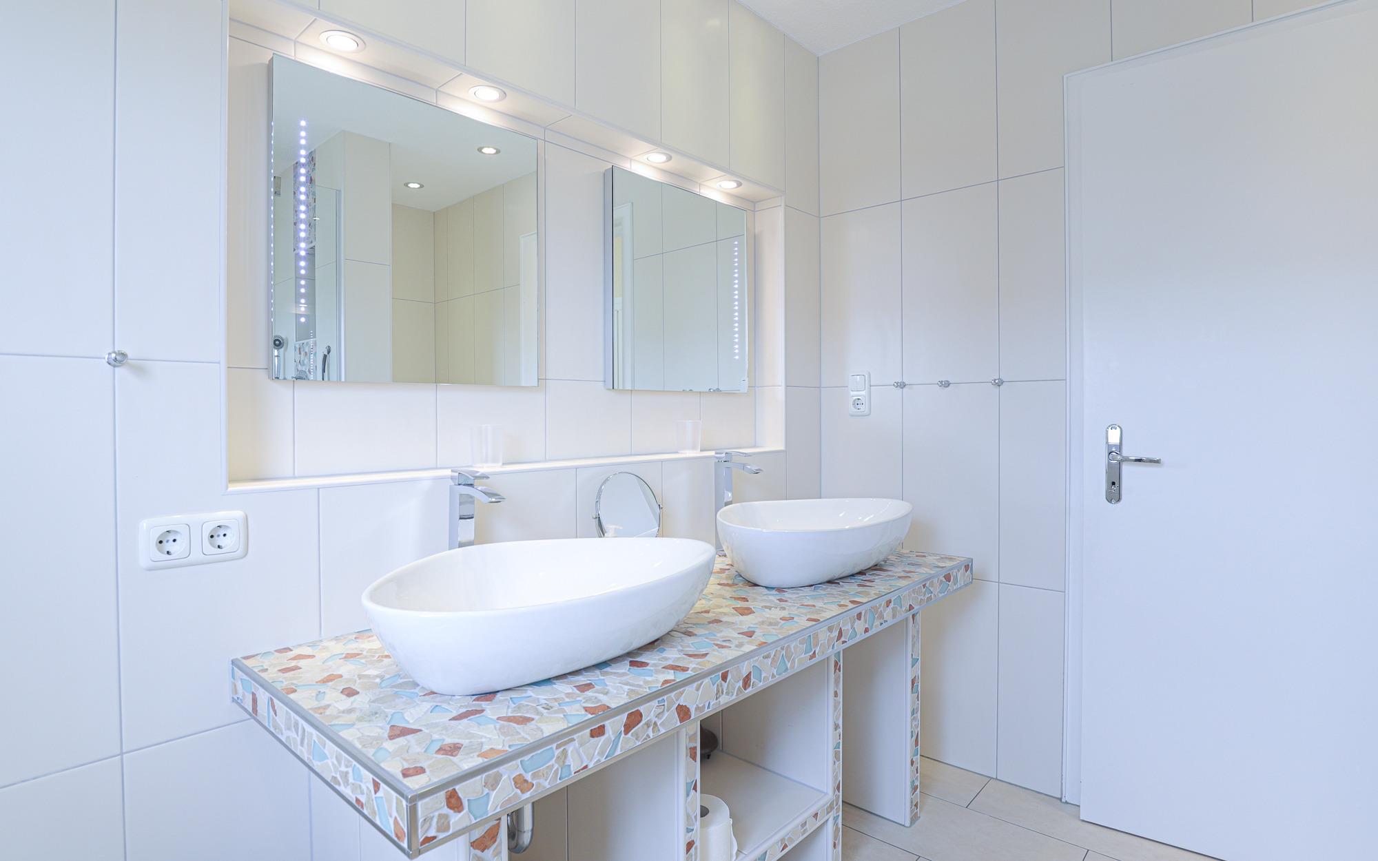 Badezimmer: Duschbad mit WC, Doppelwaschbecken, Fußbodenheizung
