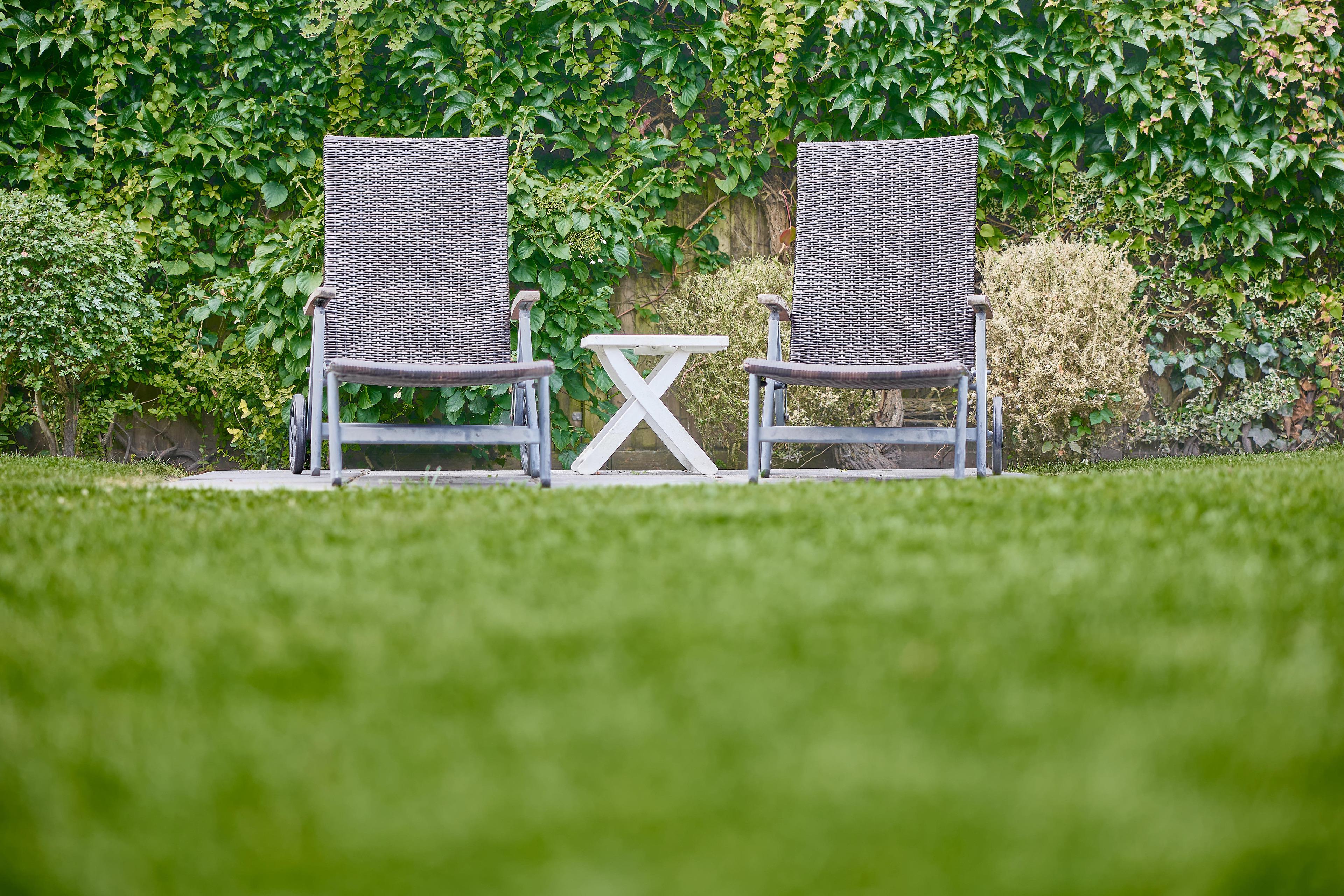 Großer Gemeinschaftsgarten mit Terrasse, Gartenmöbeln und Strandkörben