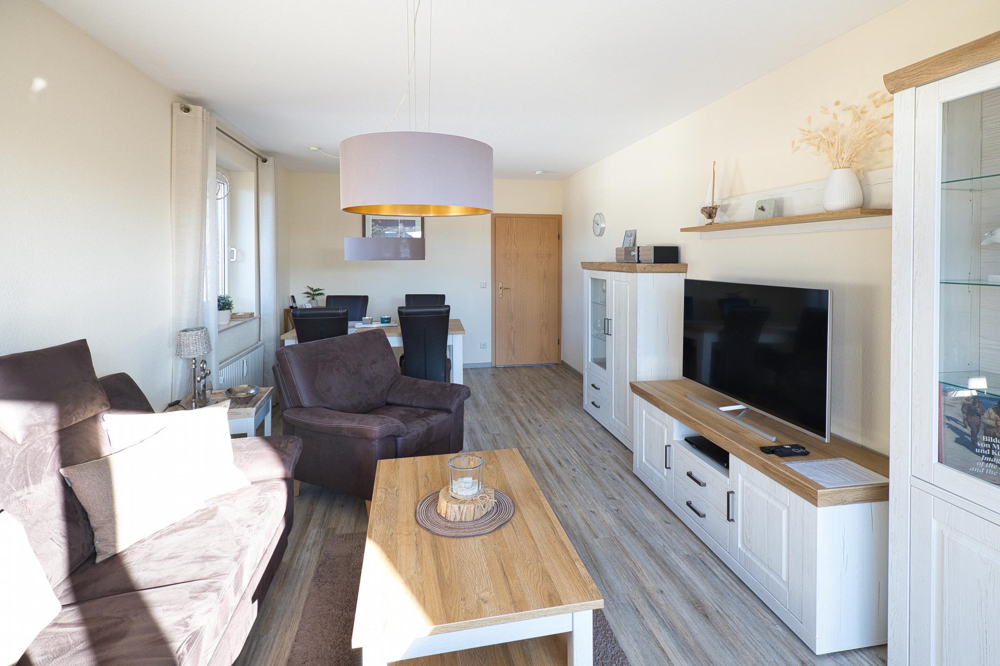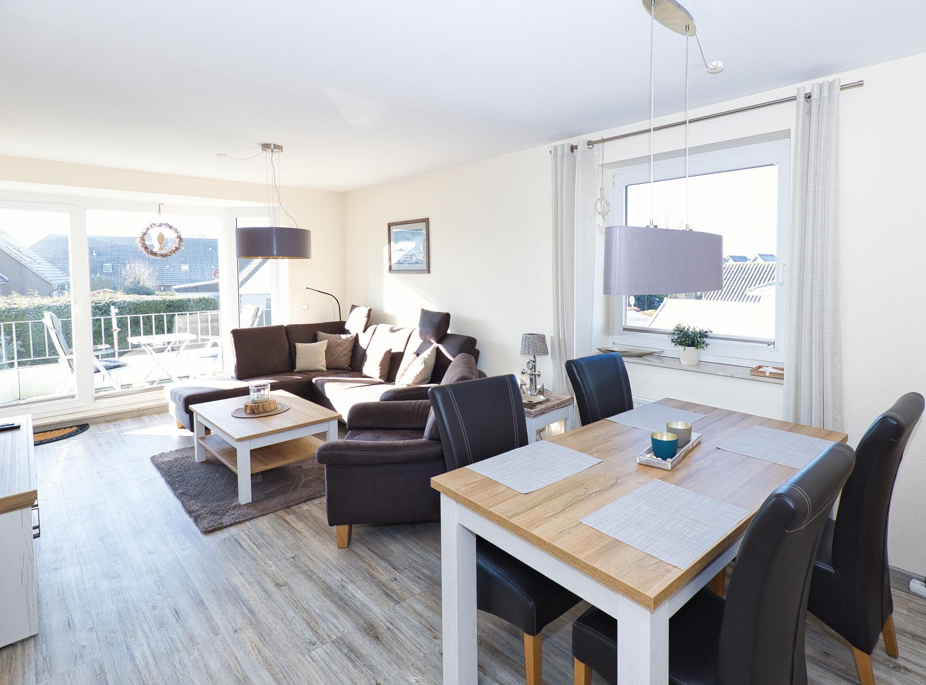 Der großzügige Wohnbereich ist freundlich und modern eingerichtet und bietet mit Sofa, Essplatz und einem schwenkbaren HDTV mit Ambilight eine angenehme Atmosphäre für entspannte Abende. Große Fenster sorgen für viel Tageslicht und führen direkt auf den Südbalkon, von dem aus Sie einen schönen Blick in den gepflegten Garten der Ferienanlage genießen können.