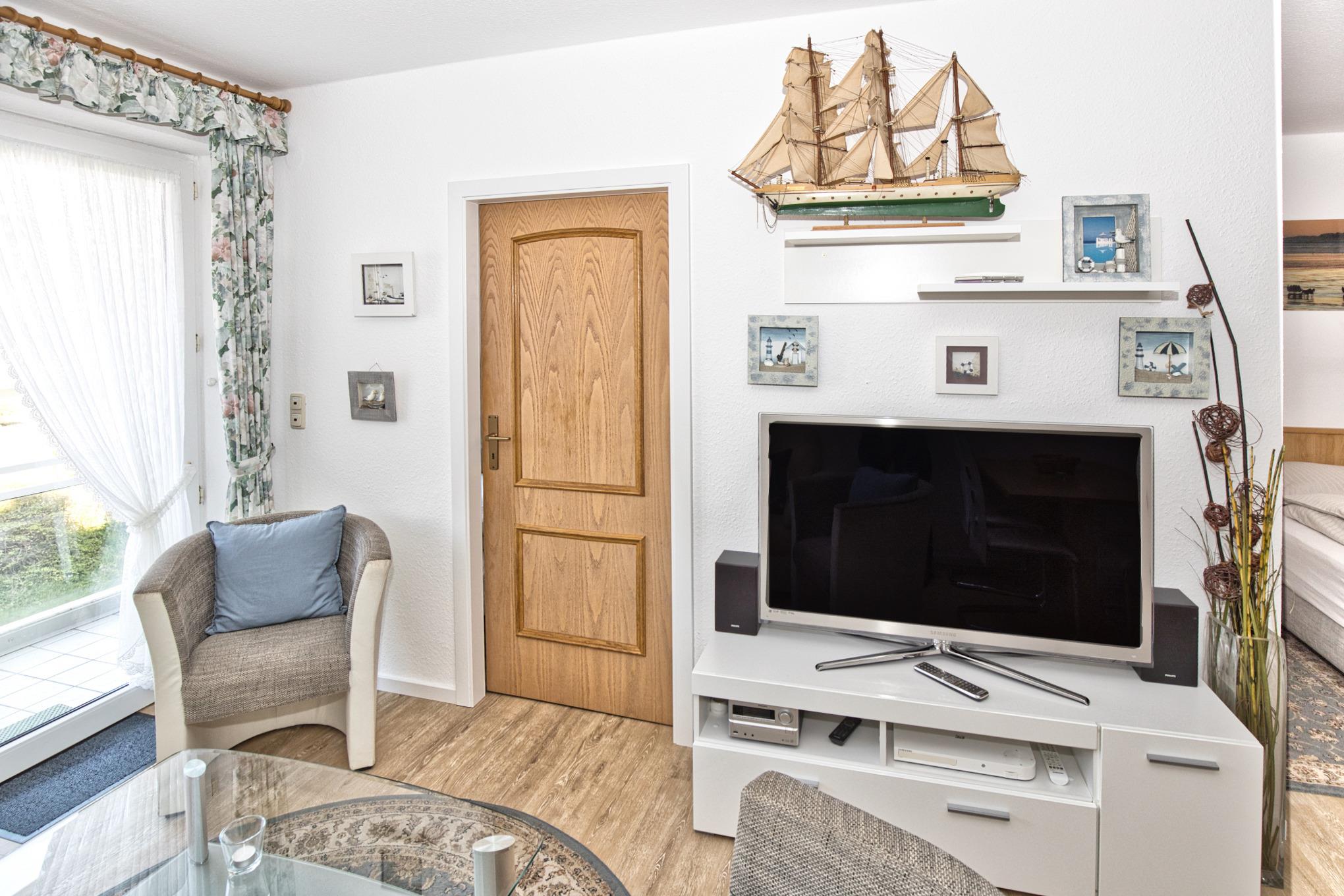 Wohnbereich mit Couch, TV und DVD-Player