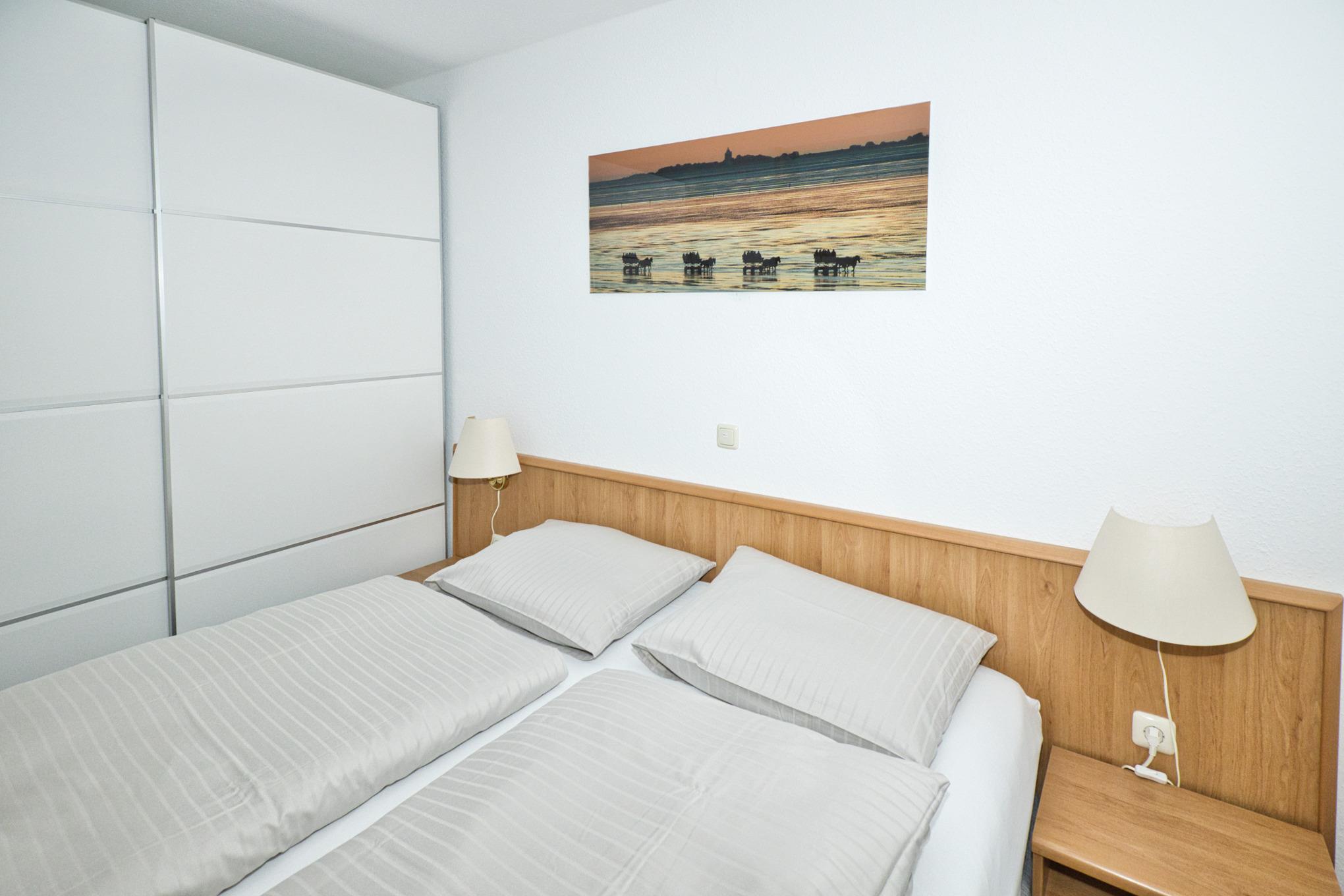 Die Wohnung verfügt über zwei voneinander getrennte Schlafbereiche. Im Wohnraum ist ein Doppelbett in einer Nische untergebracht. Zusätzlich gibt es ein separates Schlafzimmer mit zwei Einzelbetten.