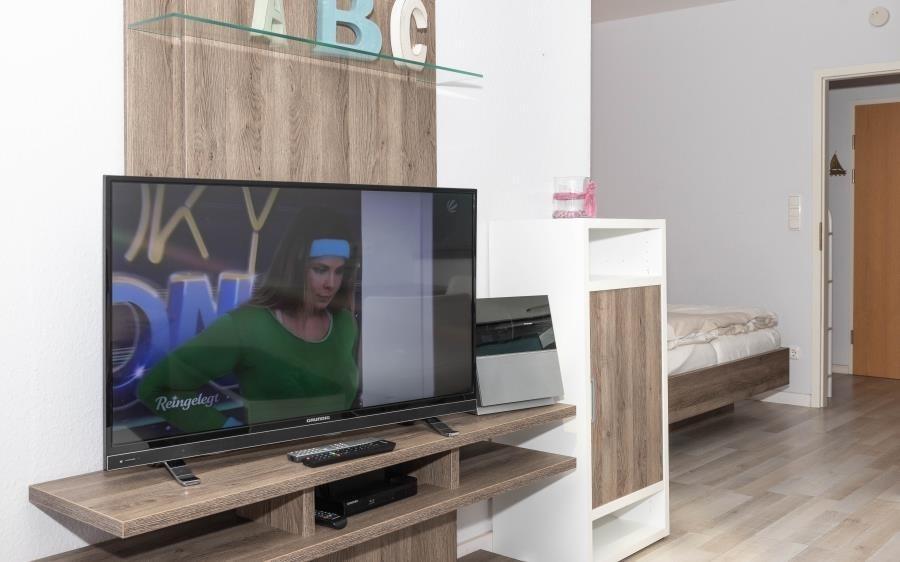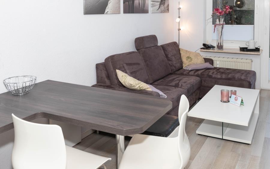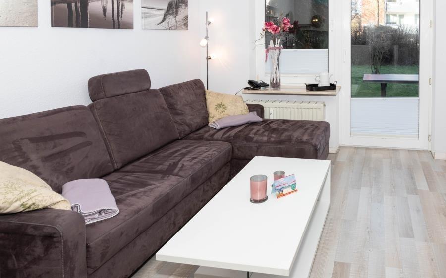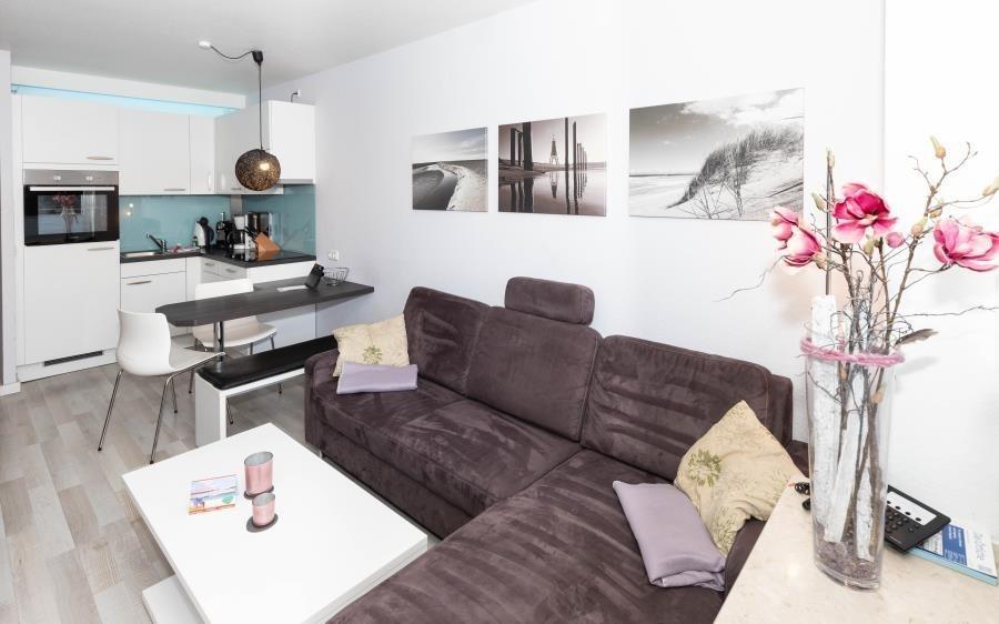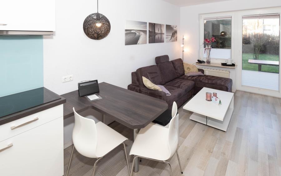 Der kombinierte Wohn-, Ess- und Schlafbereich wurde praktisch gestaltet und verbindet mehrere Funktionen in einem Raum. Das Doppelbett ist in einer Nische integriert, was eine klare räumliche Struktur schafft, ohne den Wohnbereich zu sehr einzuschränken. Eine Couch, TV und DVD-Player ermöglichen entspannte Stunden nach einem Strandtag, und durch die Terrassentür gelangt man direkt auf die sonnige Westterrasse.