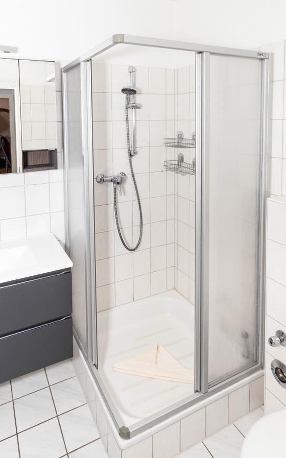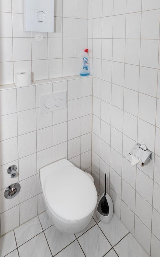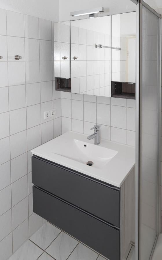 Der Eingangsbereich bietet Stauraum für Jacken und Kleinigkeiten. Das Badezimmer ist hell gefliest und funktional ausgestattet.