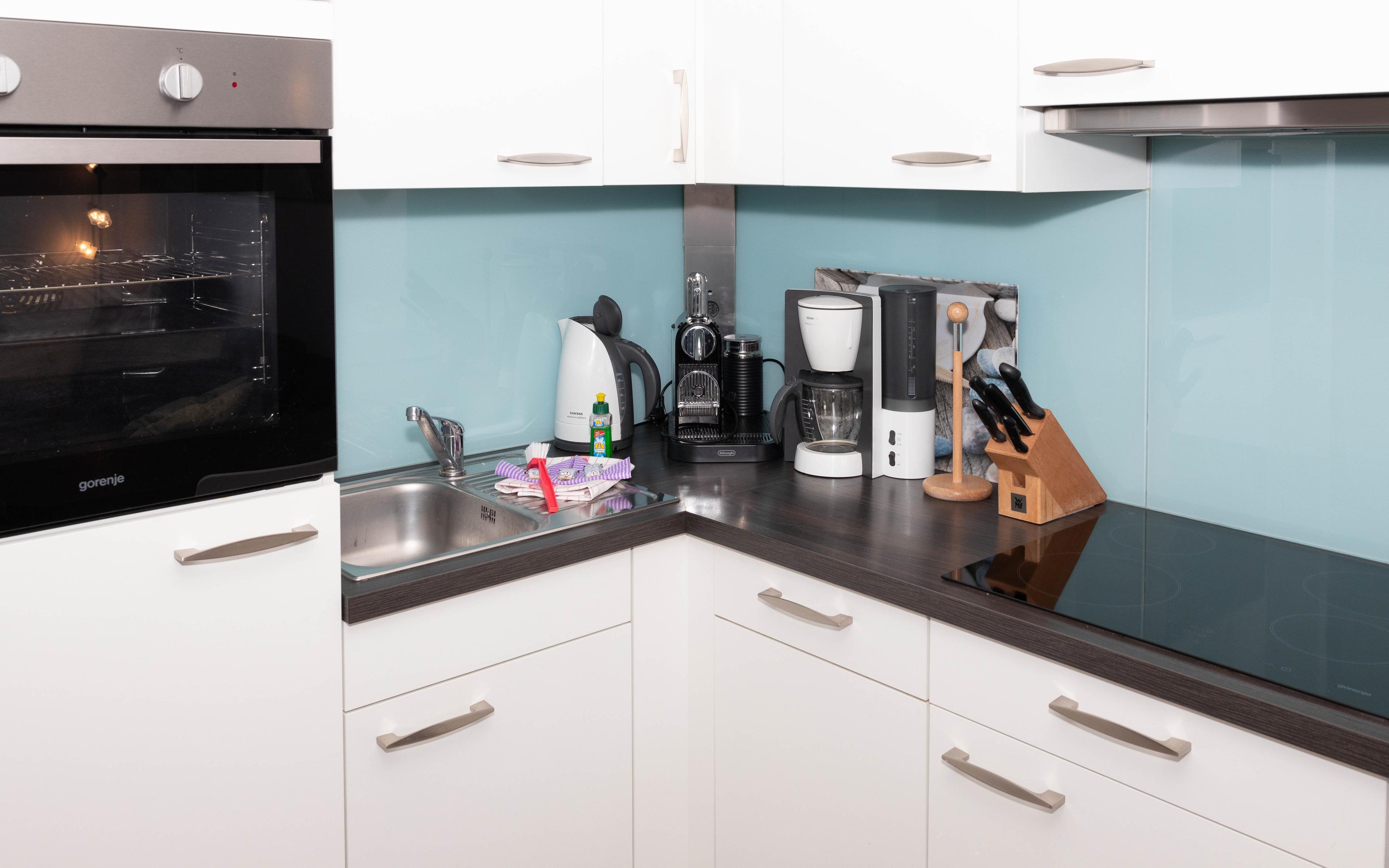 Die Küche ist klein, aber für den Ferienalltag ausreichend ausgestattet. Sie fügt sich offen in den Wohnraum ein und bietet Platz für gemeinsame Mahlzeiten.