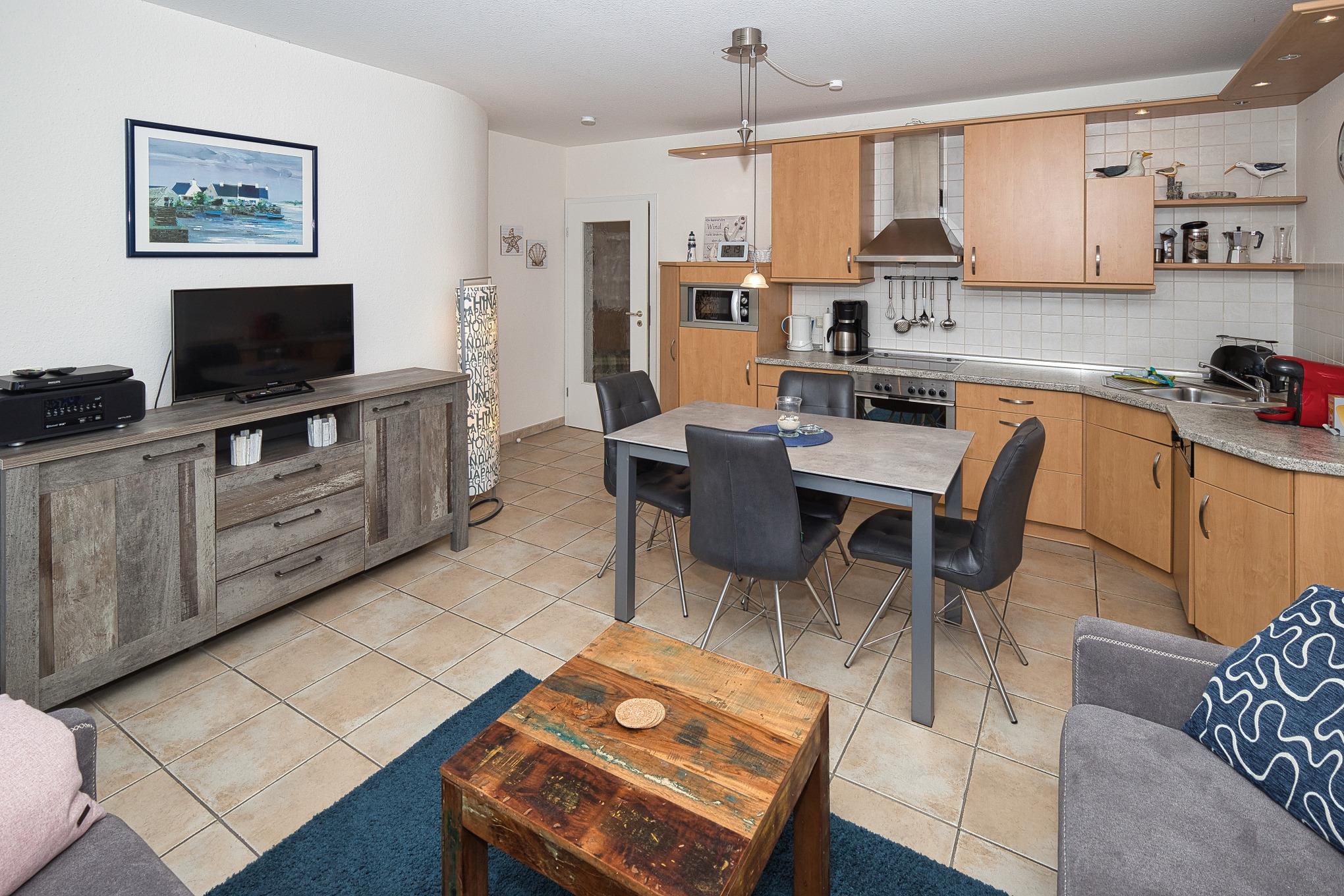 Die Wohnung selbst bietet eine gemütliche und komfortable Atmosphäre. Der Wohn- und Essbereich lädt zum Verweilen ein und ist gut ausgestattet. Die offene Einbauküche fügt sich nahtlos in den Wohnbereich ein und bietet alles, was man für die Zubereitung von Mahlzeiten benötigt. Vom Wohnbereich aus gelangen Sie auf den Westbalkon, wo Sie die frische Luft genießen und den Tag ausklingen lassen können.