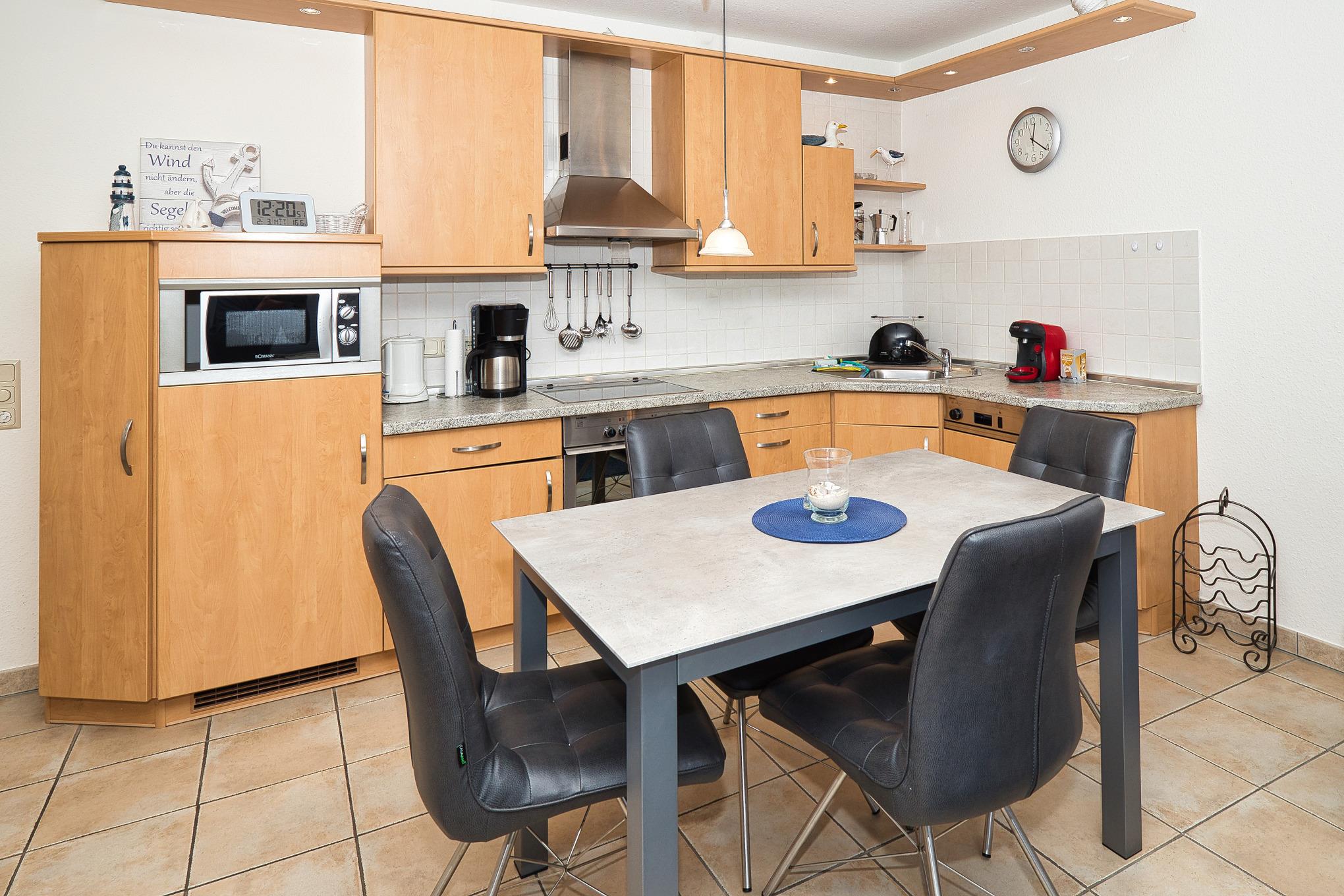 Um den Start in den Urlaub zu erleichtern, bietet die Wohnung eine Erstausstattung, die alles Notwendige enthält, um den Aufenthalt angenehm zu gestalten. Dazu gehören bezogene Betten, ein Fewo-Starterpaket mit Duschvorleger, Geschirrtuch, Geschirrspültabs, Spülmittel, Spülbürste, Spültuch, Toilettenpapier, Müllbeutel und vieles mehr.