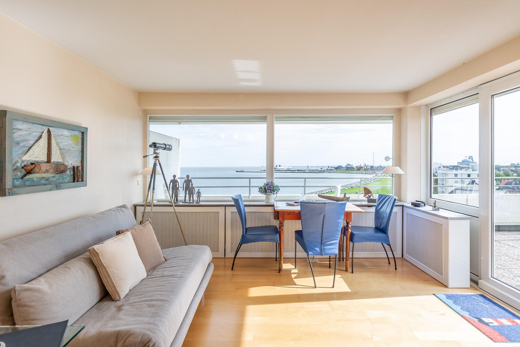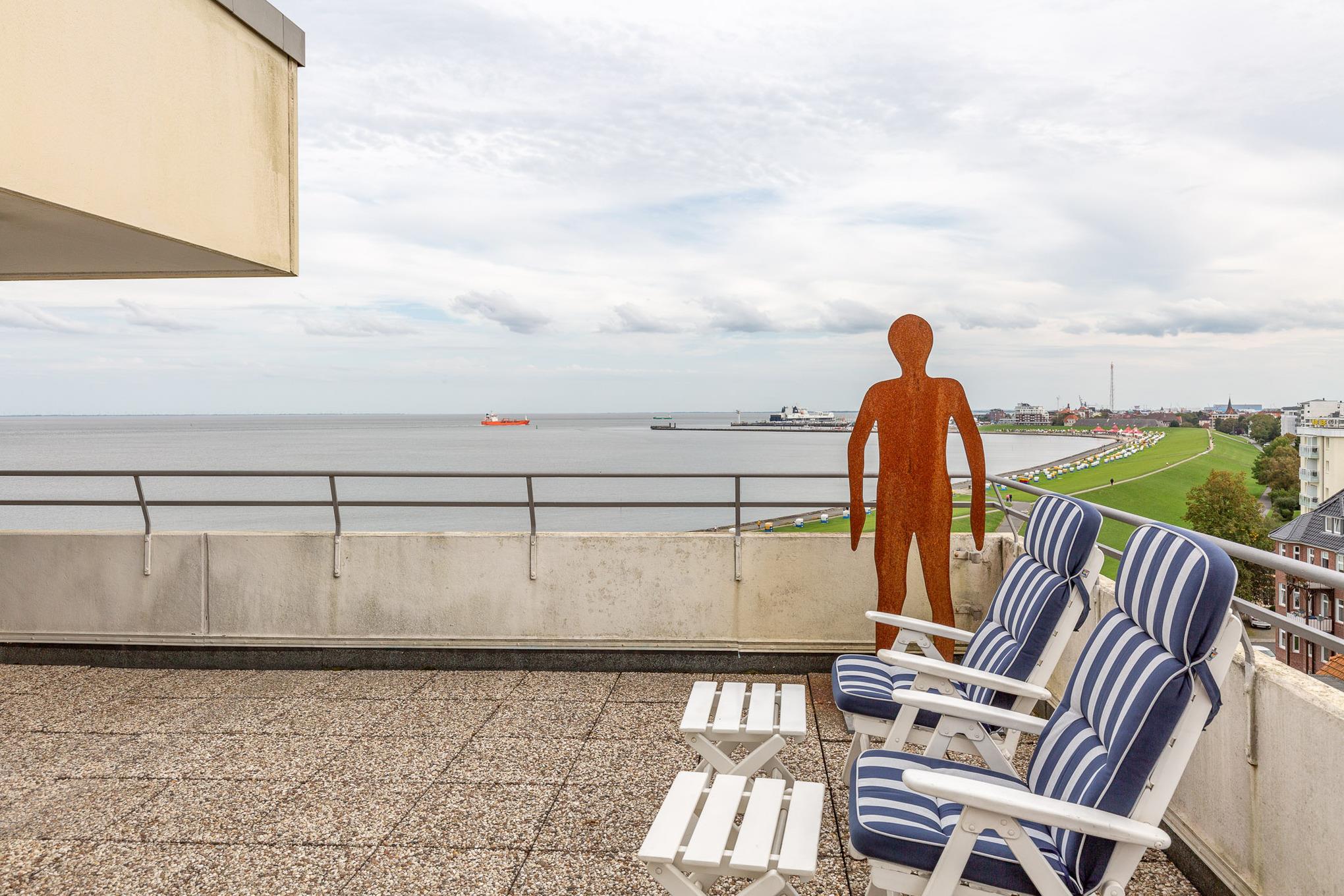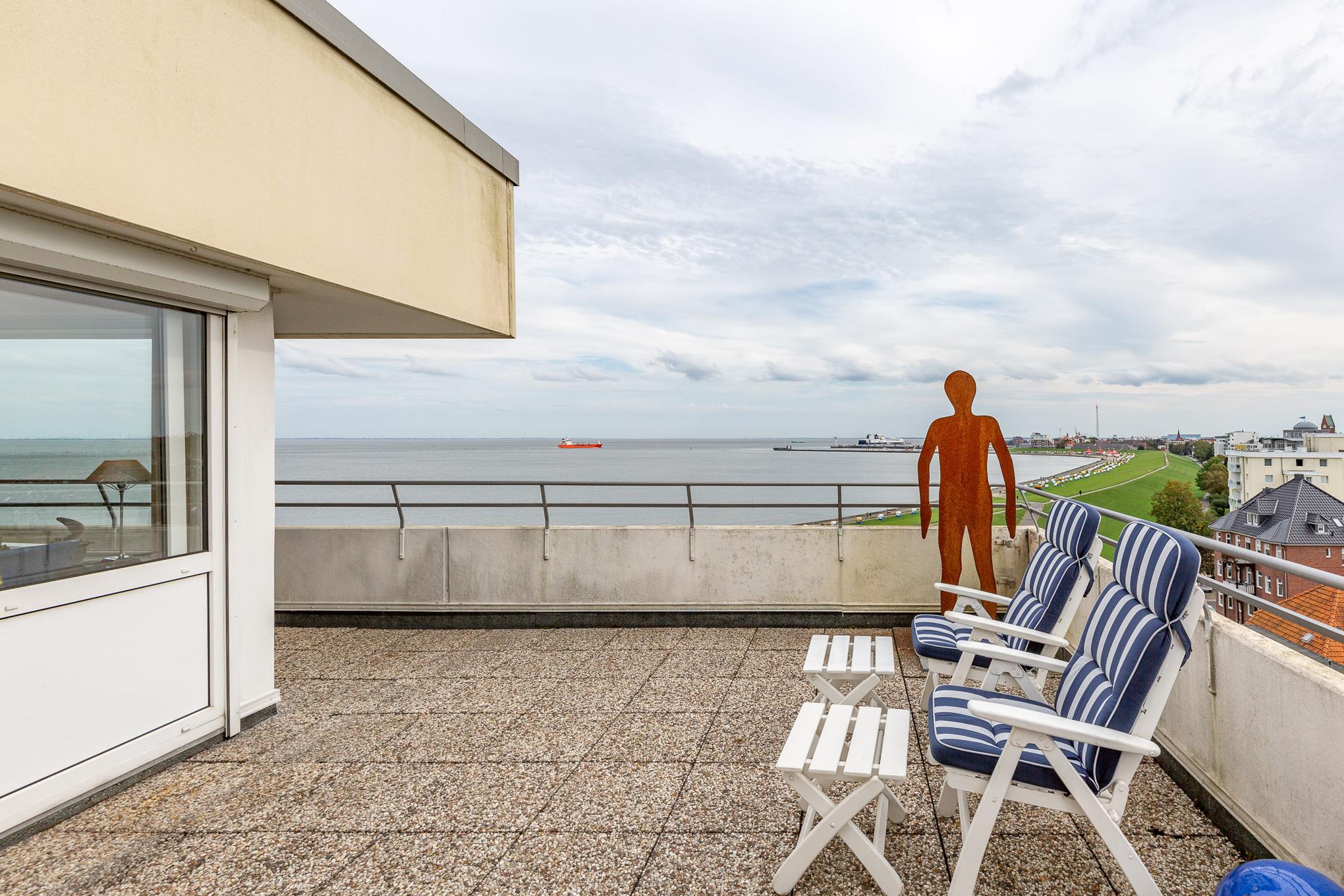 Einzigartig. Mehr Meerblick geht nicht! Die Eck-Ferienwohnung befindet sich in der 8. Etage und bietet einen einzigartigen180 Grad-Ausblick auf den Schifffahrtsweg, die Grimmershörnbucht und den Hafen. Auf 60 m² bietet die exklusive Eck-Wohnung mit Penthouse-Charakter ein separates Schlafzimmer, einen lichtdurchfluteten Wohnbereich und eine Sonnenterrasse. Auf der Dachterrasse mit Strandkorb genießen Sie ganztägig die Sonne mit Blick auf die Elbe.