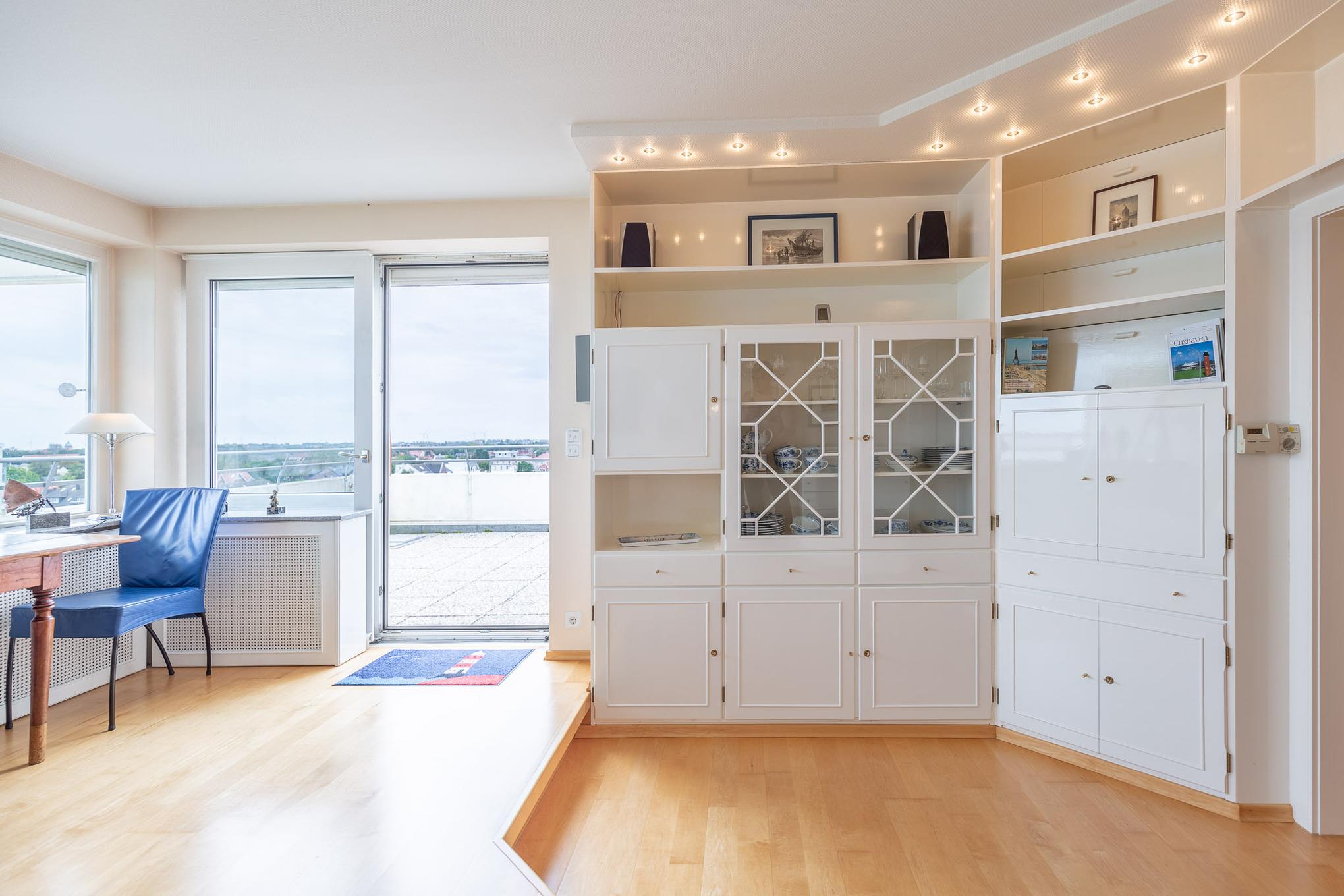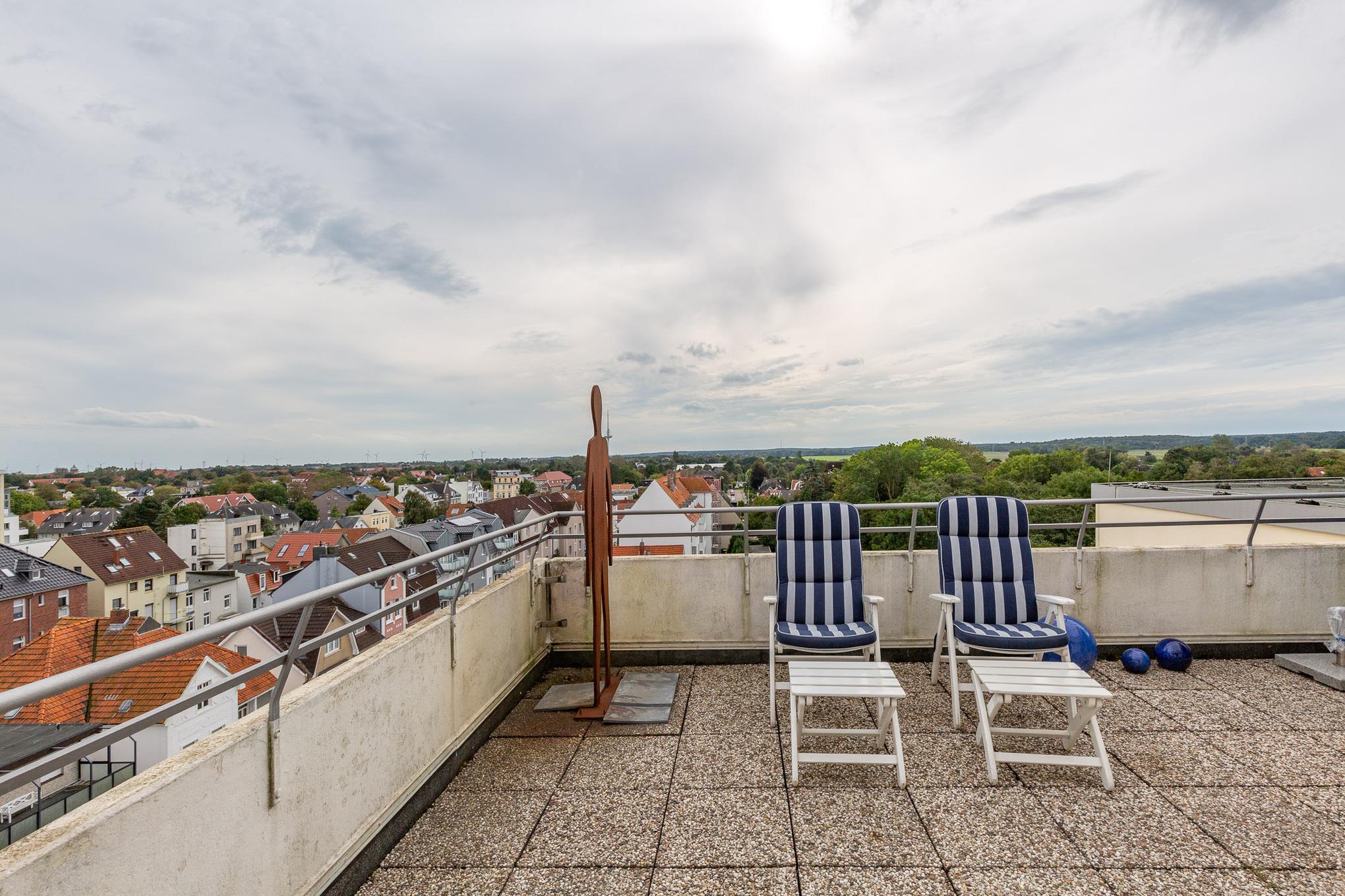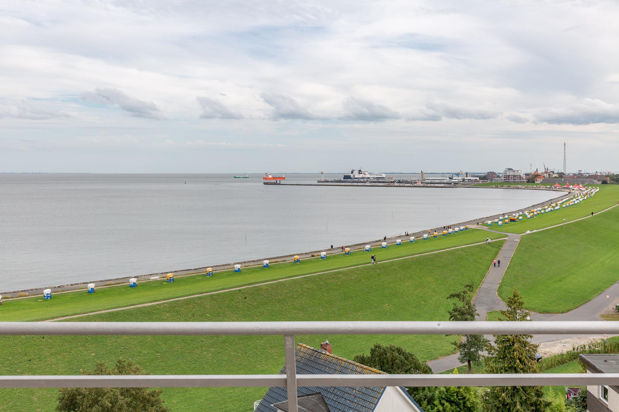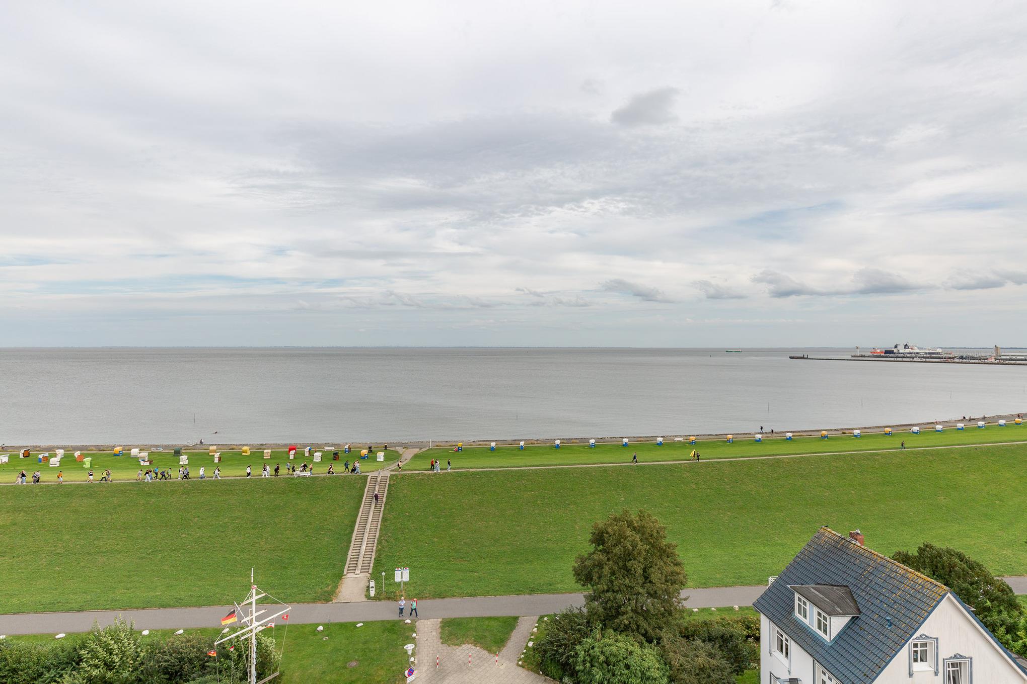 Einzigartig. Mehr Meerblick geht nicht! Die Eck-Ferienwohnung befindet sich in der 8. Etage und bietet einen einzigartigen180 Grad-Ausblick auf den Schifffahrtsweg, die Grimmershörnbucht und den Hafen. Auf 60 m² bietet die exklusive Eck-Wohnung mit Penthouse-Charakter ein separates Schlafzimmer, einen lichtdurchfluteten Wohnbereich und eine Sonnenterrasse. Auf der Dachterrasse mit Strandkorb genießen Sie ganztägig die Sonne mit Blick auf die Elbe.