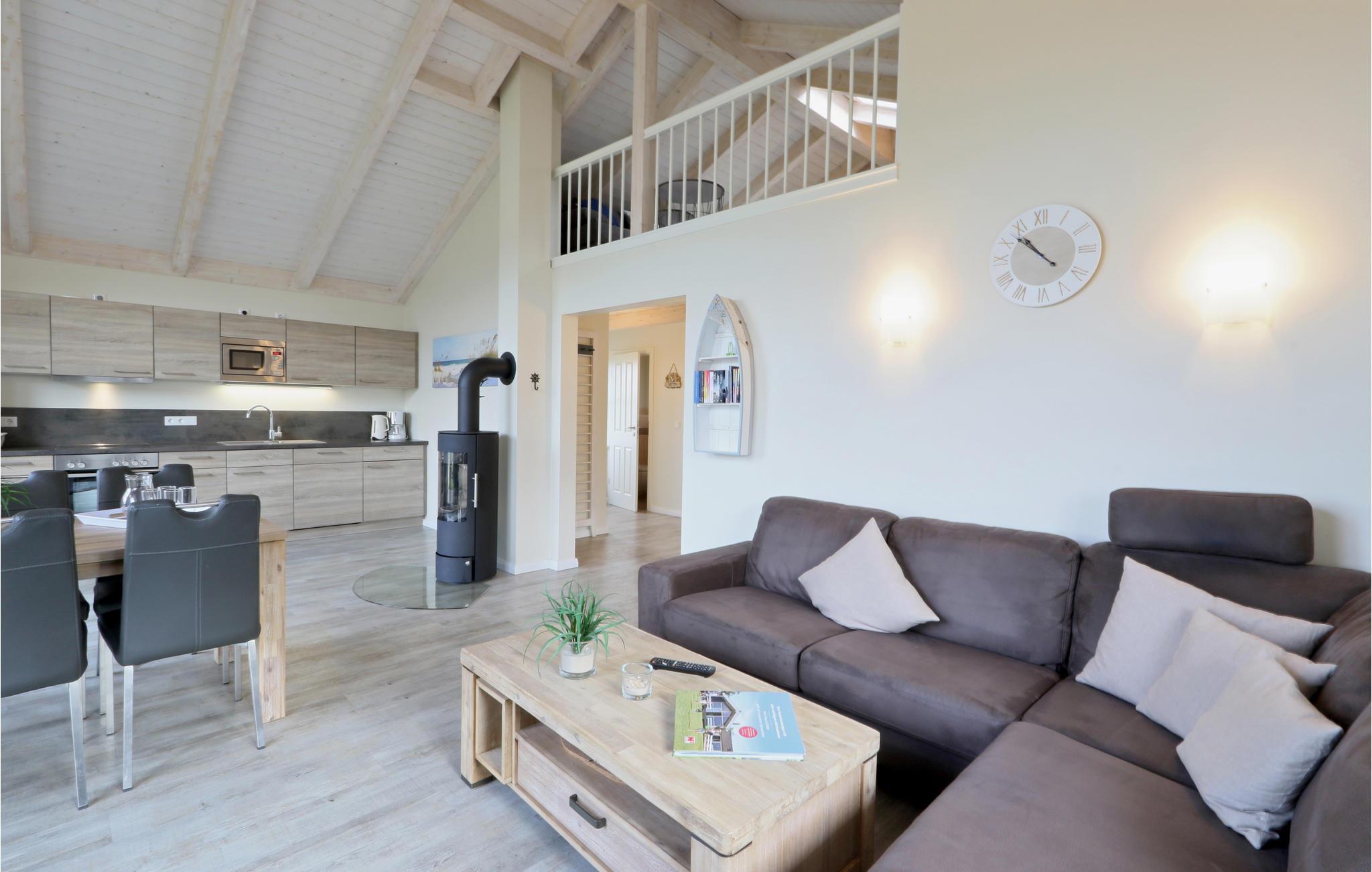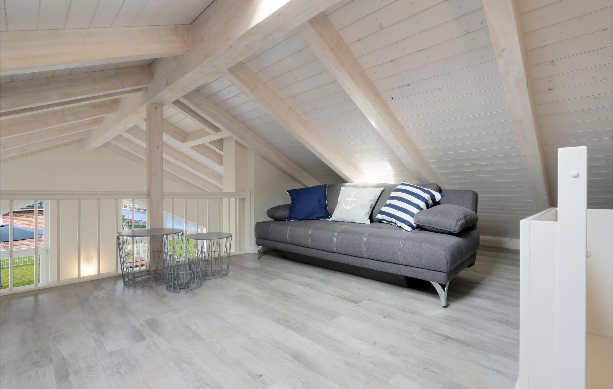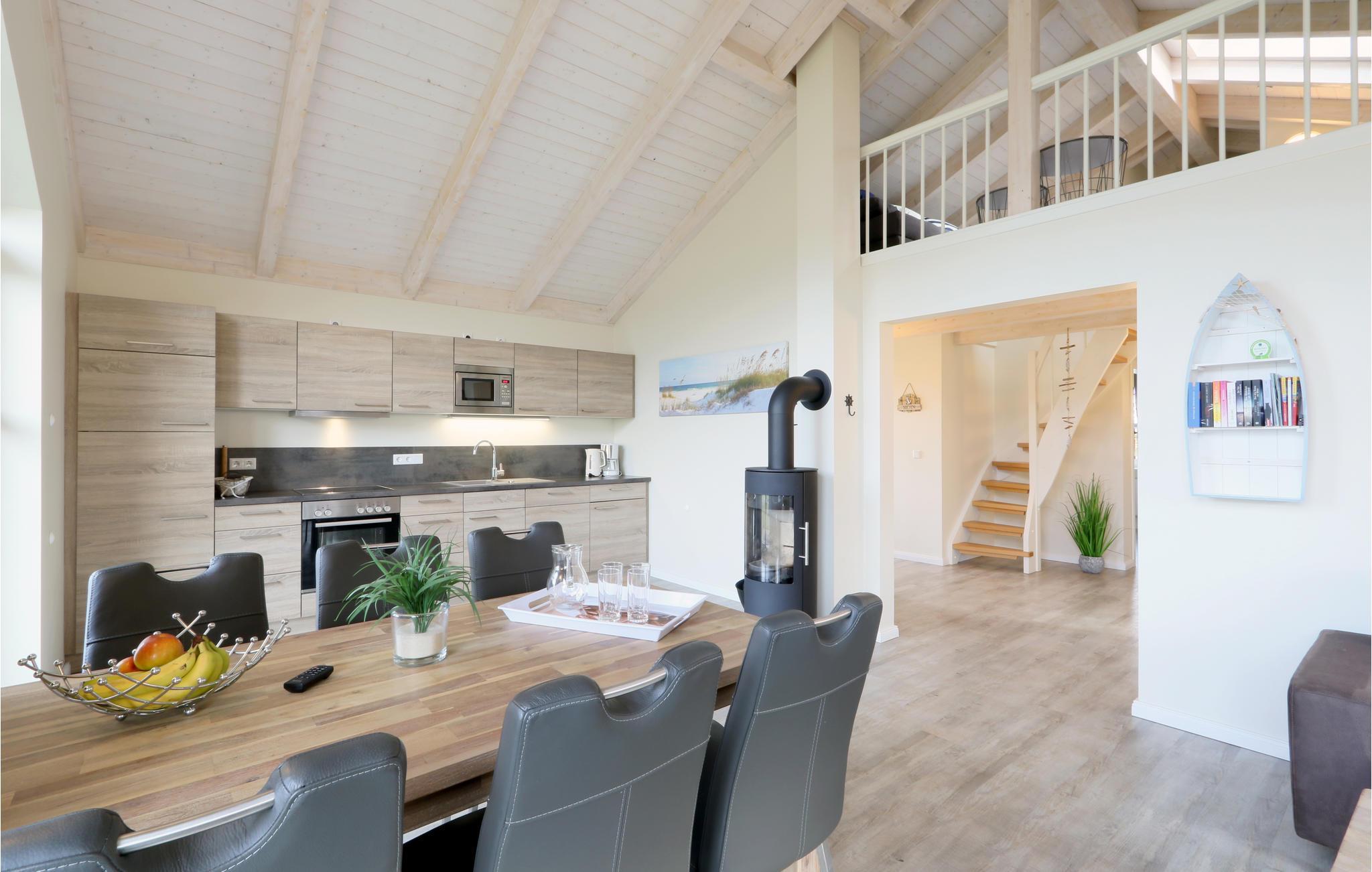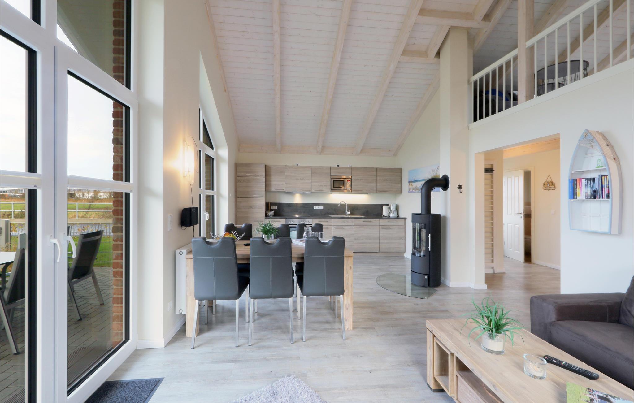 Das Haus ist mit hochwertigen Möbeln ausgestattet und alle Räume sind großzügig gestaltet. Dank der hauseigenen Sauna und des gemütlichen Kaminofens ist das Haus auch in der kalten Jahreszeit ein wahres Highlight. Nach einem langen Spaziergang am Deich entlang, können Sie es sich hier gemütlich machen und sich wieder aufwärmen. Ein DVD-Player sowie ein Bücherregal mit vielen Büchern steht für Sie bereit, sodass Ihnen hier garantiert nicht langweilig wird. Auf der Galerie befindet sich ein gemütliches Sofa, das einen entspannten Rückzugsort bietet.