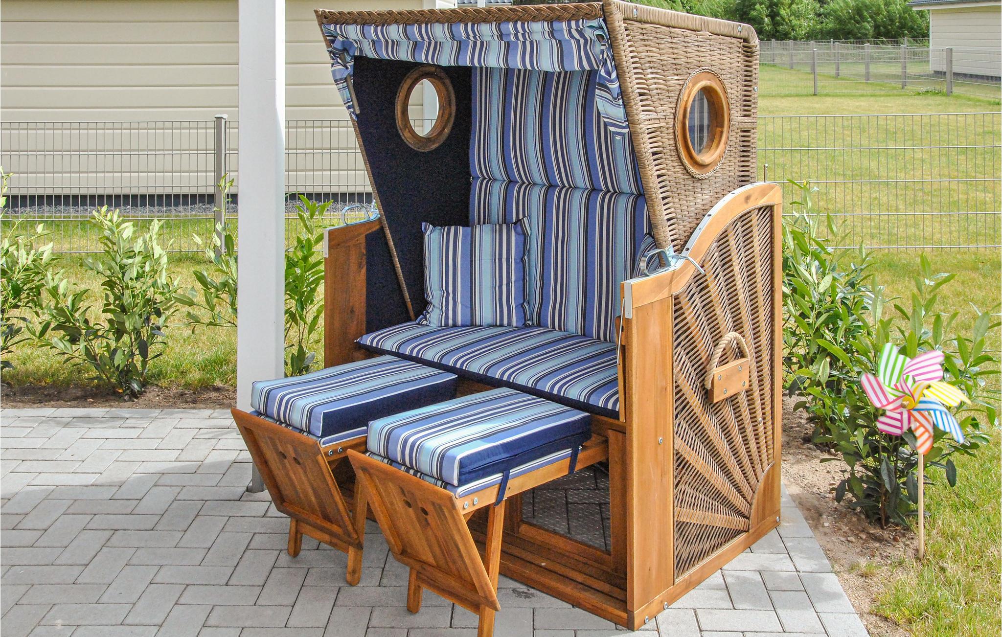 Auch der Außenbereich ist liebevoll gestaltet. Sie können im Strandkorb entspannen und die Nordseeluft genießen. Zudem stehen ein Hochstuhl und Kindergeschirr bereit.
