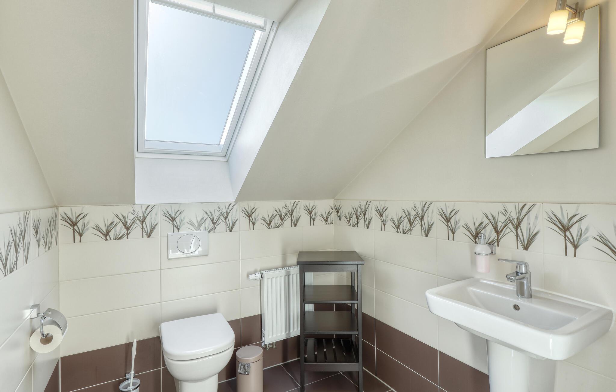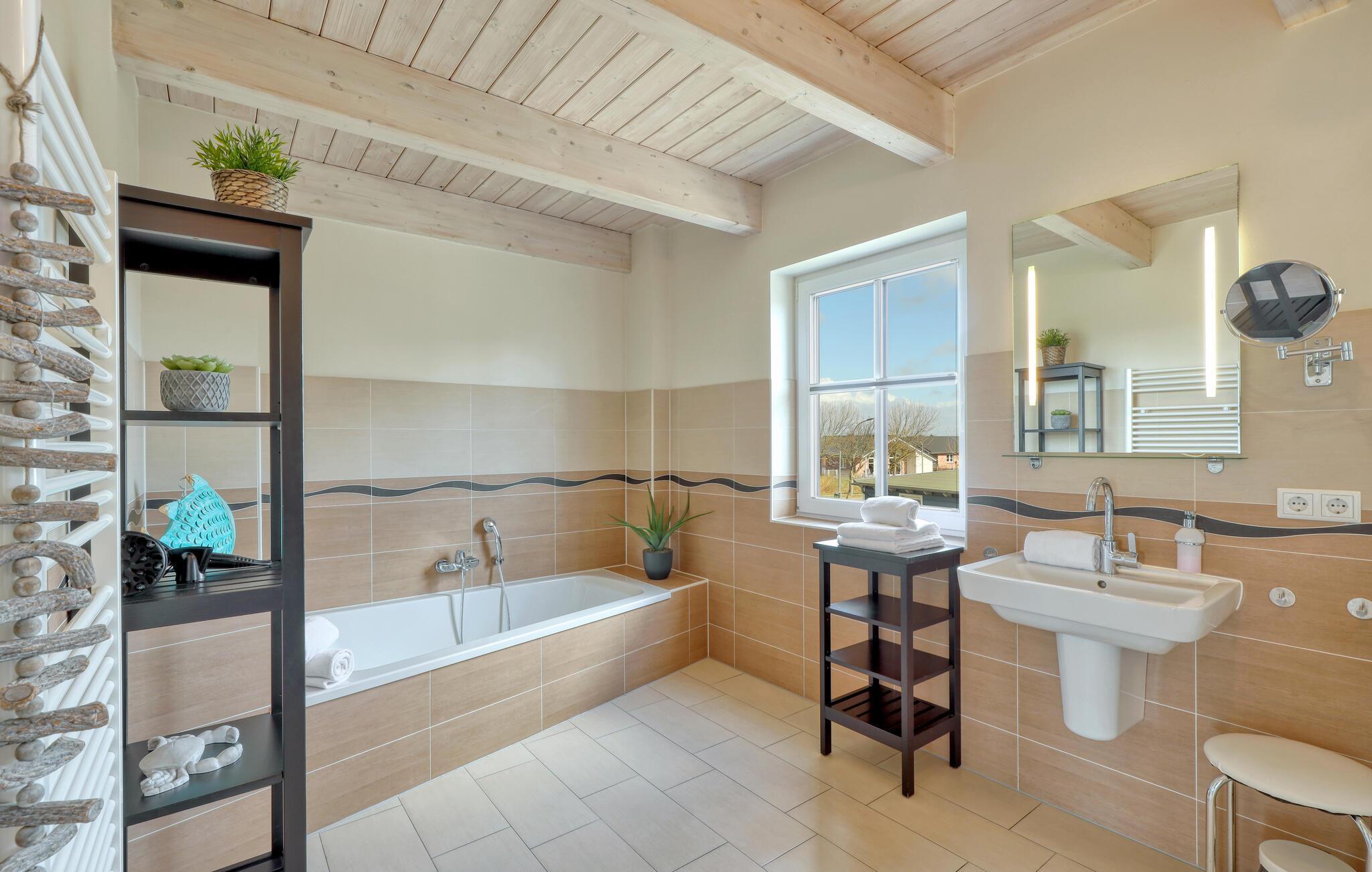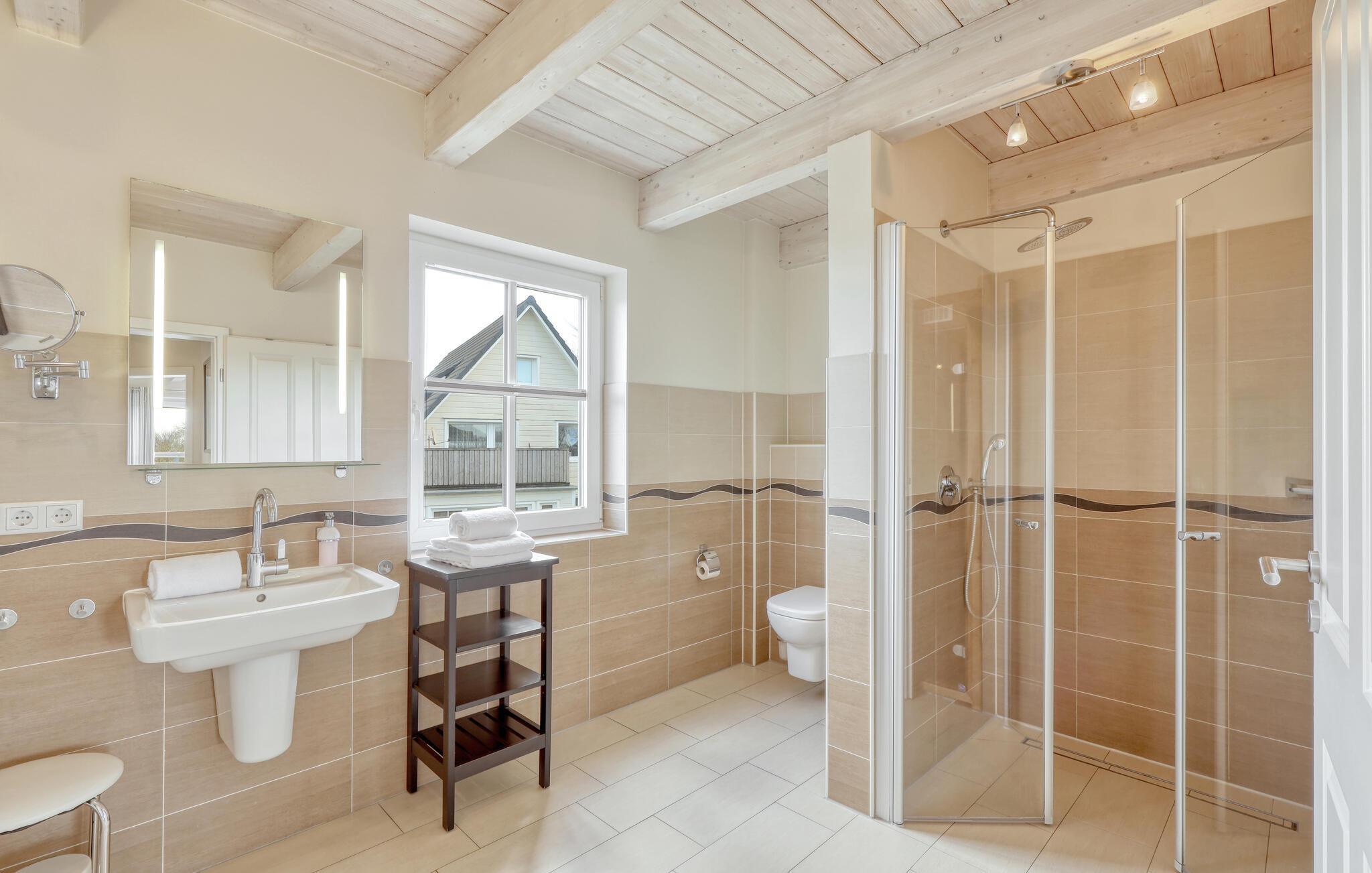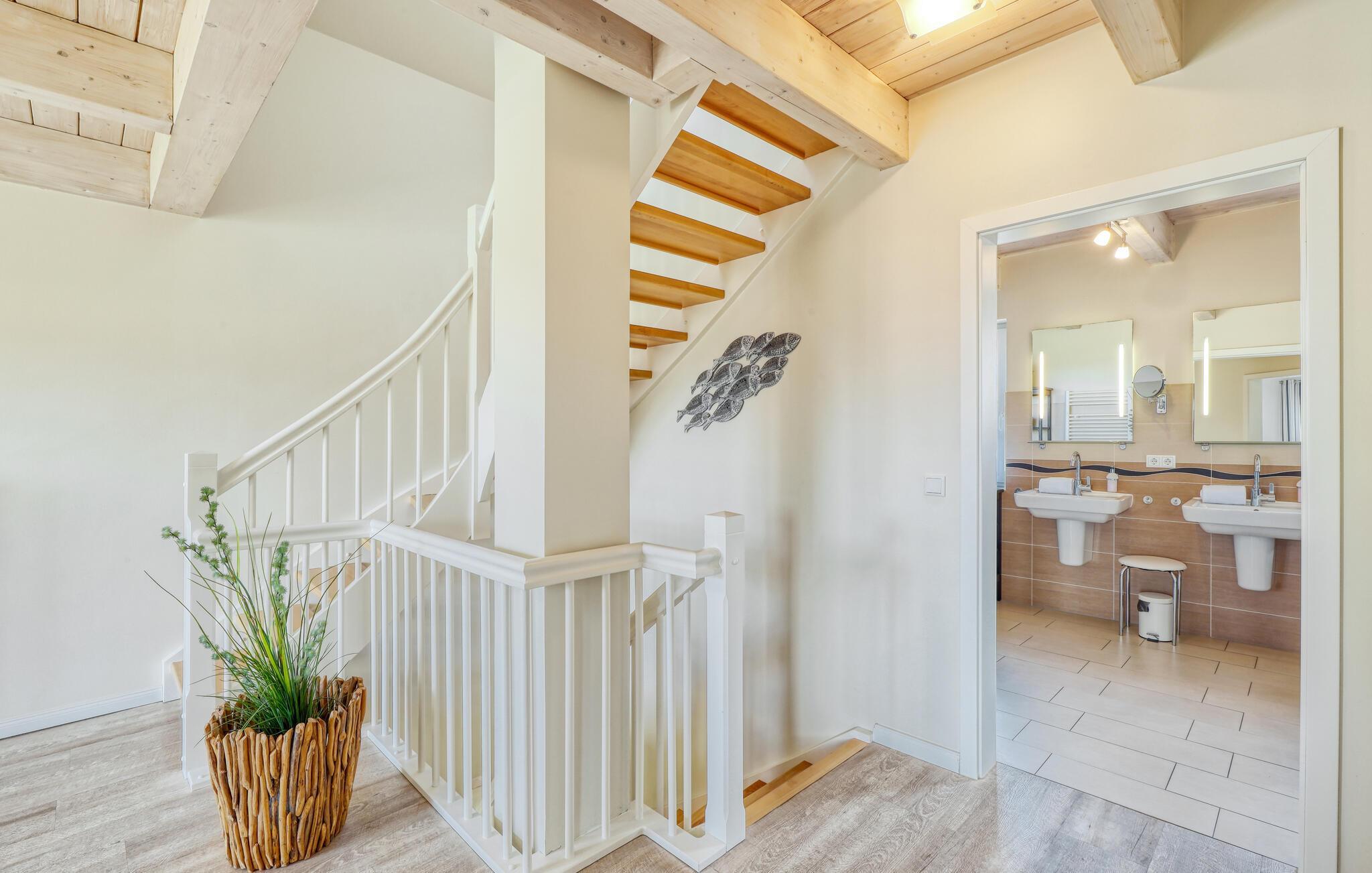 Eines der Schlafzimmer liegt ebenso wie eines der Badezimmer (mit Dusche ohne Einstiegsschwellen) im Erdgeschoss, so dass das Haus auch für Gäste sehr gut geeignet ist, die die Treppe in die oberen Stockwerke nicht so gut bewältigen können.