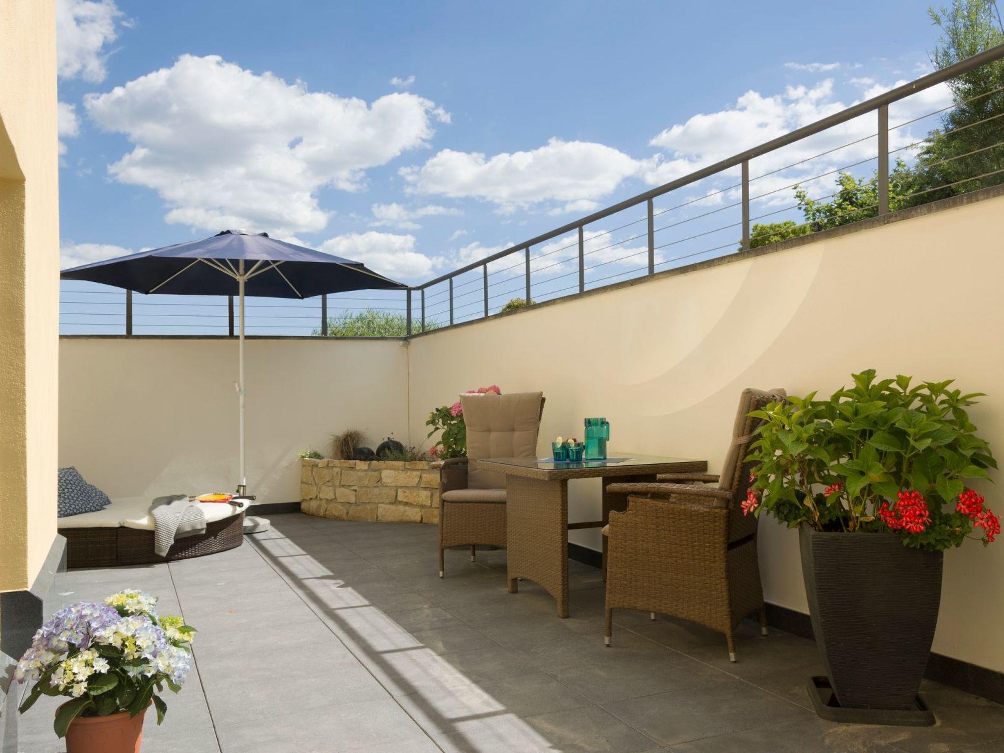 Ihnen steht eine große Terrasse mit gemütlichen Lounge-Möbeln zum Entspannen zur Verfügung. Genießen Sie zur Eigennutzung auch den neu angelegten Saunagarten mit Strandkorb. PKW Stellplatz steht Ihnen kostenfrei zur Verfügung.