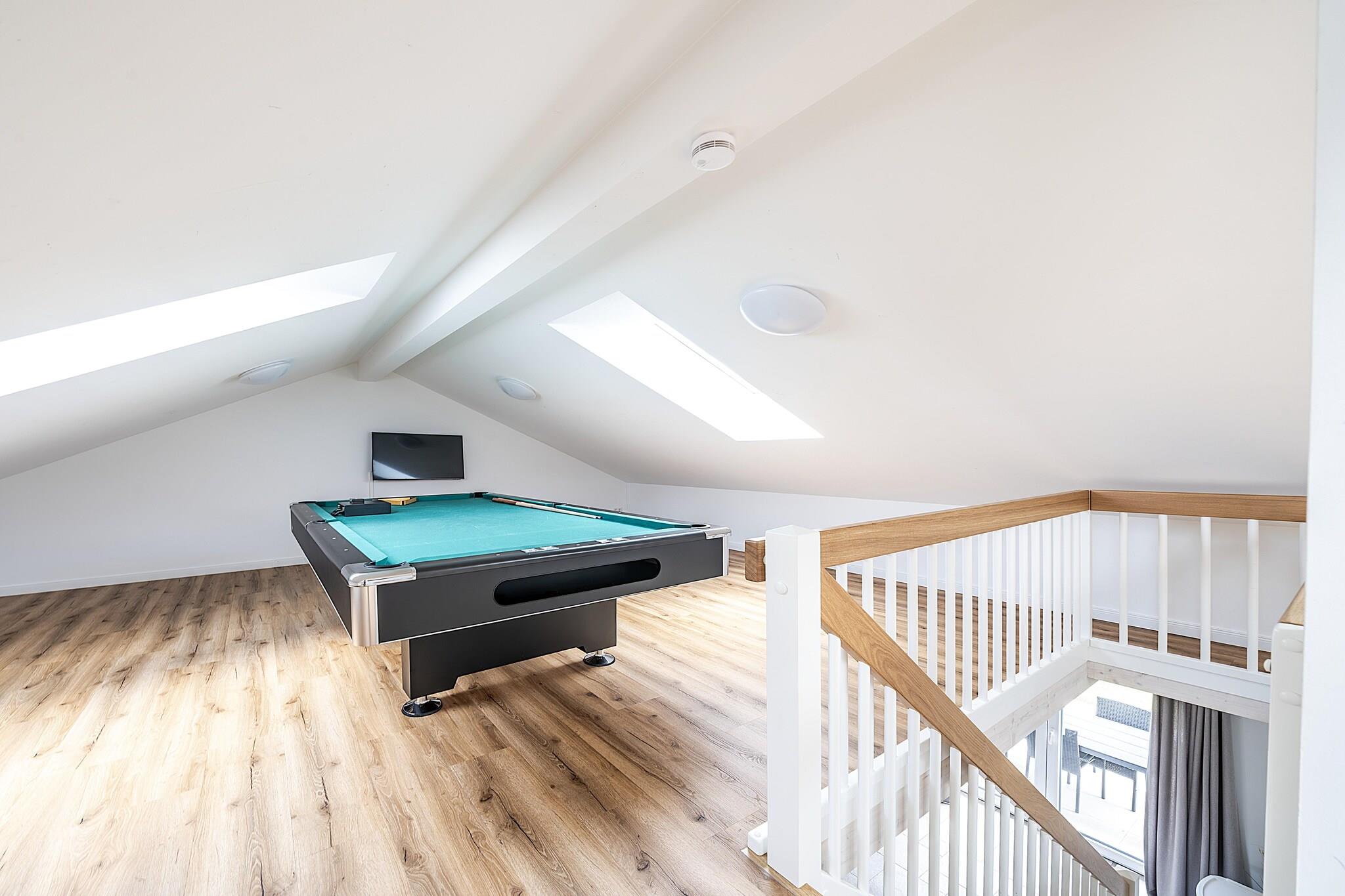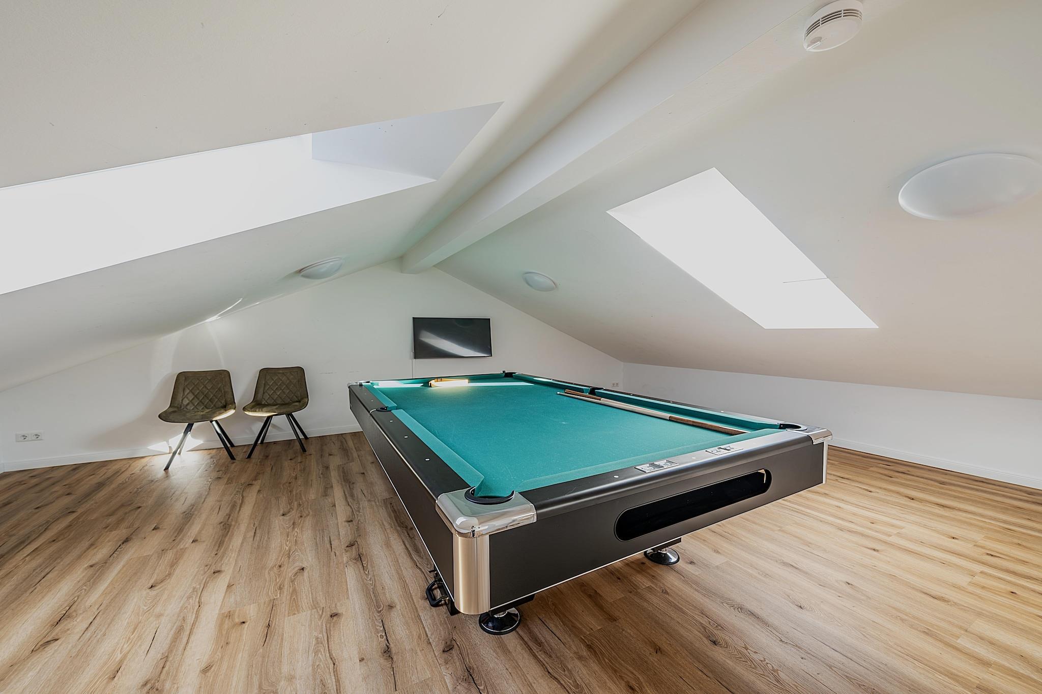 Parterre: (offene Küche(Kochplatte(4 Kochplatten, Ceranfeld), Wasserkocher, Toaster, Dunstabzugshaube, Kaffeemaschine, Backofen, Mikrowelle, Spülmaschine, Kühl-/Gefrierkombination), Wohn/Esszimmer(TV(Flatscreen, Satellit), Esstisch, Kaminofen, Sitzecke, Radio), Schlafzimmer(Doppelbett(180 x 200 cm)), Schlafzimmer(Doppelbett(180 x 200 cm)), Schlafzimmer(Doppelbett(180 x 200 cm)), Schlafzimmer(Doppelbett(180 x 200 cm)), Schlafzimmer(Einzelbett(90 x 200 cm), Einzelbett(90 x 200 cm)), Schlafzimmer(Einzelbett(90 x 200 cm), Einzelbett(90 x 200 cm)), Badezimmer(Dusche, Sauna, Waschbecken, Toilette, Föhn), Badezimmer(Dusche, Waschbecken, Toilette), Badezimmer(Dusche, Waschbecken, Toilette), Badezimmer(Dusche, Waschbecken, Toilette)) Dachgeschoss: (Empore(Billard, TV(Flatscreen, Satellit), Sitzecke, Tischfußball, Dart)) Trockner, Waschmaschine, Terrasse, Garten(alleinige Nutzung, umzäunt), Gartenmöbel, Grill, Parkplatz, Handtücher/Bettwäsche (extra Gebühr)