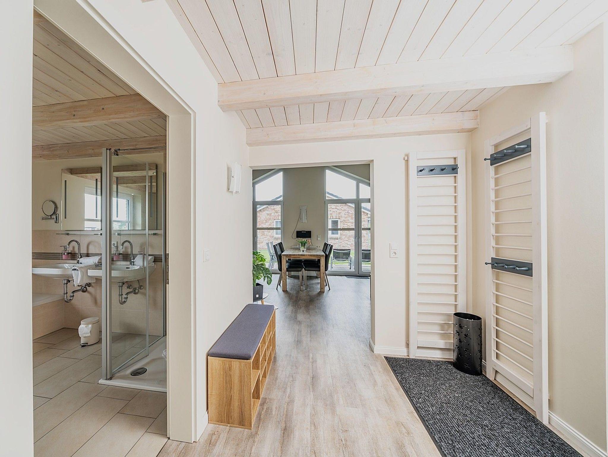 Dieses moderne, freistehende Ferienhaus in Dagebüll bietet auf 80 m² Platz für bis zu vier Personen und vereint hochwertige Ausstattung mit nordischem Wohlfühlambiente. Zwei Schlafzimmer mit Doppelbetten, ein großzügiges Bad mit Dusche und Badewanne sowie ein heller Wohn- und Essbereich mit Kaminofen schaffen zu jeder Jahreszeit eine angenehme Atmosphäre.