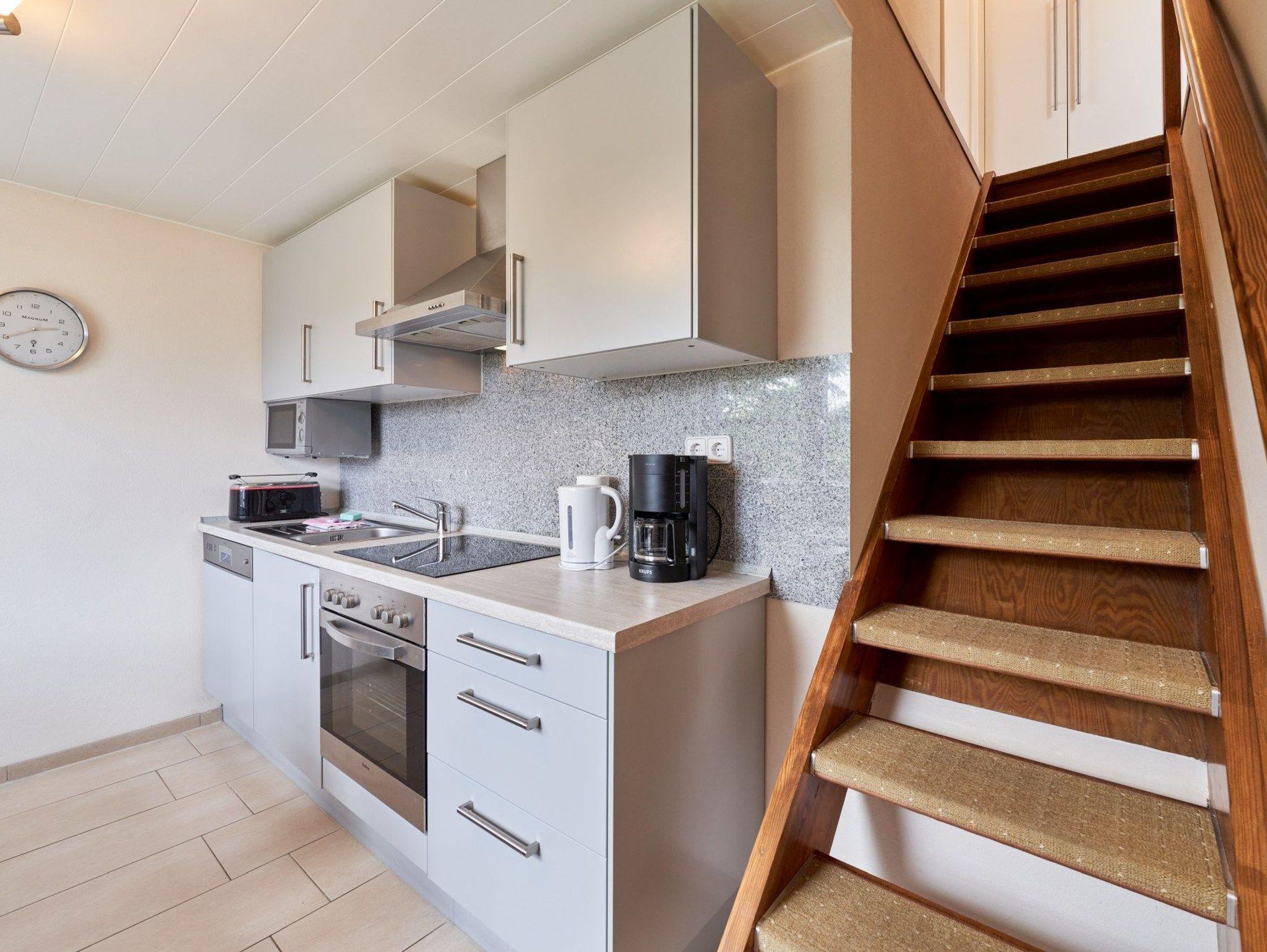 Die offene Einbauküche ist komplett ausgestattet mit einem Herd inkl. Backofen und Cerankochfeld, Geschirrspüler, Kühlschrank mit Gefrierfach, Kaffeemaschine, Toaster, Mikrowelle und Wasserkocher.