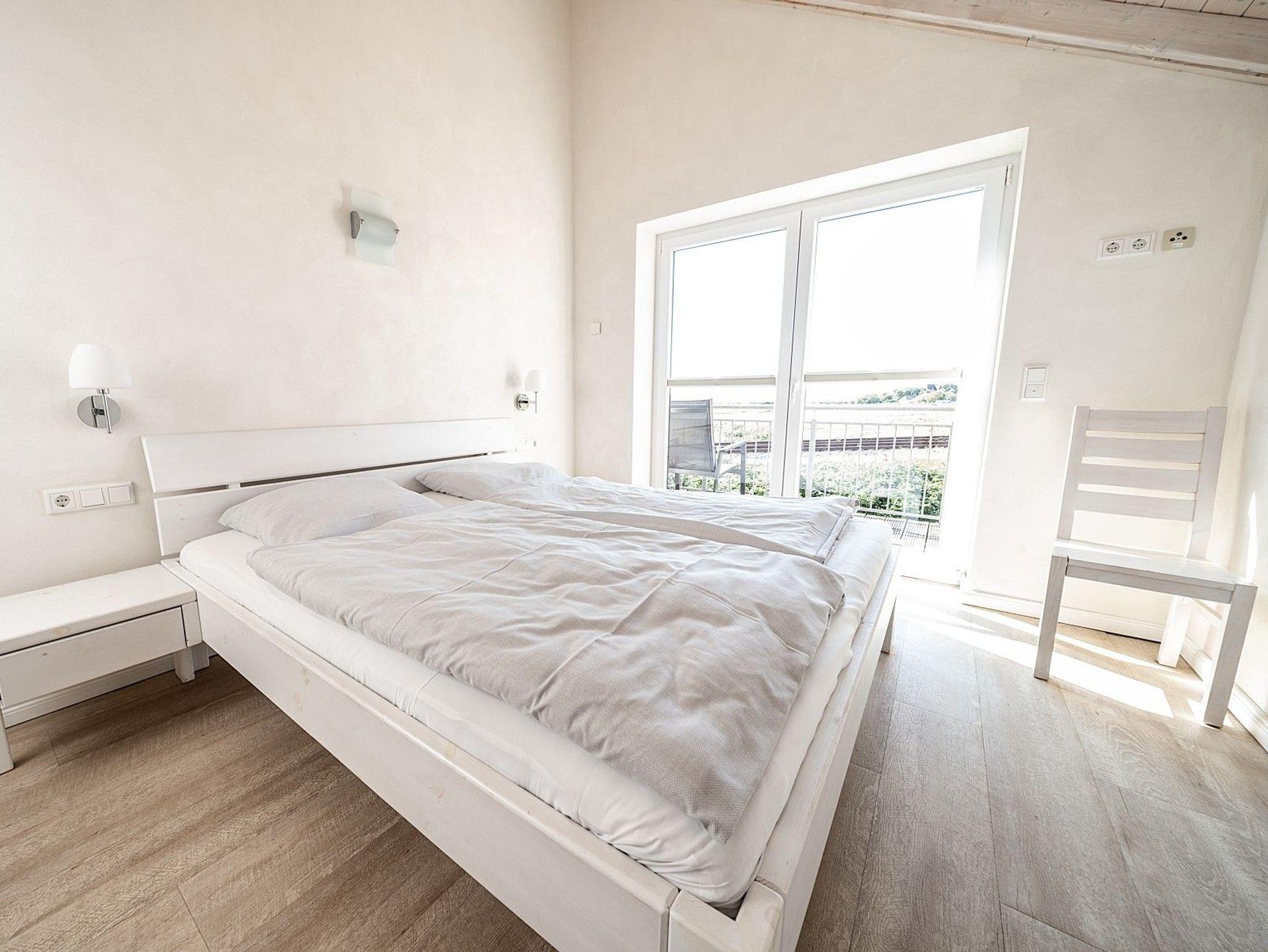 Das Einzelzimmer mit 1,20 m breitem Bett liegt ebenfalls im Erdgeschoss und eignet sich besonders für Gäste, die Treppen vermeiden möchten. Zwei weitere Schlafzimmer mit Doppelbetten befinden sich im Obergeschoss. Für Radfahrer ist eine abschaltbare Steckdose zum Laden von E-Bikes vorhanden, zudem steht eine eigene Waschmaschine bereit.