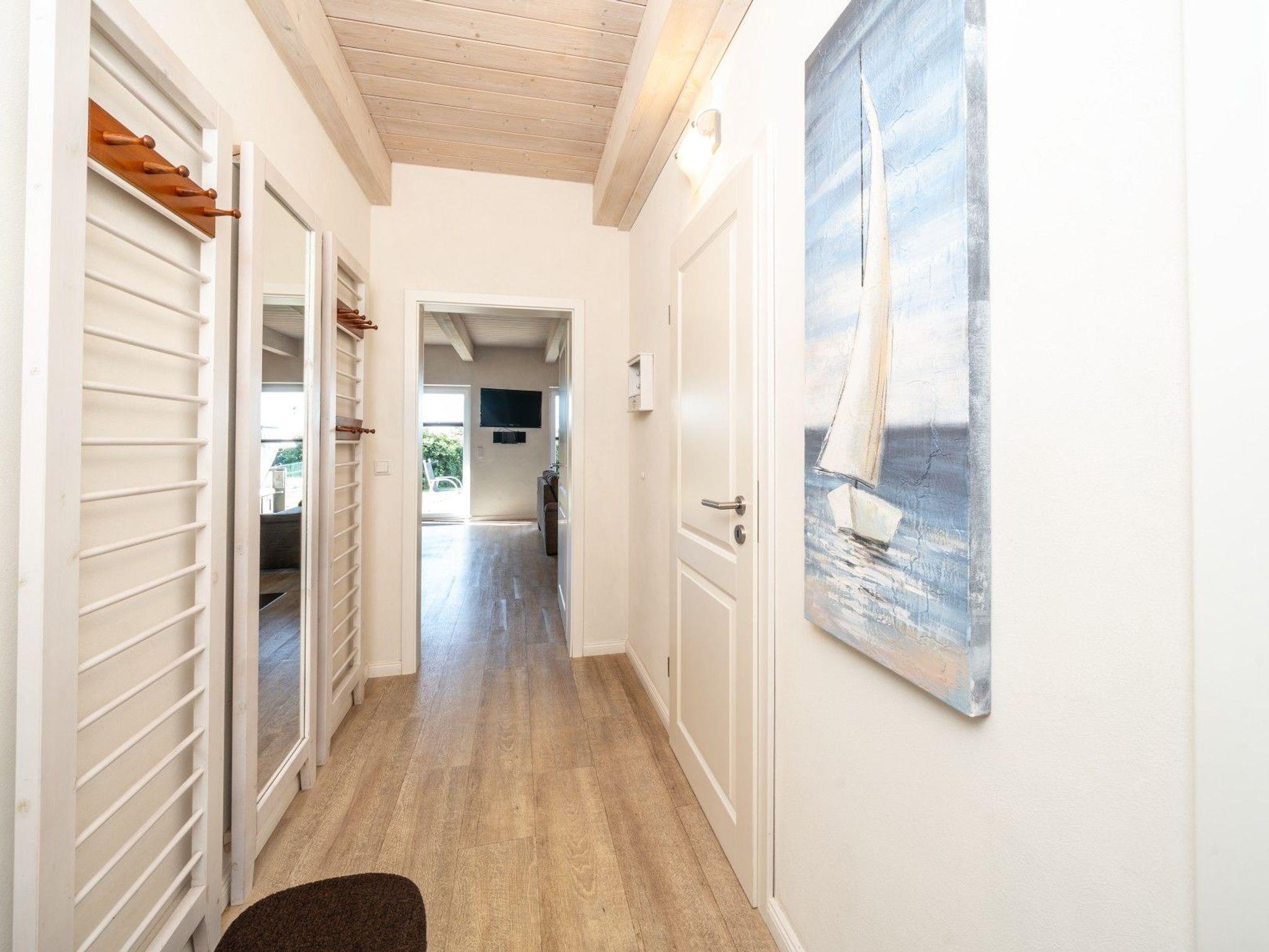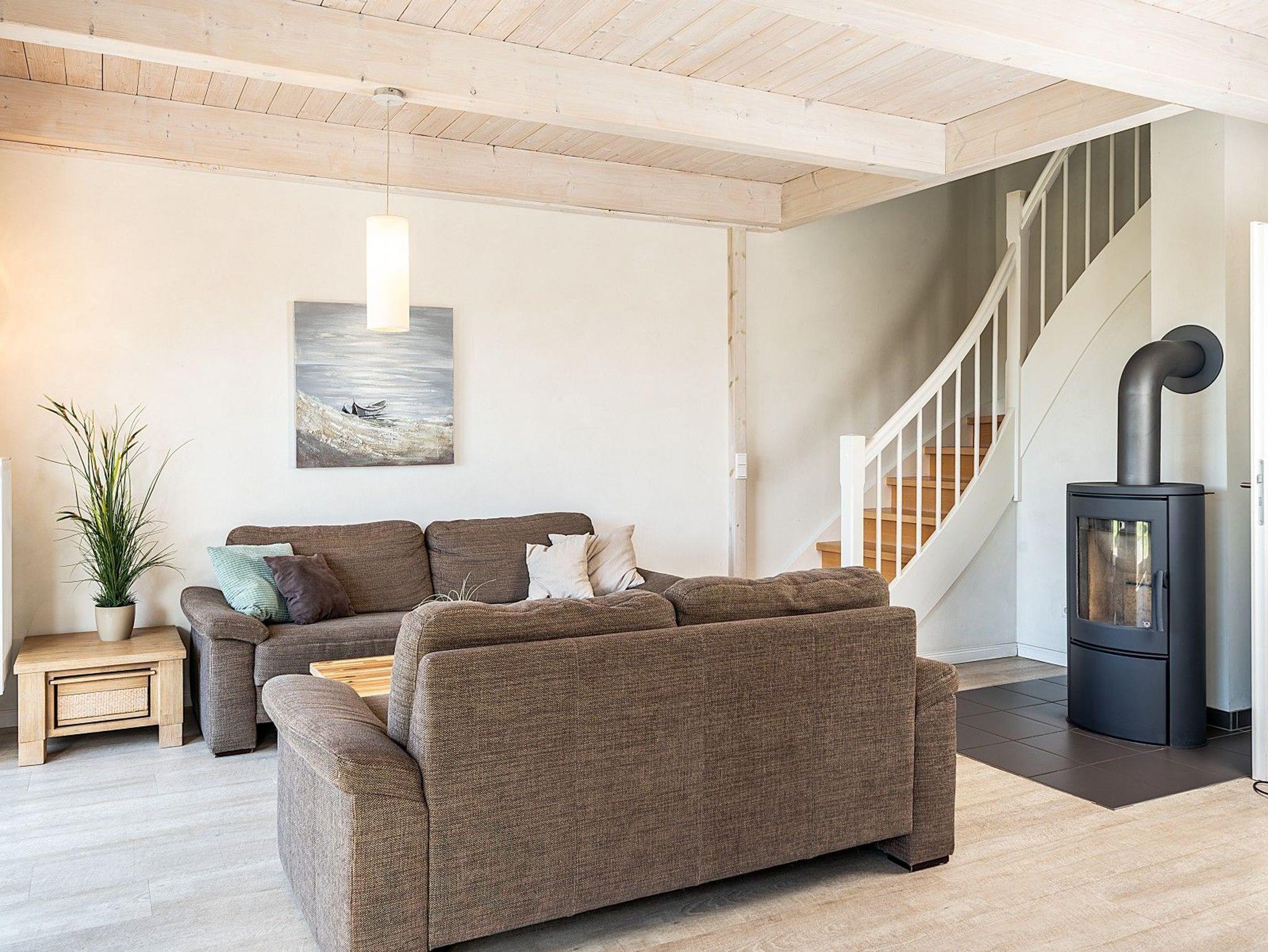 Im Inneren sorgt ein offener Wohn- und Essbereich mit moderner Küche, Kaminofen und gemütlicher Sofaecke für eine angenehme Atmosphäre. Das Obergeschoss verfügt über ein Wellnessbad mit großer Sauna und einer Badewanne im XXL-Format für zwei Personen. Im Erdgeschoss befindet sich ein barrierearmes Bad mit ebenerdiger Dusche.