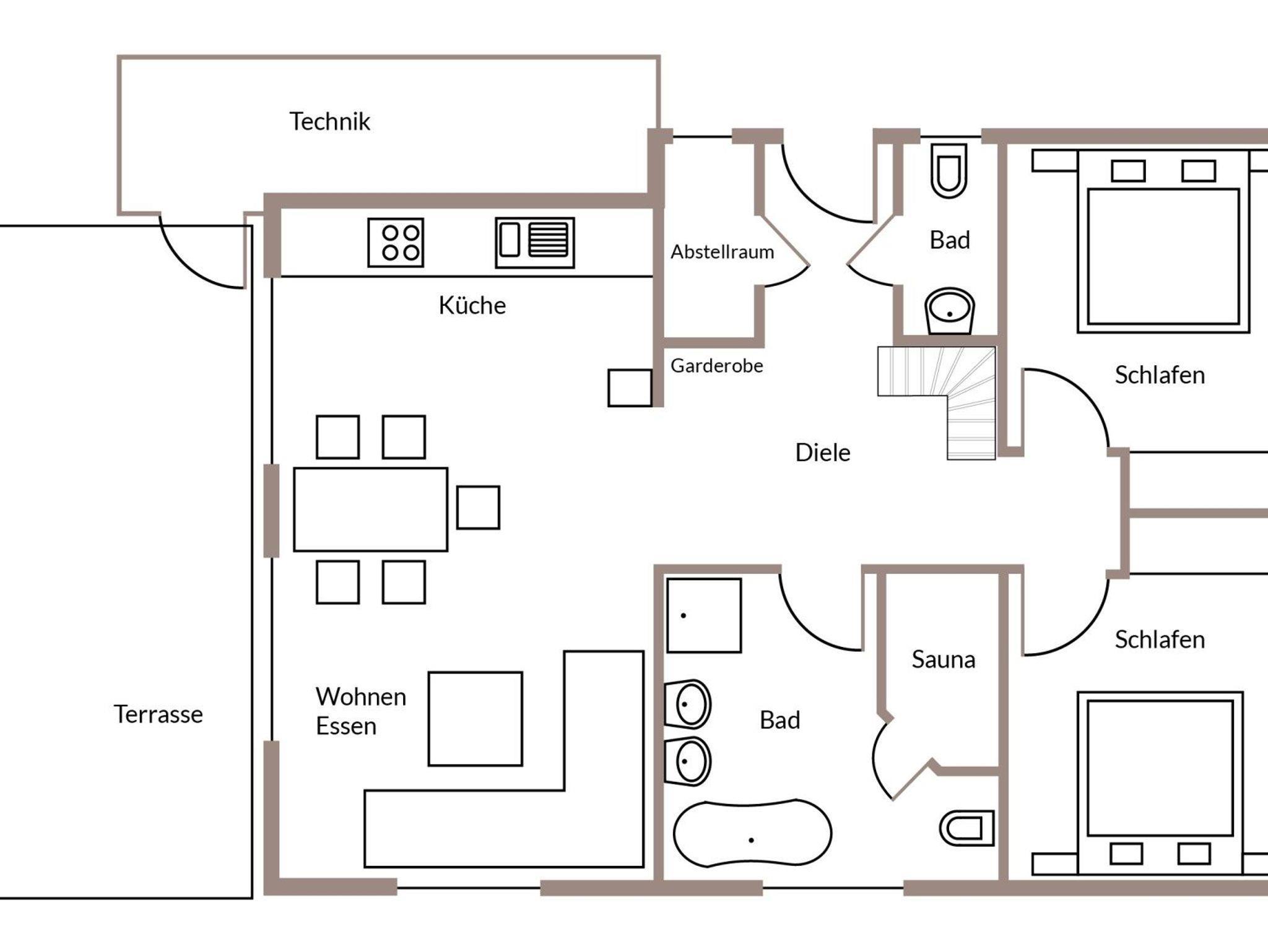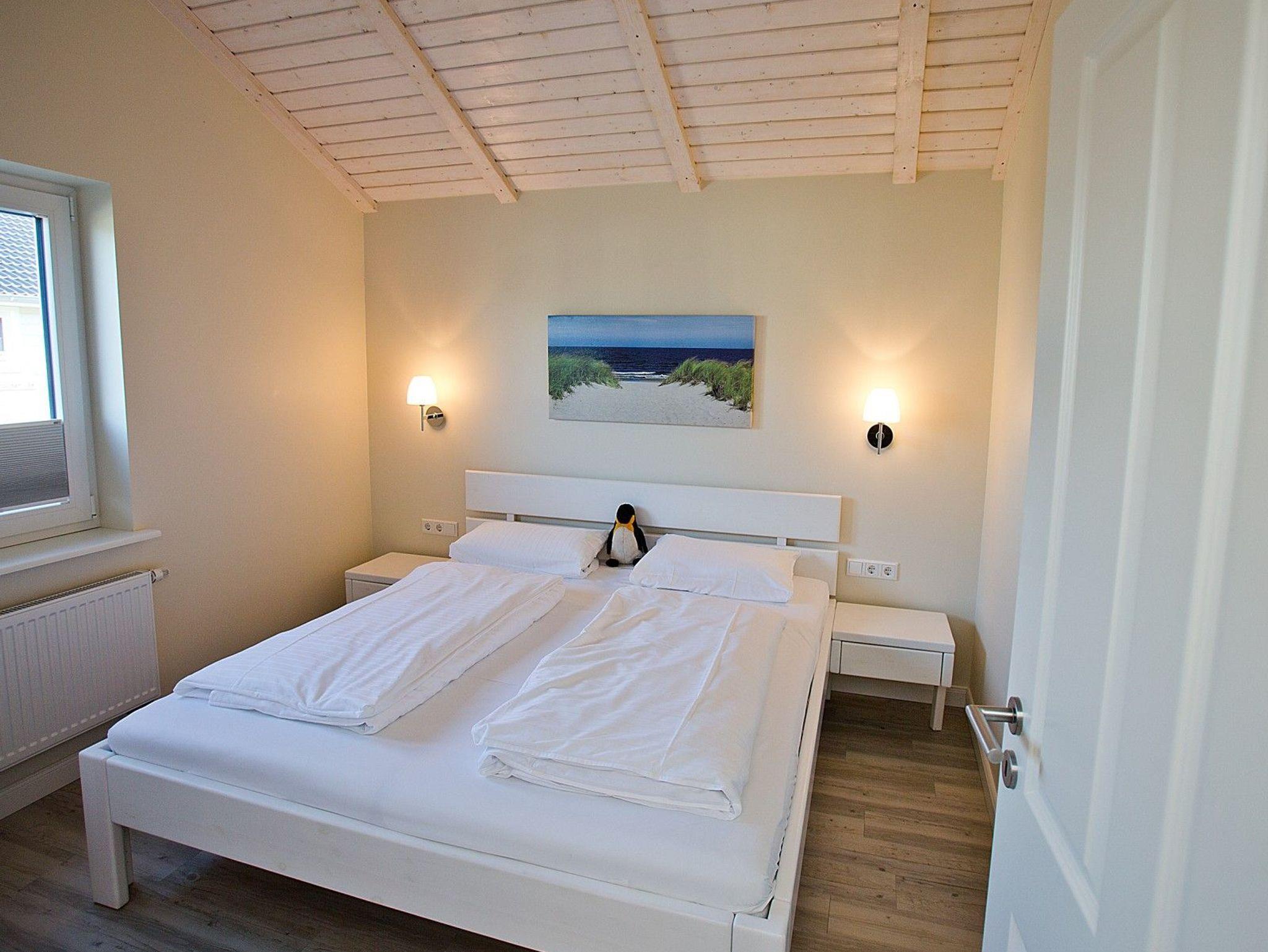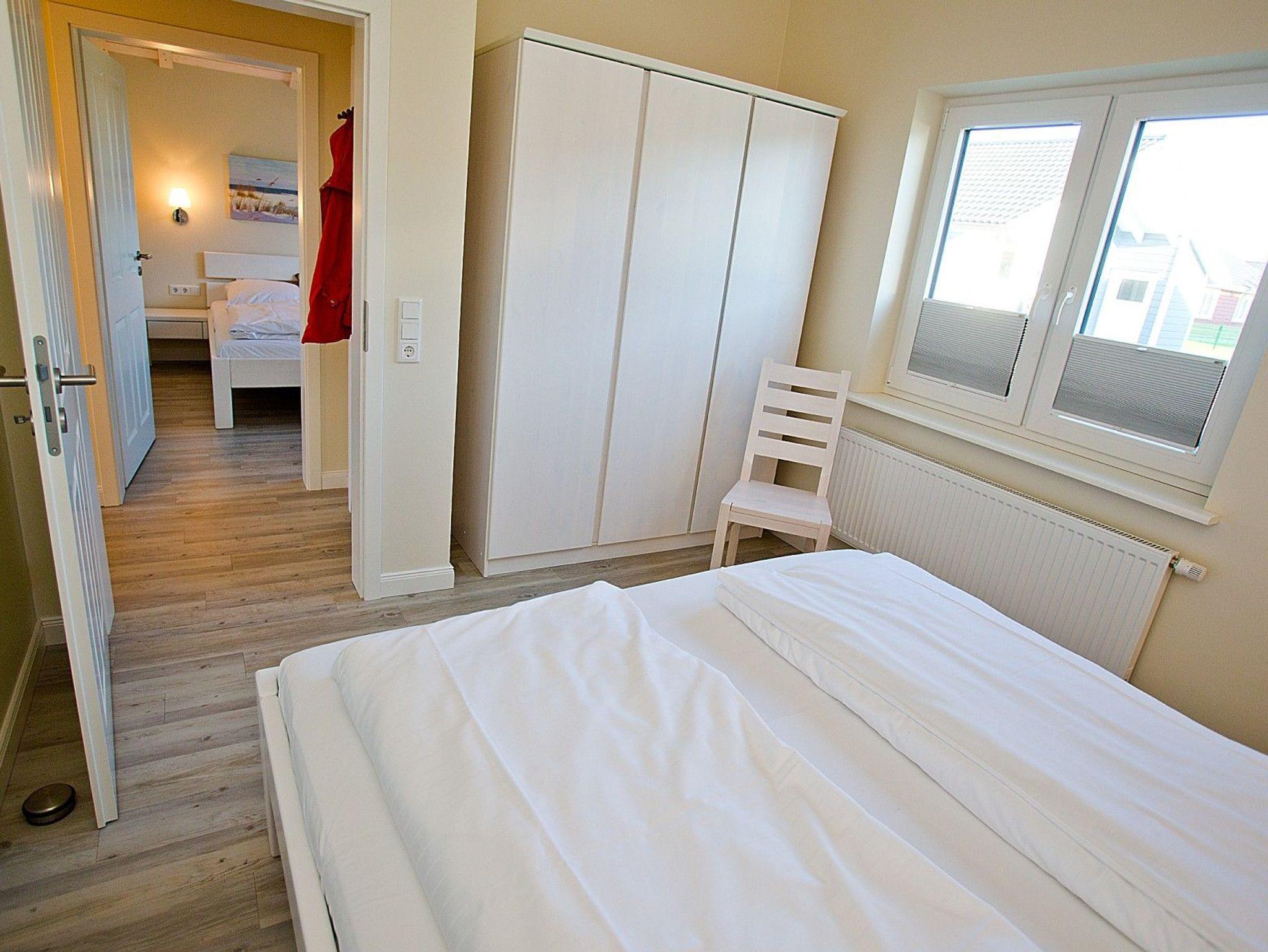 Der offene Wohn-, Ess- und Küchenbereich ist lichtdurchflutet und führt direkt auf die überdachte Terrasse mit Strandkorb und Grill. Der eingezäunte Garten bietet Privatsphäre und viel Raum zum Entspannen. Zwei Schlafzimmer mit Doppelbetten sorgen für erholsame Nächte. Im modernen Bad laden Sauna, Badewanne und eine schwellenlose Dusche zum Wohlfühlen ein, ein zusätzliches WC ergänzt die Ausstattung.