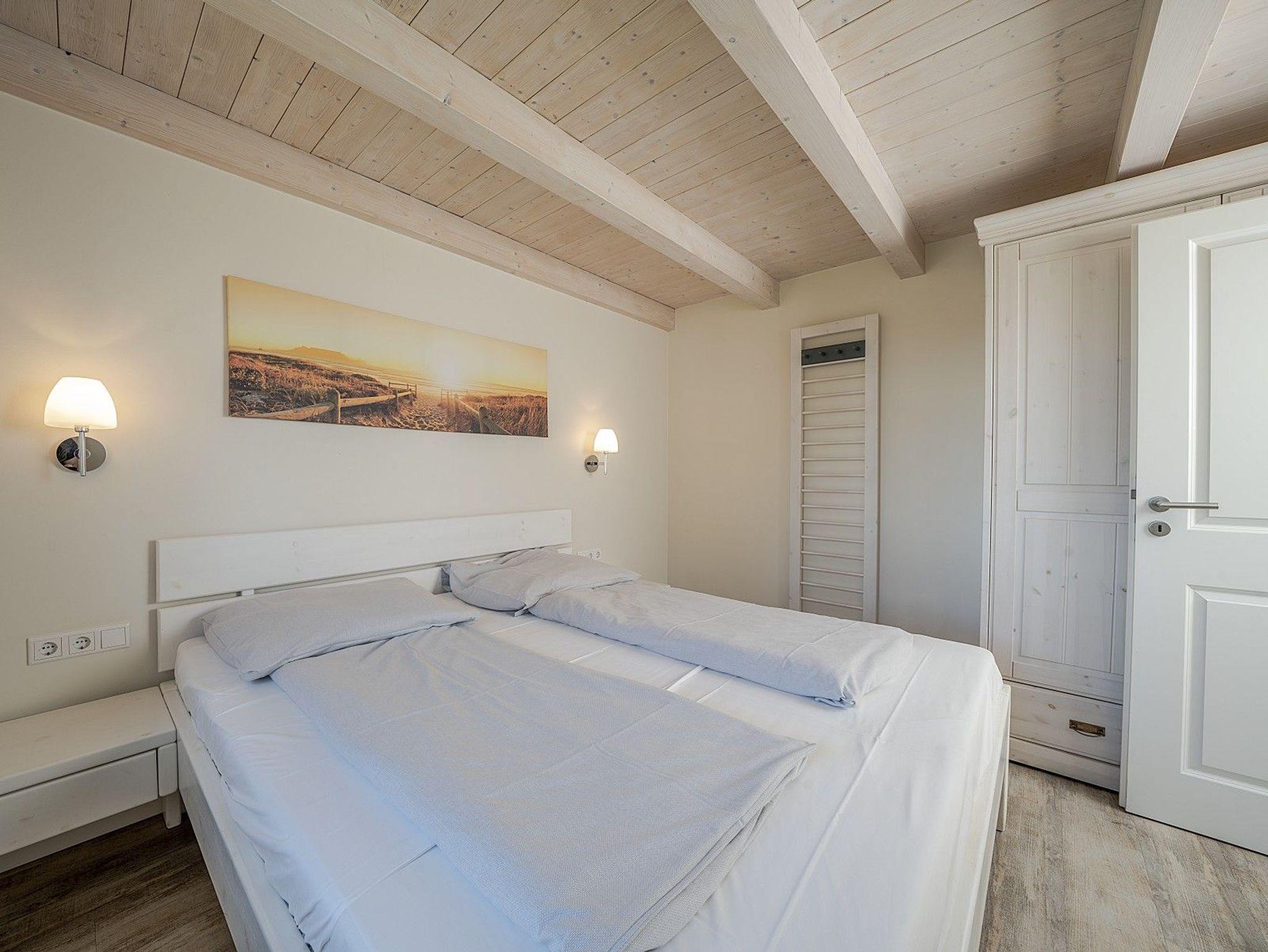 Die 50 m² große, helle Doppelhaushälfte eignet sich ideal für Paare oder Alleinreisende, die Ruhe, Komfort und die Nähe zum Meer suchen. Der offene Wohn- und Essbereich verfügt über eine voll ausgestattete Küche, einen Essplatz sowie eine Sofaecke mit Kaminofen für gemütliche Abende. Das Schlafzimmer ist mit einem Doppelbett ausgestattet, im Badezimmer sorgt die Fußbodenheizung für angenehme Wärme.