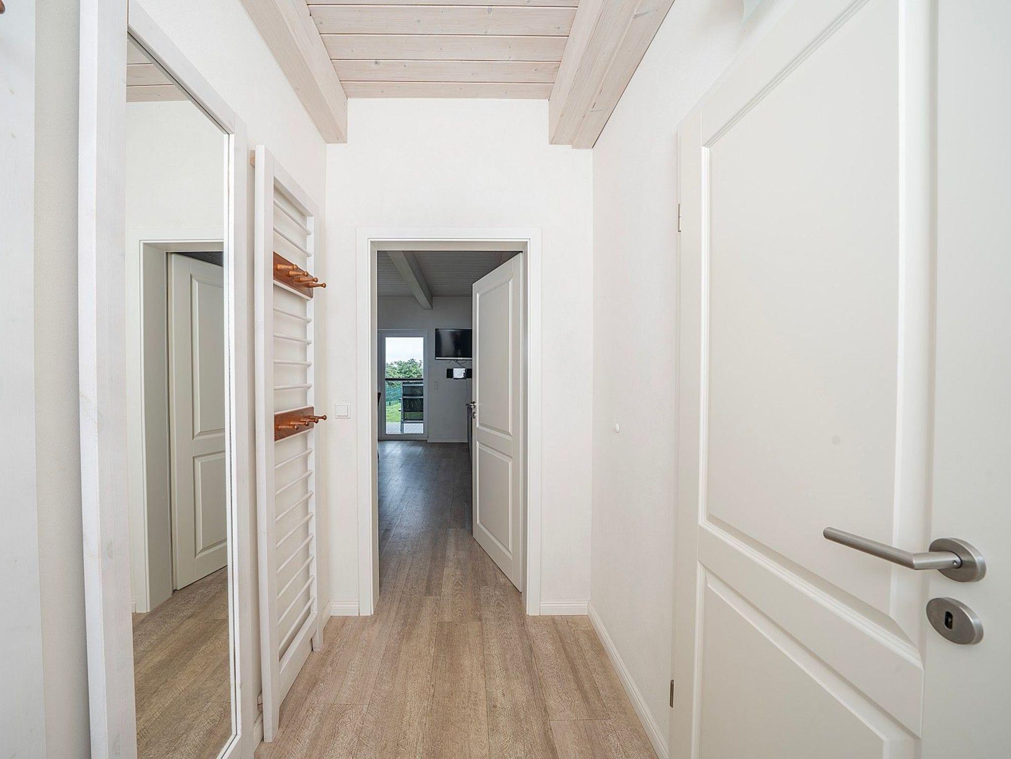 Im Obergeschoss befindet sich das Wellnessbad mit großzügiger Sauna und einer XXL-Badewanne für zwei Personen. Ein weiteres Bad im Erdgeschoss ist barrierearm gestaltet und mit einer bodengleichen Dusche ausgestattet. Dort liegt auch ein Einzelzimmer mit 1,20 m breitem Komfortbett, während im Obergeschoss zwei weitere Schlafzimmer mit Doppelbetten zur Verfügung stehen.