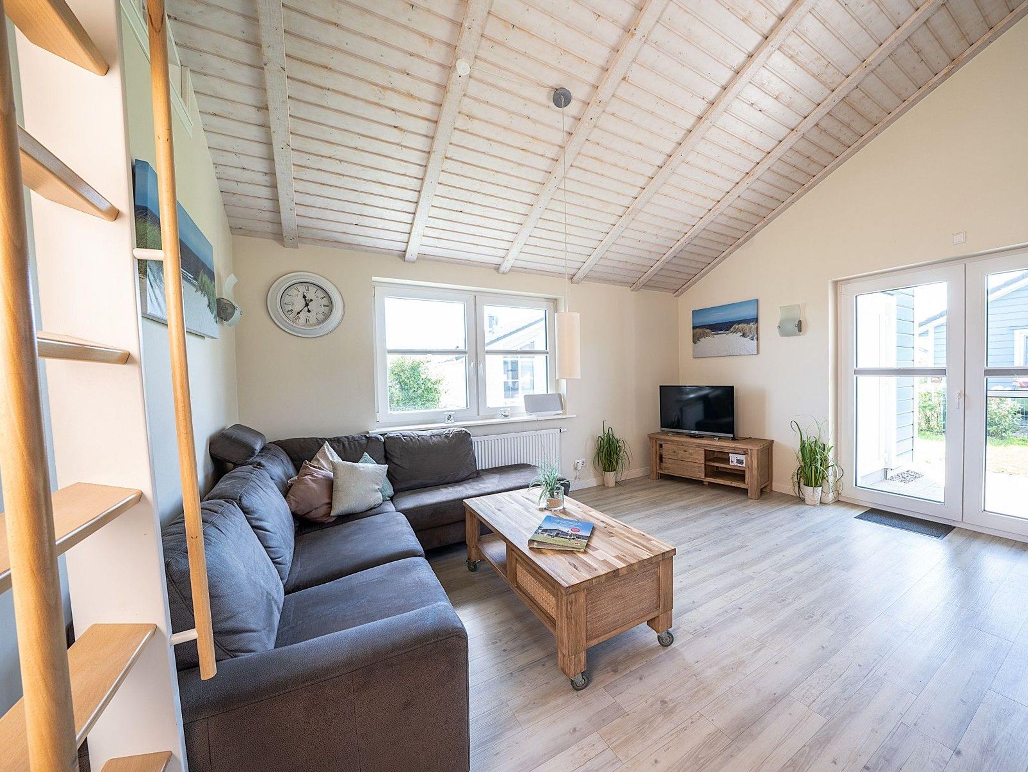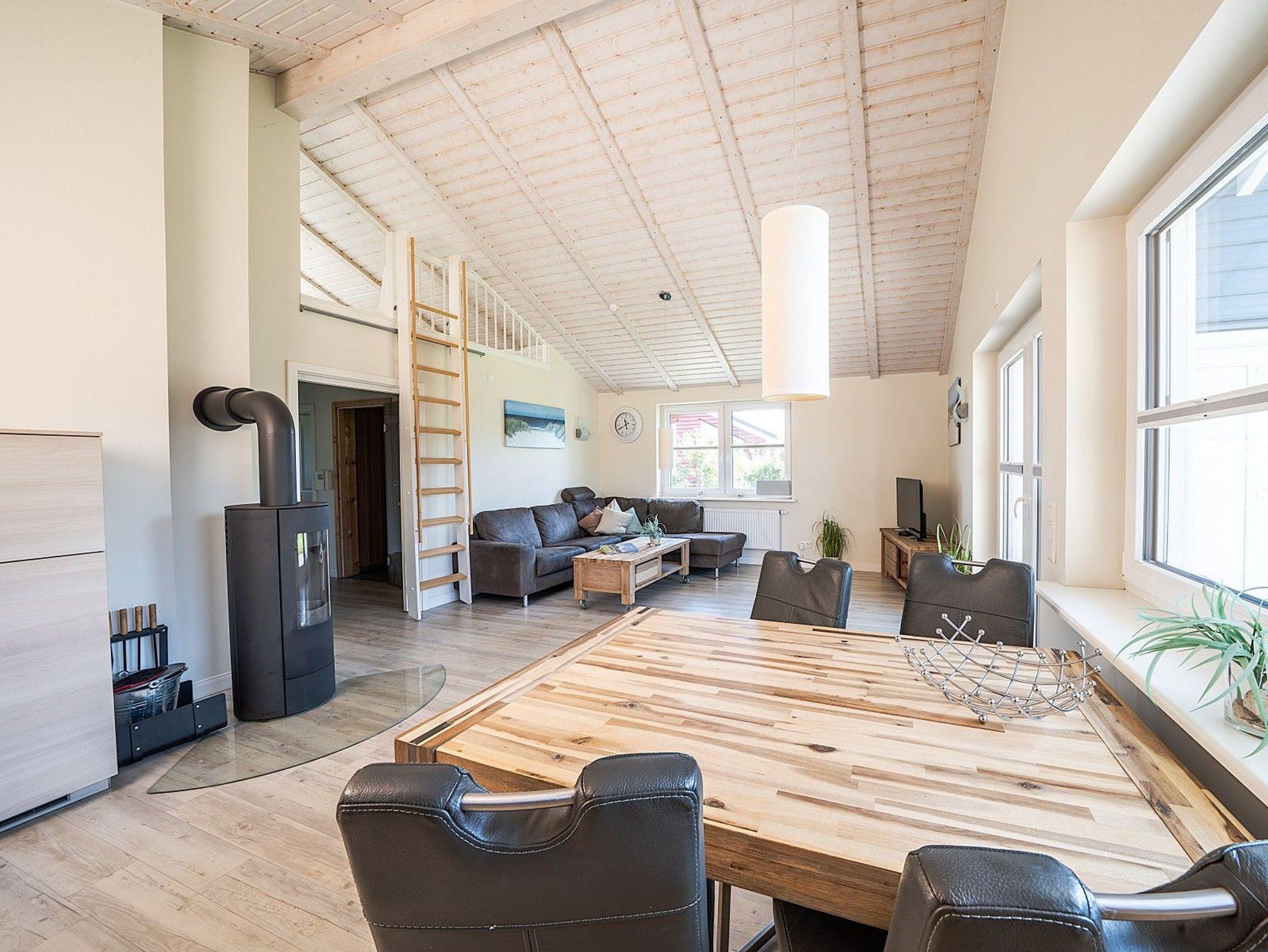Der Wohnbereich mit Kaminofen und offener Küche bildet das Herz des Hauses. Zwei Schlafzimmer mit Doppelbetten bieten erholsame Ruhe, während die Terrasse mit Strandkorb, Grill und Gartenmöbeln zu entspannten Stunden im Freien einlädt. WLAN, TV und eine Waschmaschine sind vorhanden, ebenso eine abschaltbare Steckdose zum Laden von E-Bikes.