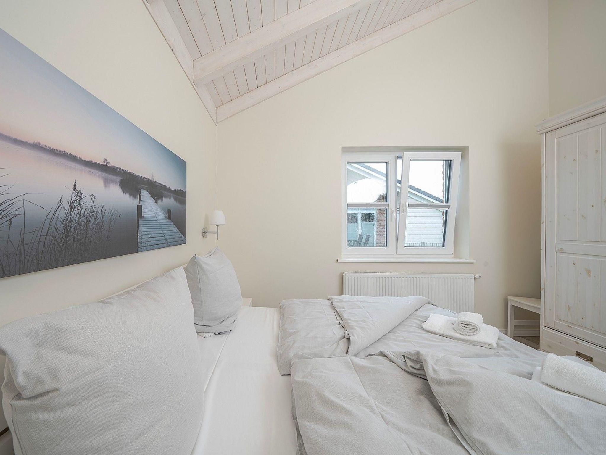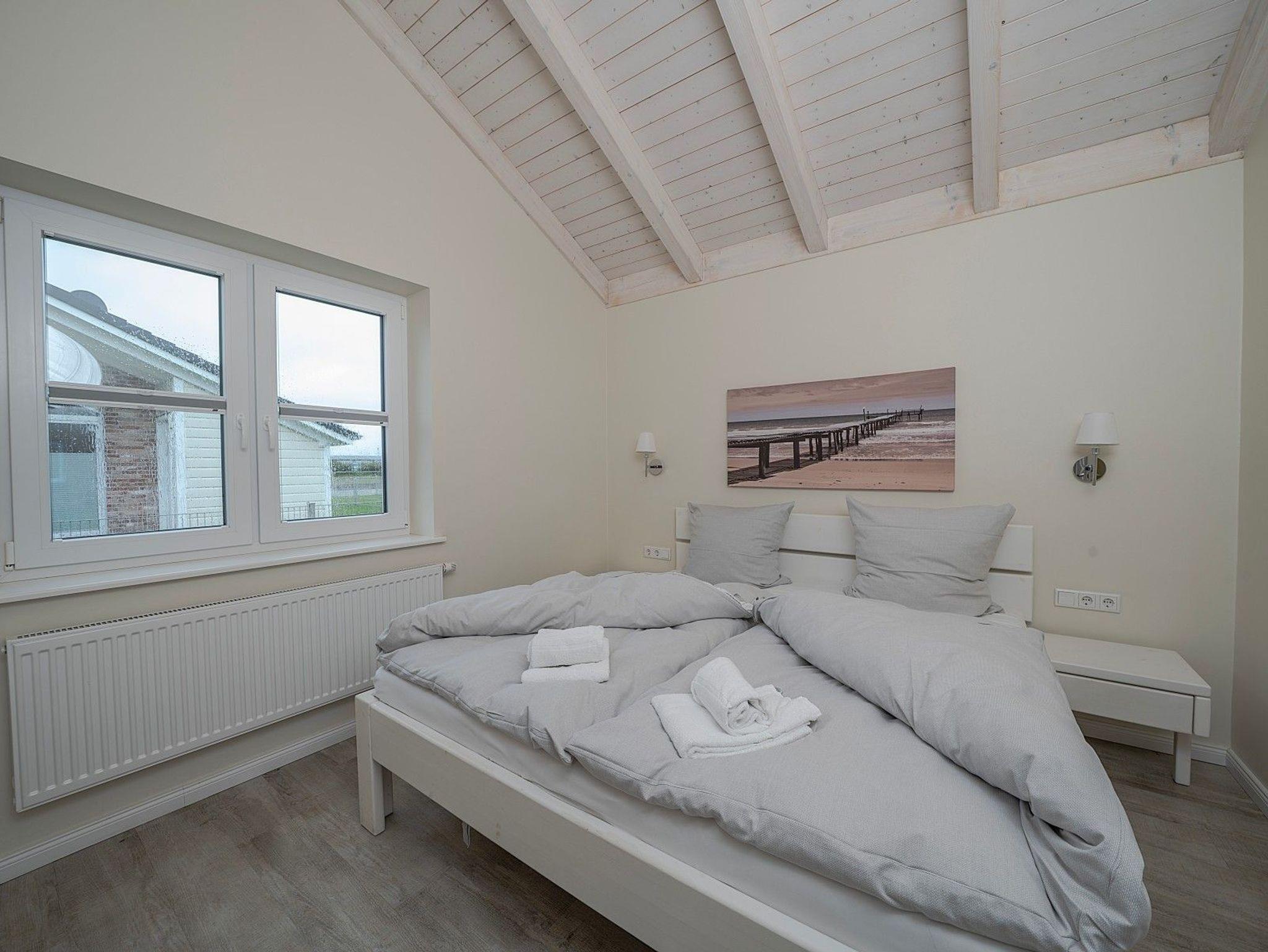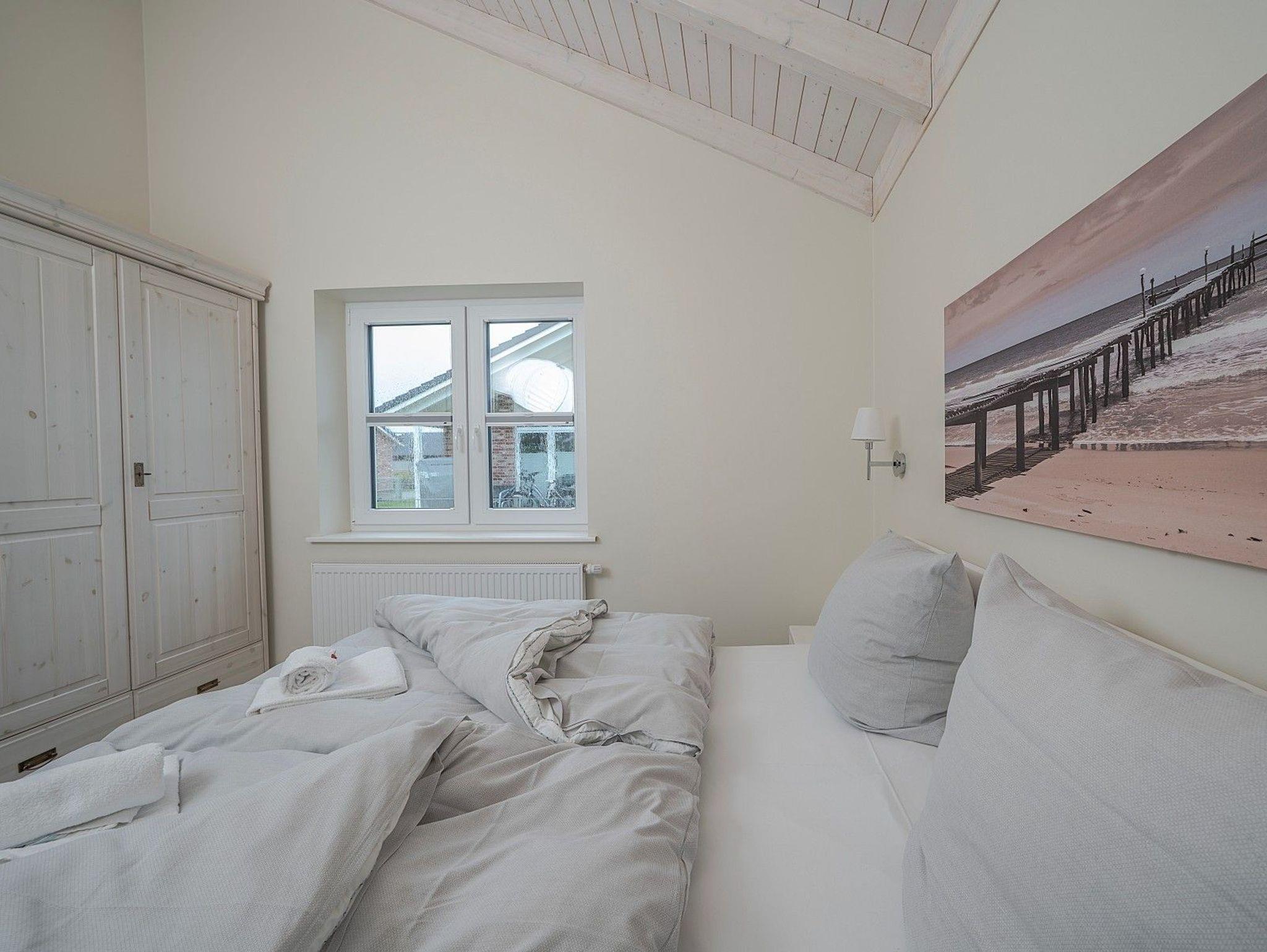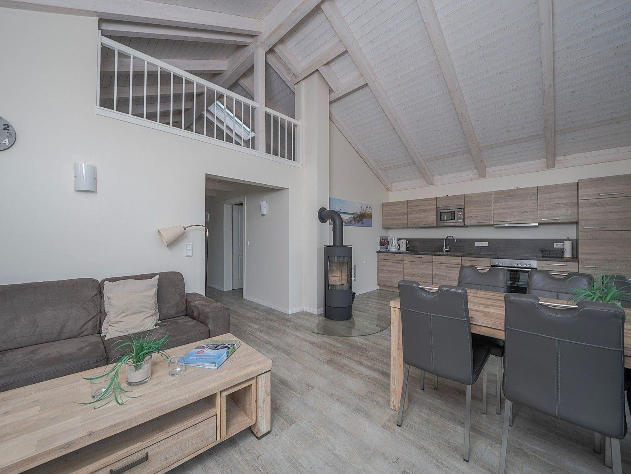 Zwei Doppelzimmer, ein stilvolles Bad mit Dusche und Badewanne sowie ein heller Wohn- und Essbereich mit Kaminofen schaffen eine behagliche Atmosphäre. Für Wellnessmomente steht Ihnen die hauseigene Sauna zur Verfügung. Von April bis September können Sie zusätzlich im eigenen Strandkorb auf der Terrasse entspannen.